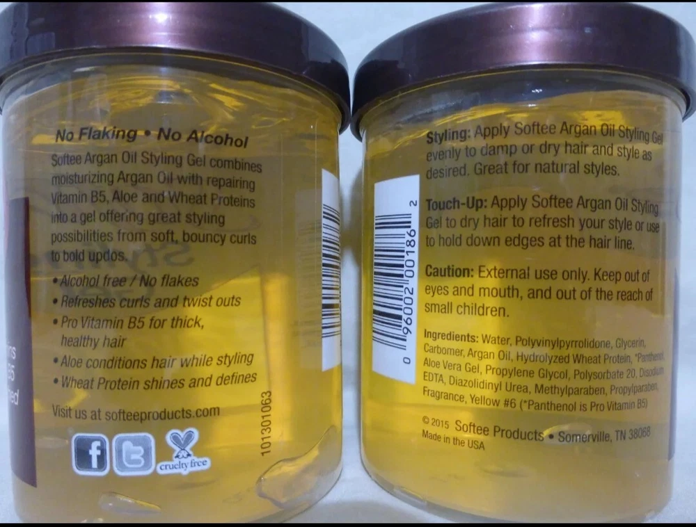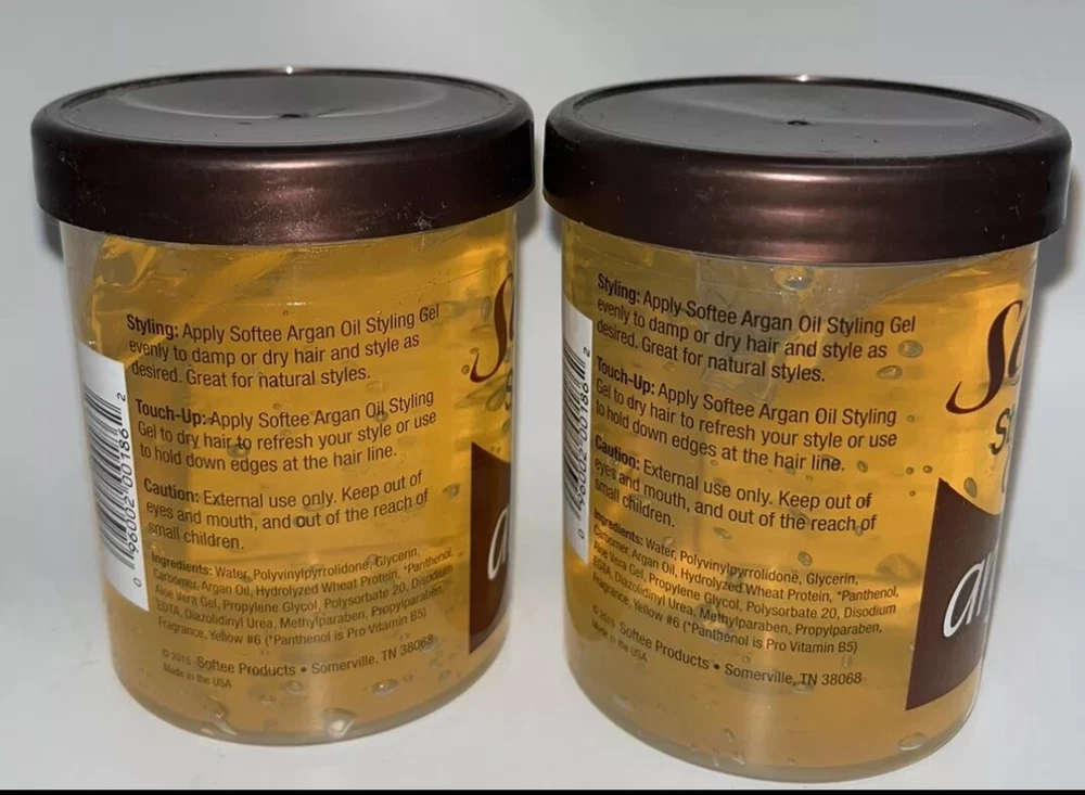 2 Softee Styling Gel Argan Oil 8 oz Product Details : Condition, invigorate, and protect your hair and scalp! Argon oil helps styling while replenishing the scalp's natural oils. Use daily as needed. Great for home, salons. Specifications Case Quantity: 2 Pack Assortment Details: 8-oz. Jars Softee® Argan Oil Styling Gel Brand: Softee® Weight: 2 Softee Styling Gel Argan Oil 8 Oz Condition is New/ Condicion nuevo Shipped with USPS First Class Package. We speak Spanish/Nosotros hablamos español