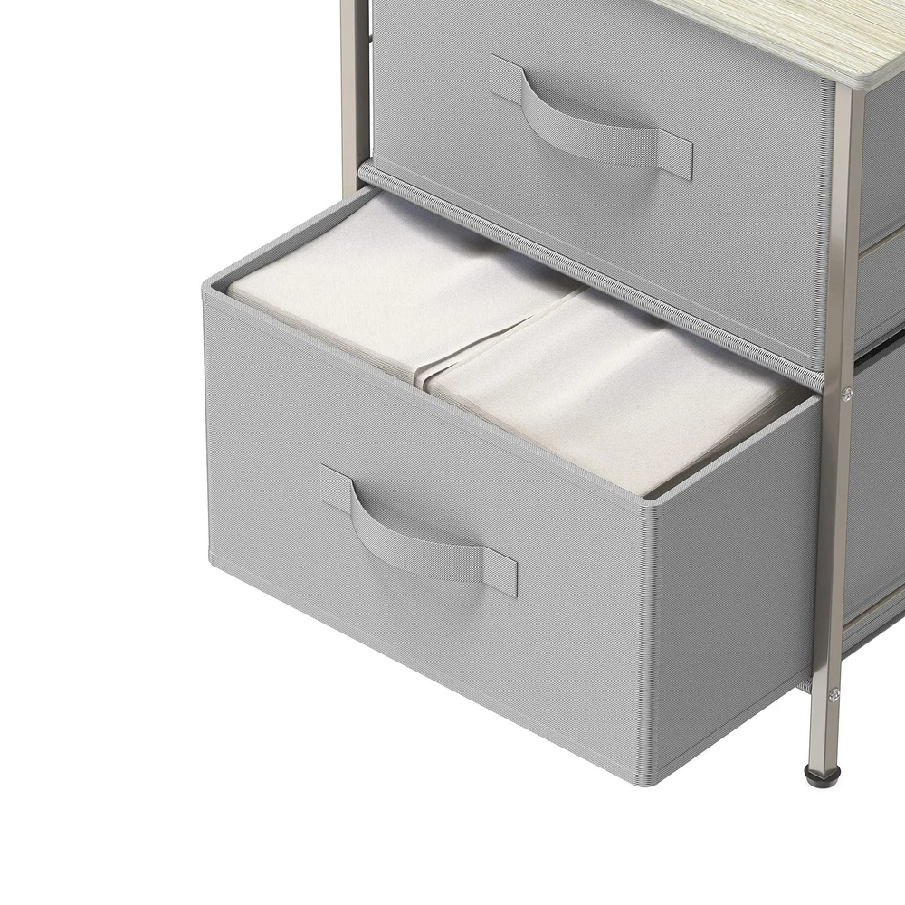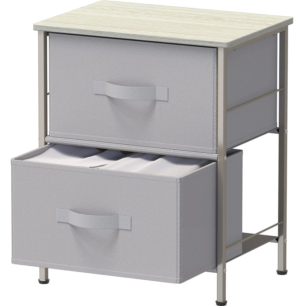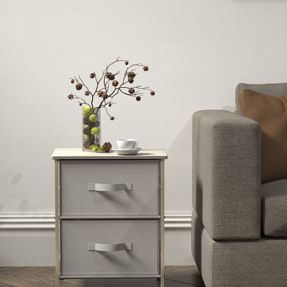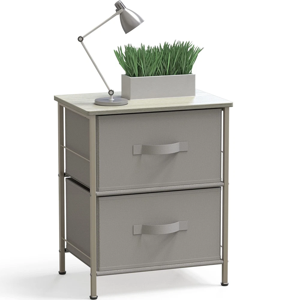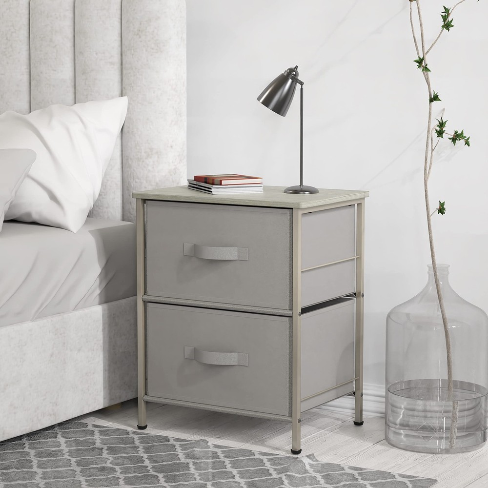 2 Tier Night Stands Dresser for Bedroom Organizer Drawer Storage Tower, Grey 2-Tier Shelf Dresser with 2 Collapsible Baskets Bin. Free-Standing Design for bedroom night stand / closet clothes storage furniture Sturdy Metal Frame Construction with Classic Bronze Coating. Durable MDF Wood Top for your bedroom items such as lamps, books and decor. Each Basket has 5 heavy cardboards (include bottom side) support each side Dimension: 16.75" D x 11.8'' W x 20.5" H