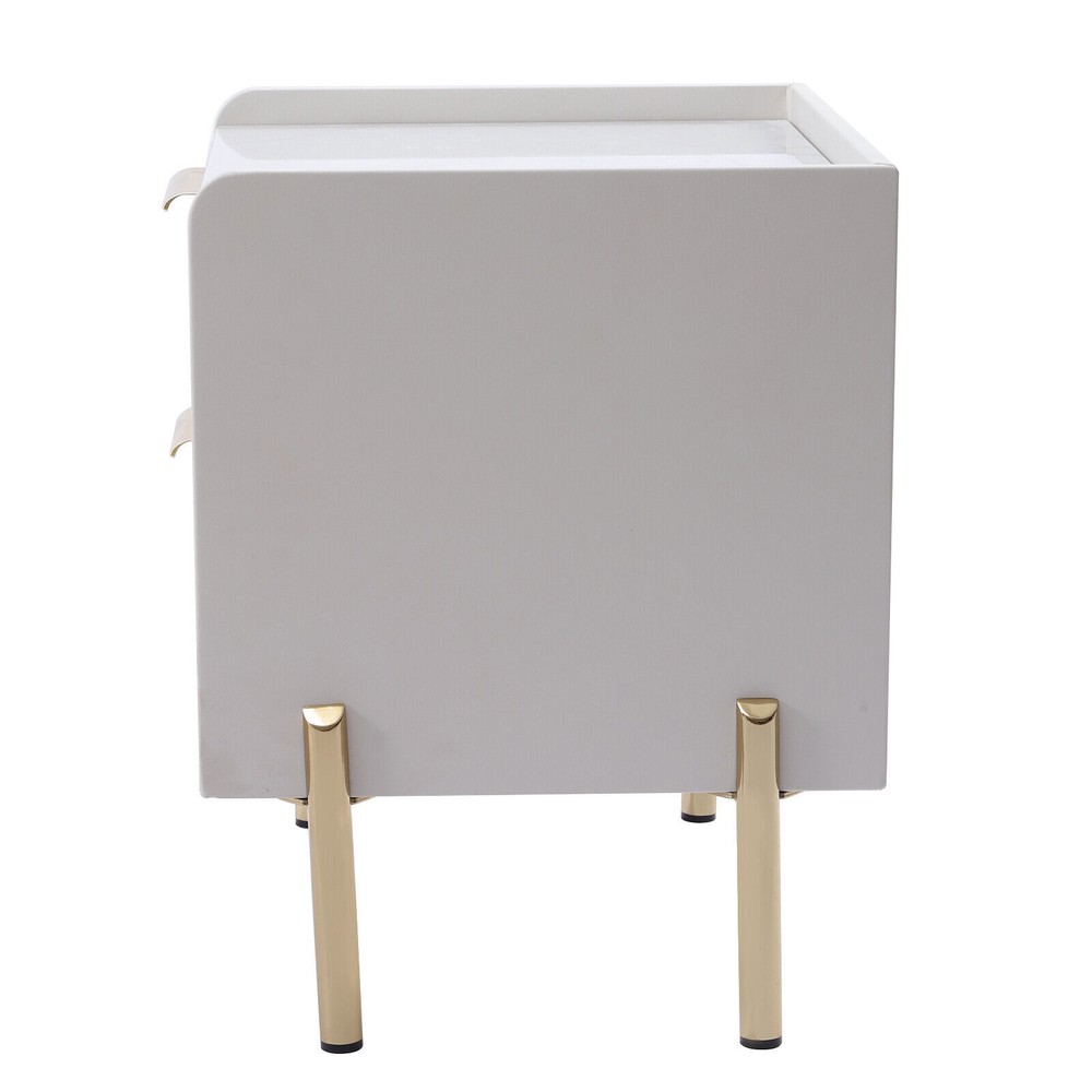 DESCRIPTION 【For rooms】Overall Dimensions of Table:17.7" L x 15.7" W x 20.5" H, It strikes a clean-lined rectangular silhouette.It offers you enough space for your various things. 【Versatile use】This bedside table is versatile. Whether as a coffee table, end table, beside table or console table, it is a space-saving storage table. In addition, its elegant style will give modern accents to beautify your room. 【Smart storage】This modern two-drawer nightstand provides a storage solution for remotes,your favorite books, keepsakes, glasses, and other necessaries at hand. The tabletop is perfect for displaying a lamp, clock, potted plant or photo frame to offer warmth and personalized decoration. 【No assembly required】You only need to simply install four table legs, saving you valuable time and effort. Enjoy a clean and tidy bedroom now. Describe: Product Dimensions: 17.7" L x 15.7" W x 20.5" H Material: Metal+MDF+glass+artificial leather Color: white + gold You only need to simply install four table legs, saving you valuable time and effort. Enjoy a clean and tidy bedroom now. Versatile and modern, leather, metal, glass are paired to create a modern, minimalist vibe. Smart storage, this two-drawer nightstand provides a storage solution for remotes, your favorite books, keepsakes, glasses and other necessaries at hand. Best for decorating,the tabletop is perfect for displaying a lamp, clock, potted plant or photo frame to offer warmth and personalized decoration. On Mar 2, 2025 at 21:29:37 PST, seller added the following information: