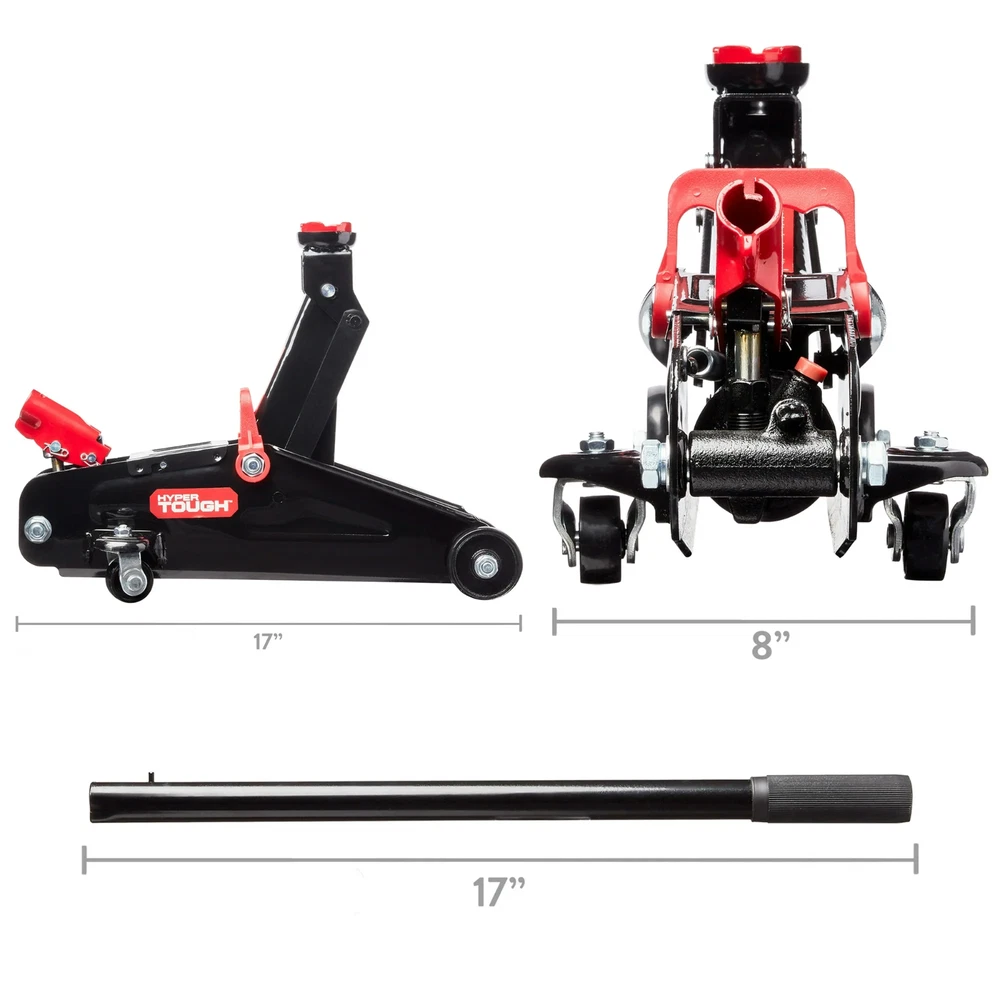 2 Ton Trolley Jack Floor Lift Car Truck Tire Change Portable Heavy Duty Garage The Hyper Tough 2-Ton Trolley Jack is a must-have accessory for all automobile owners so you can change tires or perform other vehicle maintenance with ease. With its heavy-duty steel construction, it has the strength to lift a wide range of makes and models, and the built-in safety valve protects against jack over-loading. This trolley jack features a minimum lifting height of 5-1/8" and a maximum height of 13", which is ideal for most cars, and a maximum load weight of 2 tons (4000 pounds). The swivel saddle provides smooth maneuvering and positioning while the over-pump bypass valve lets off excess pressure. The rear casters of this 2-ton trolley jack provide smooth maneuvering and positioning. It also features a lifting handle that detaches for transport and storage and a carrying handle for portability and for keeping it in your vehicle's trunk or in your garage, so you can be prepared at all times. Make vehicle maintenance easier with the Hyper Tough 2-Ton Trolley Jack. Hyper Tough helps get the job done. Whether you're new to home improvement or a DIY guru, Hyper Tough offers an assortment of affordable and reliable tools to help complete your projects. From power tools and hand tool sets to shelves and storage cases, Walmart.com has everything you need to tackle all your projects at Every Day Low Prices. Hyper Tough 2-Ton Trolley Jack Maximum loading weight: 2 tons (1814.3KG) Lifting range: 5-1/8" to 13" Heavy-duty steel construction provides stability and endurance Swivel saddle provides smooth maneuvering and positioning Carry handle for convenient transportation Rear casters provide smooth maneuvering and positioning Built-in safety valve protects against jack over-loading Hydraulic oil by-pass system protects ram from being over-extended