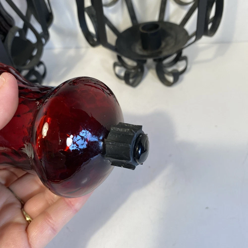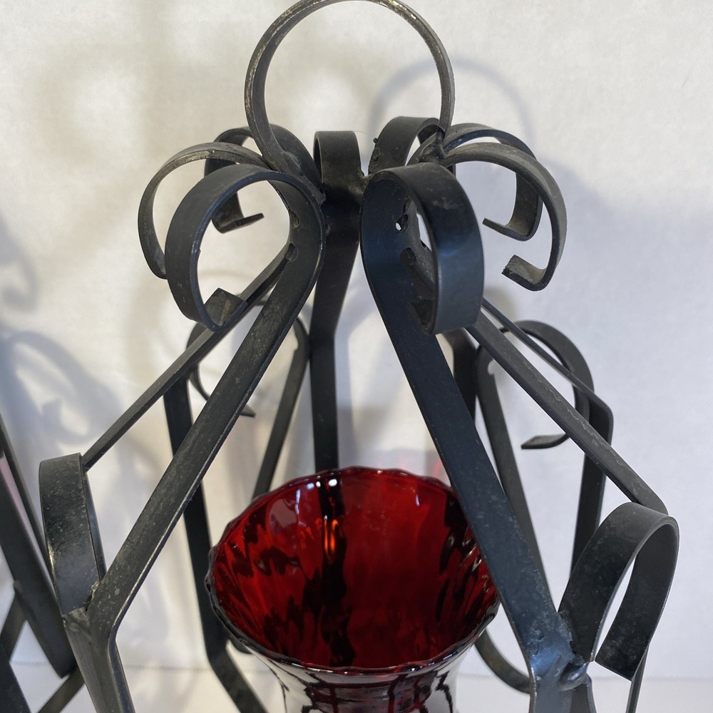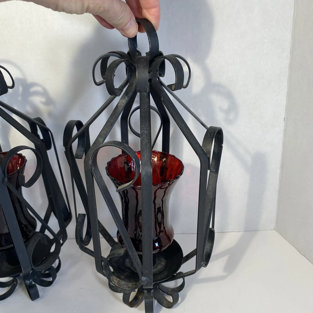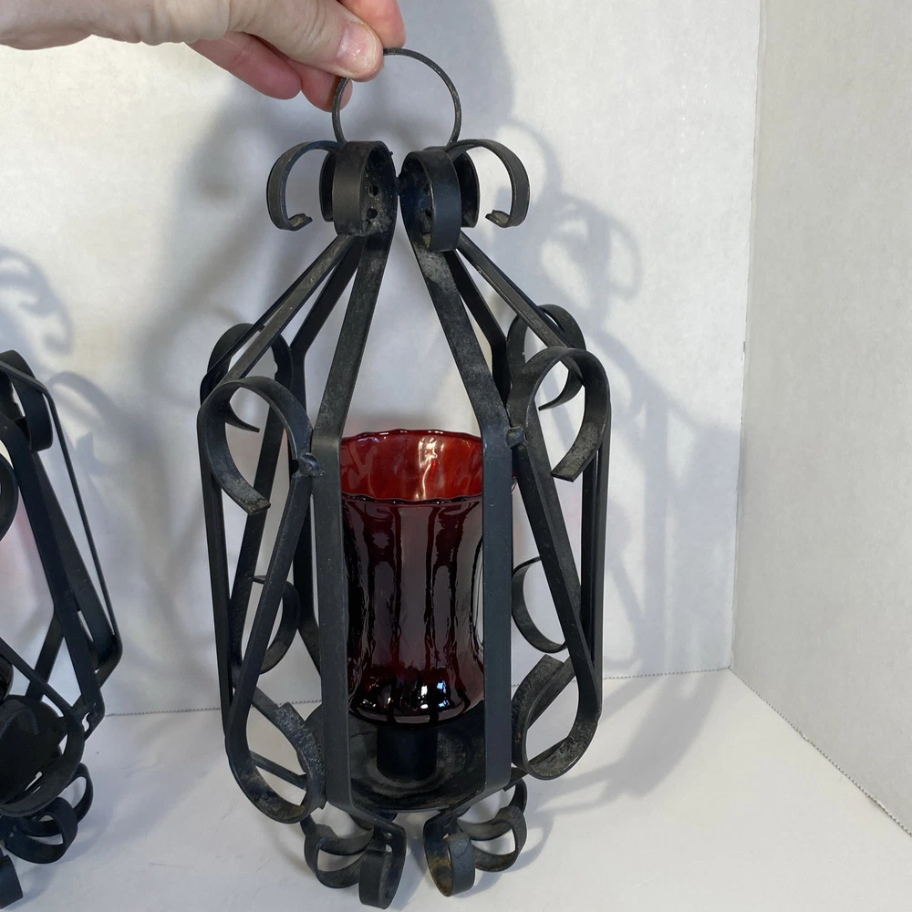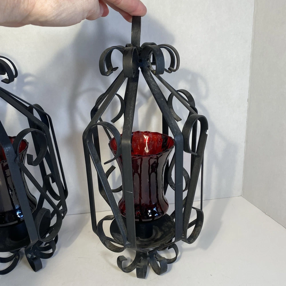 Great vintage find. Set of two black wrought iron Spanish hanging lanterns candleholders. Both have red Peg votives with grommets. Votives are in excellent condition, no chips or cracks. Wrought iron lanterns are in good condition with some patina. Please see pics carefully. All measurements are in pictures. Ships the next business day after payment.😊