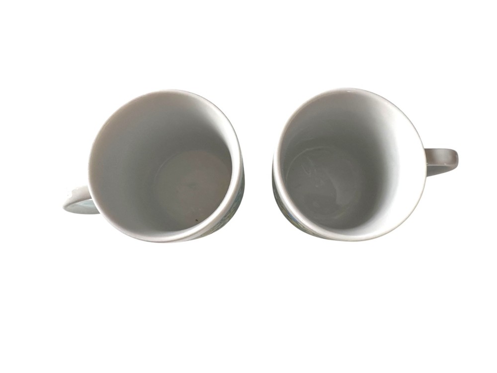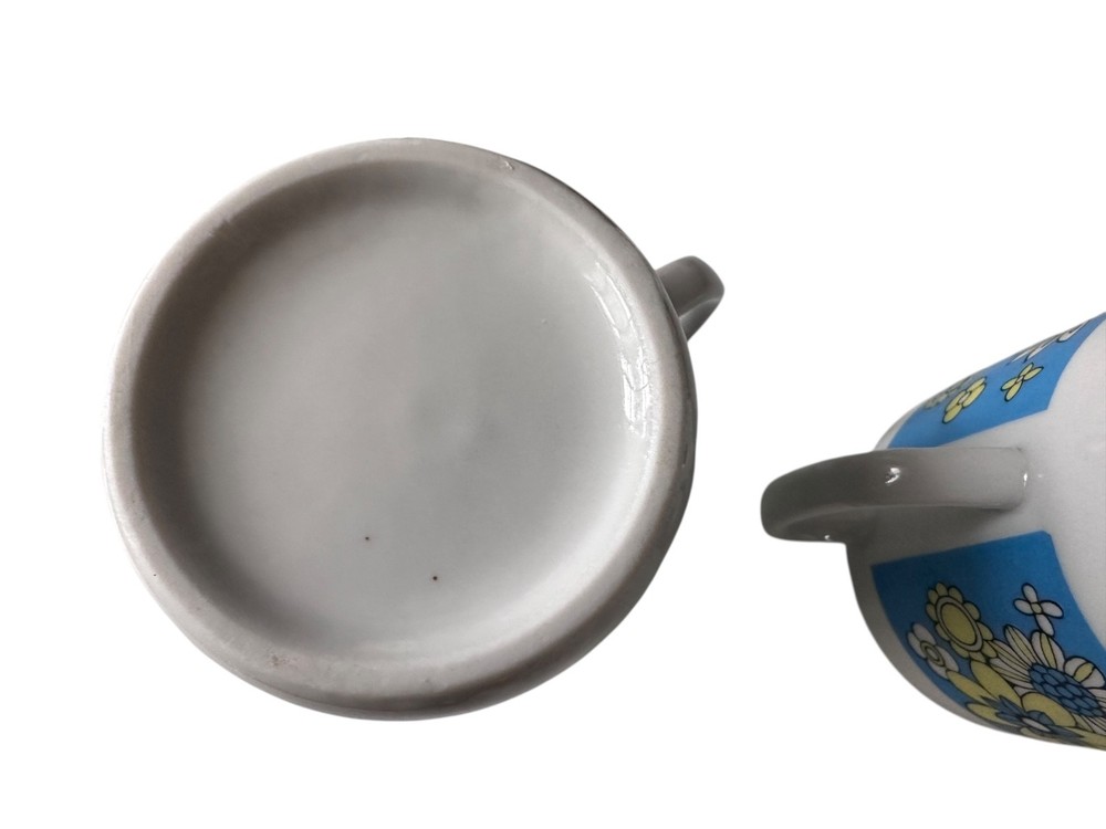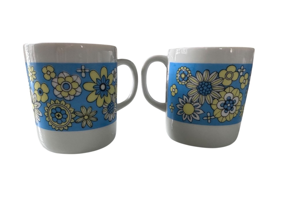 Add a burst of cheerful retro style to your morning routine with this pair of vintage 1970s floral coffee mugs. Featuring a bright band of mod daisies in blue, yellow, and white, these nostalgic mugs perfectly capture the flower power energy of the mid-century kitchen era. ☕ Item Details Set of 2 matching mugs 1970s mod floral daisy print on white ceramic Approx. 3.75" tall x 3" diameter Unmarked vintage (likely Japan or USA) Dishwasher safe glaze (hand wash recommended to preserve pattern) Excellent vintage condition — no cracks or chips, minimal wear from age 🌼 Perfect For Retro kitchen or mid-century display Coffee, tea, or hot cocoa mugs Vintage lovers, cottagecore collectors, or nostalgic gift-giving
