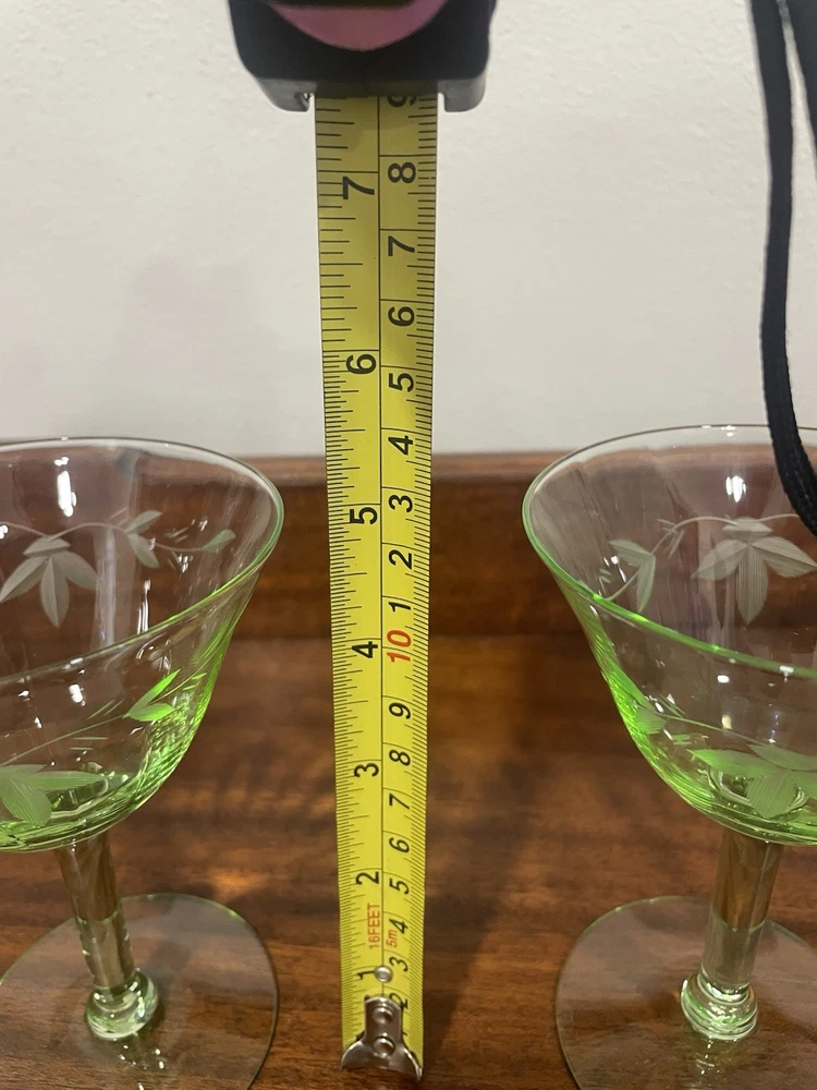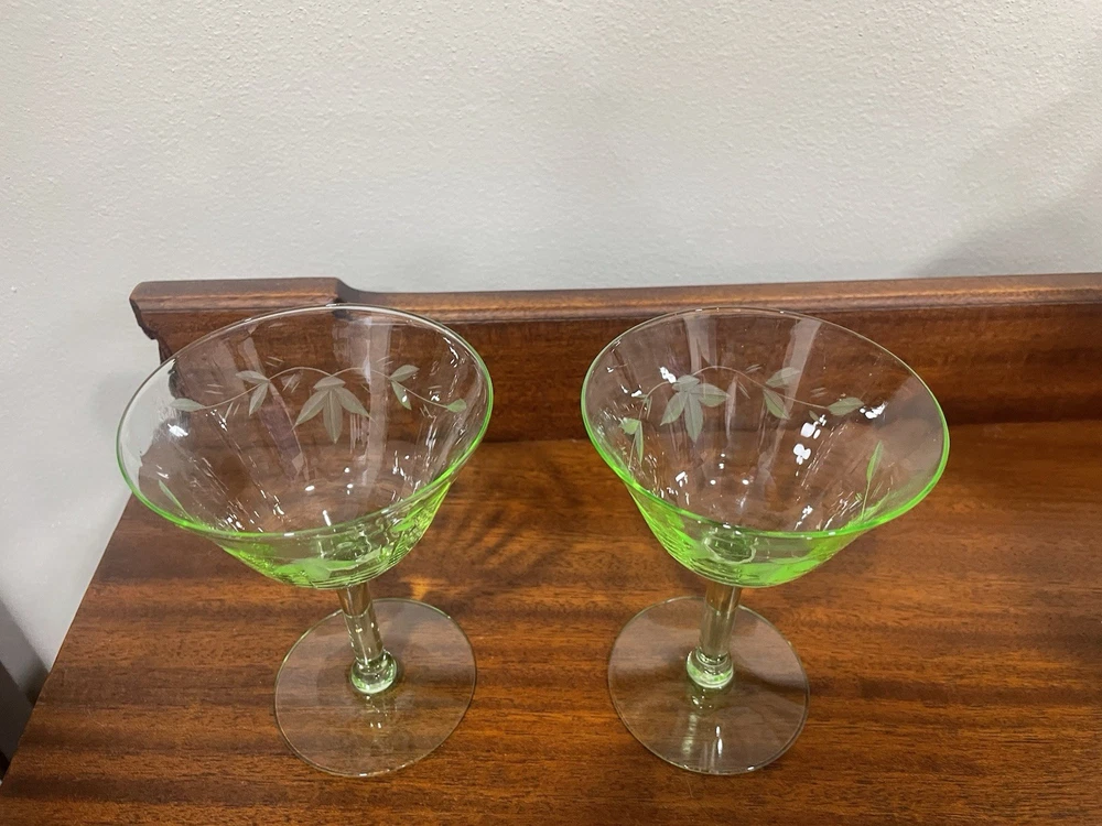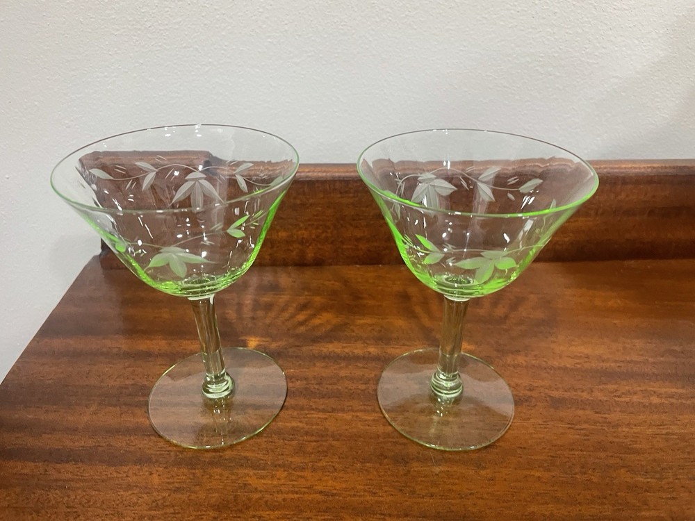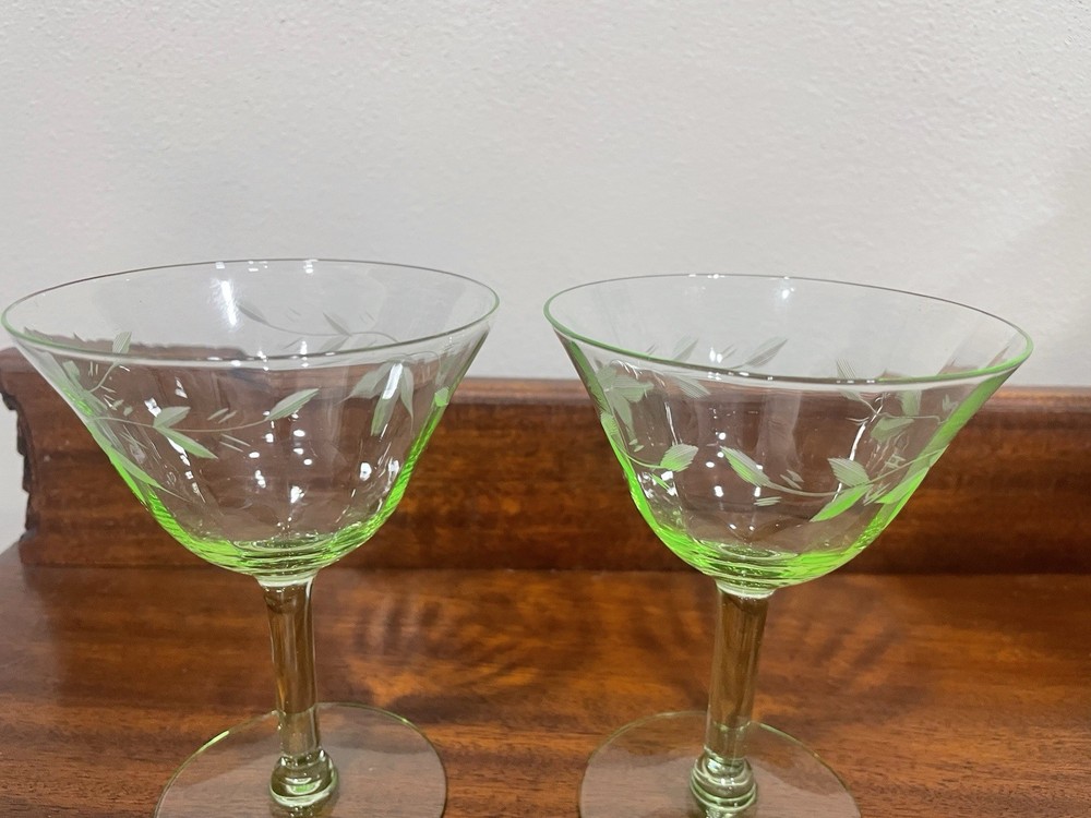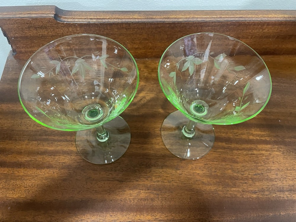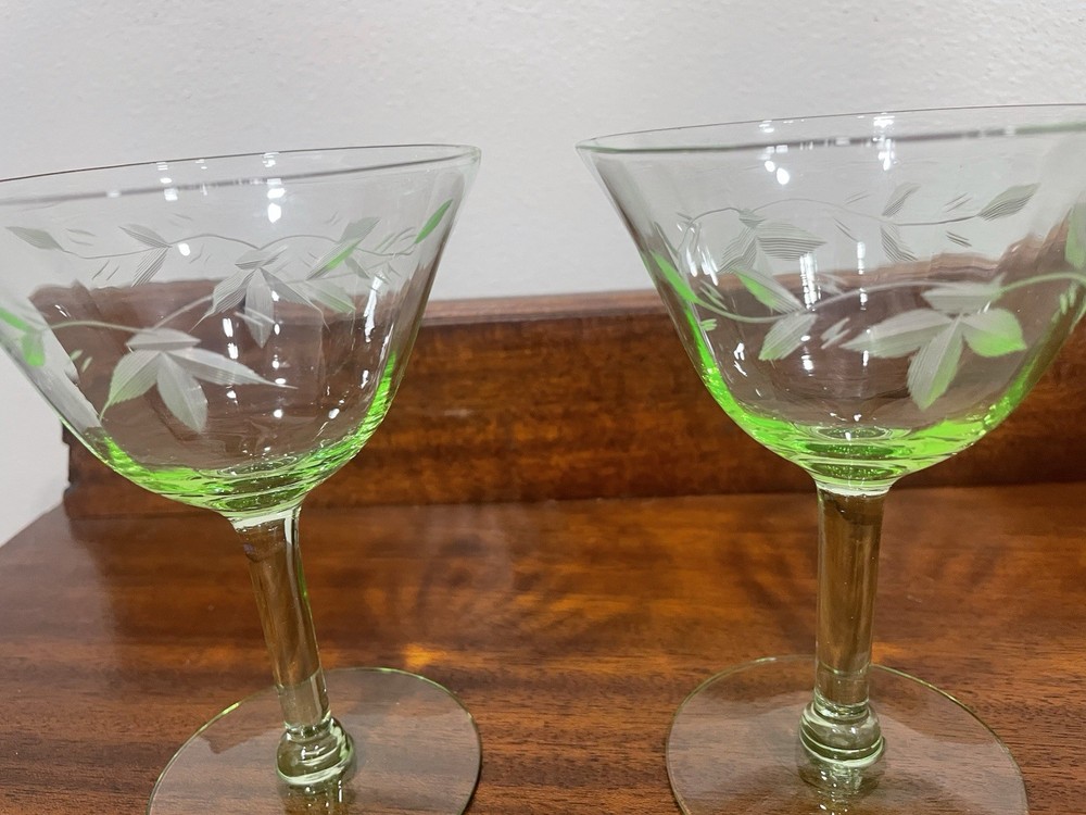 This product is a set of 2 vintage green uranium depression glass wine champagne stems. These etched wine glasses are made of glass and are perfect for serving wine or champagne in style. The brand is vintage, adding a touch of nostalgia to your table setting. The set includes 2 wine glasses, making it ideal for a small gathering or special occasion. The green color adds a unique and elegant touch to your glassware collection.
