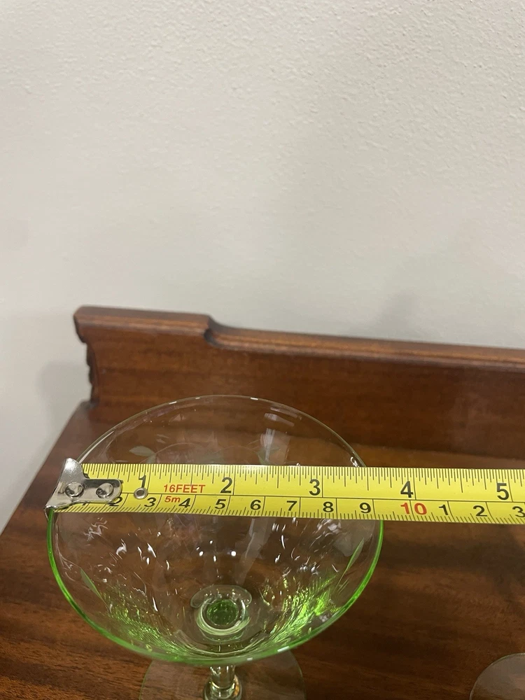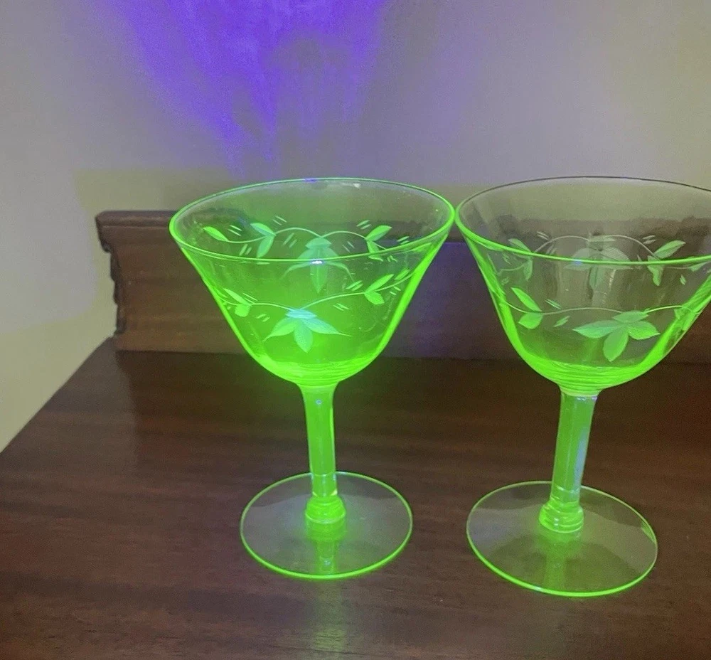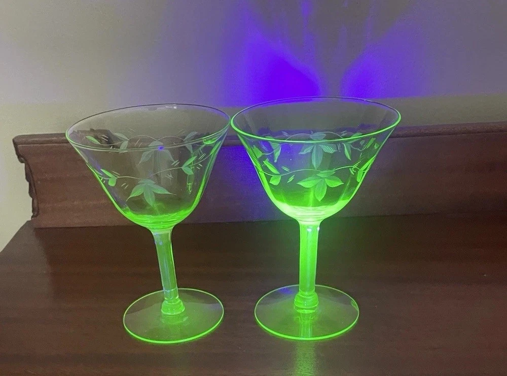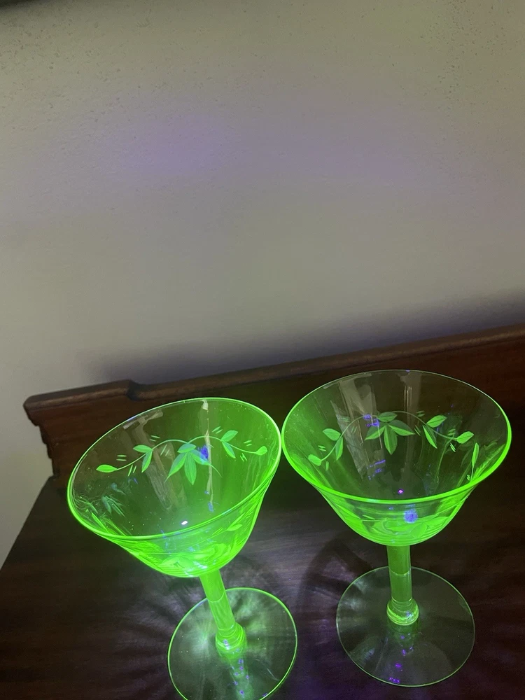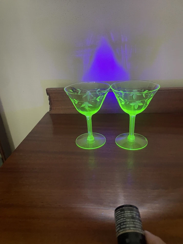 This product is a set of 2 vintage green uranium depression glass wine champagne stems. These etched wine glasses are made of glass and are perfect for serving wine or champagne in style. The brand is vintage, adding a touch of nostalgia to your table setting. The set includes 2 wine glasses, making it ideal for a small gathering or special occasion. The green color adds a unique and elegant touch to your glassware collection.