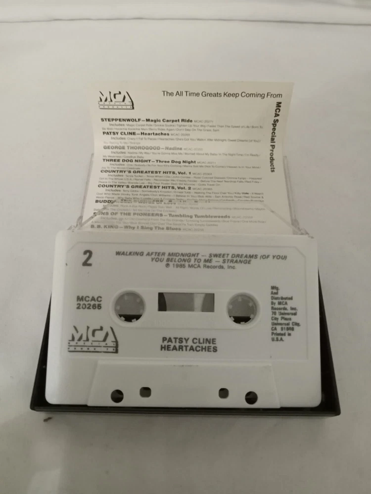 Vintage Patsy Cline cassette tapes, lot of 2. Heartaches, case is ok with minor scuffing inlay is good and tape is in good condition with no damage cat# MCAC 20265 16 Best of Patsy Cline, case has very minor scuffing, inlay is fine and tape is in good condition, cat# PLC 408