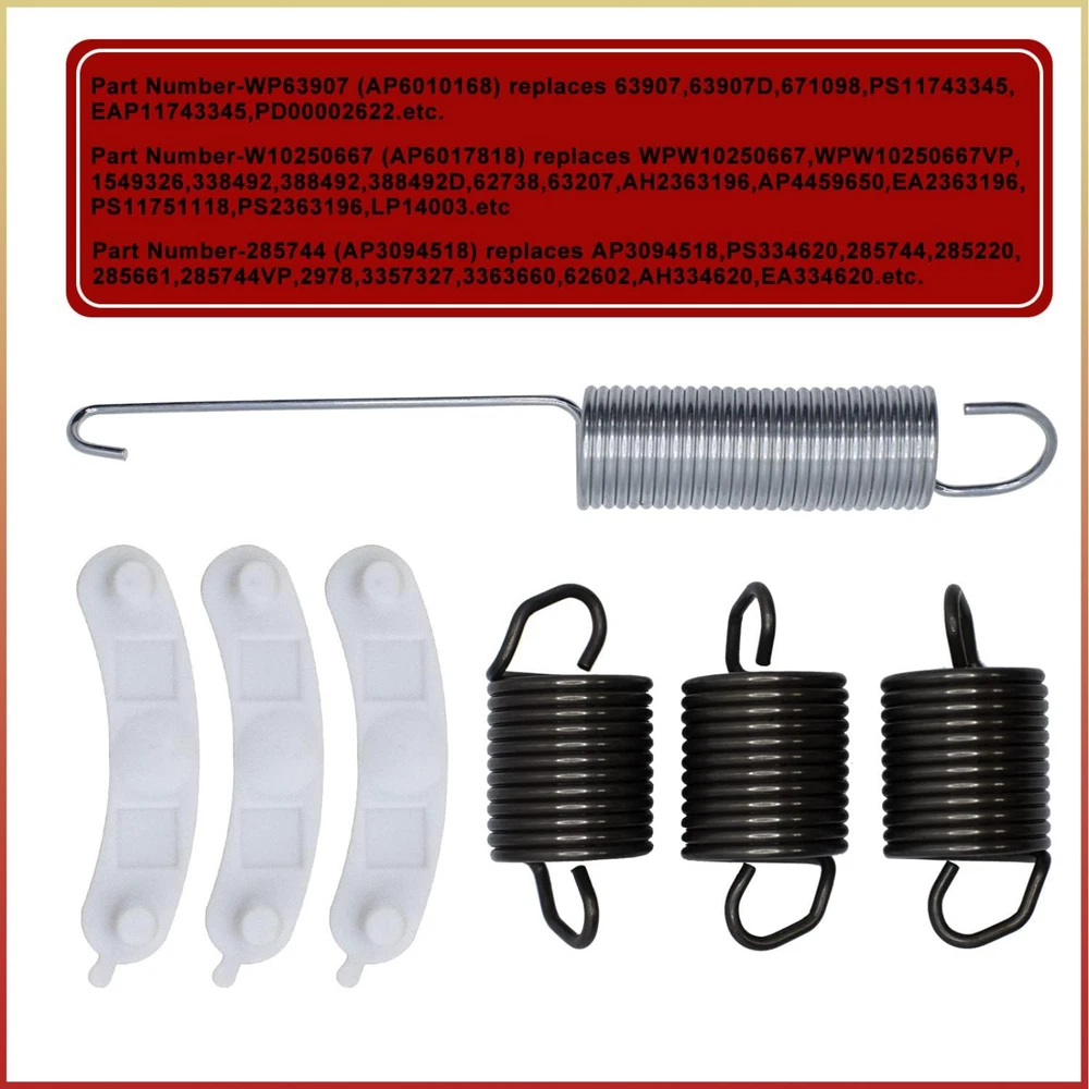 Description: ALL-IN-ONE WASHING MACHINE REPAIR KIT This high-quality washing machine kit includes: 3 pcs Suspension Springs (WP63907) 1 pcs Counterweight Counter Balance (W10250667) 3 pcs Base Pads (WP285744) Perfect for replacing worn or damaged parts in Kenmore and Whirlpool washers. COMPATIBLE PART NUMBERS WP63907 (AP6010168): Replaces 63907, 63907D, 671098, PS11743345, EAP11743345, PD00002622, etc. W10250667 (AP6017818): Replaces WPW10250667, 1549326, AH2363196, PS11751118, etc. 285744 (AP3094518): Replaces AP3094518, PS334620, 285220, 285744VP, AH334620, etc. SAVE TIME & MONEY Each component is thoroughly tested for quality and durability. This kit helps you fix common washer issues at a fraction of the cost of hiring a repair service. FITS MULTIPLE MODELS Compatible with Whirlpool and Kenmore washer models, including: 11010202000, 11010502990, 11013202200, 11014112300, 11015842400, 11016102500, and many more. COMMON REPAIR SYMPTOMS Washer vibrating excessively Tub off balance or slamming into the washer body during spin cycles Shaking, moving, or making unusual noises DURABLE & RELIABLE Crafted from premium materials, this repair kit is designed to extend the lifespan of your washer while ensuring smooth and quiet operation.