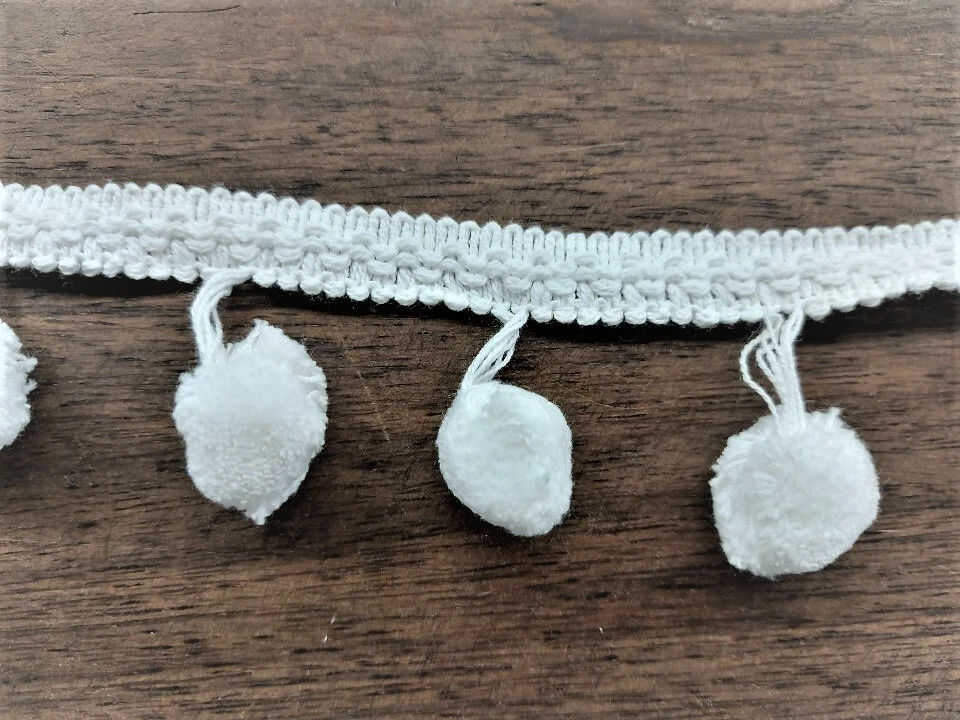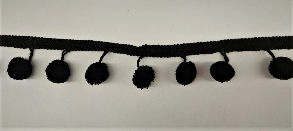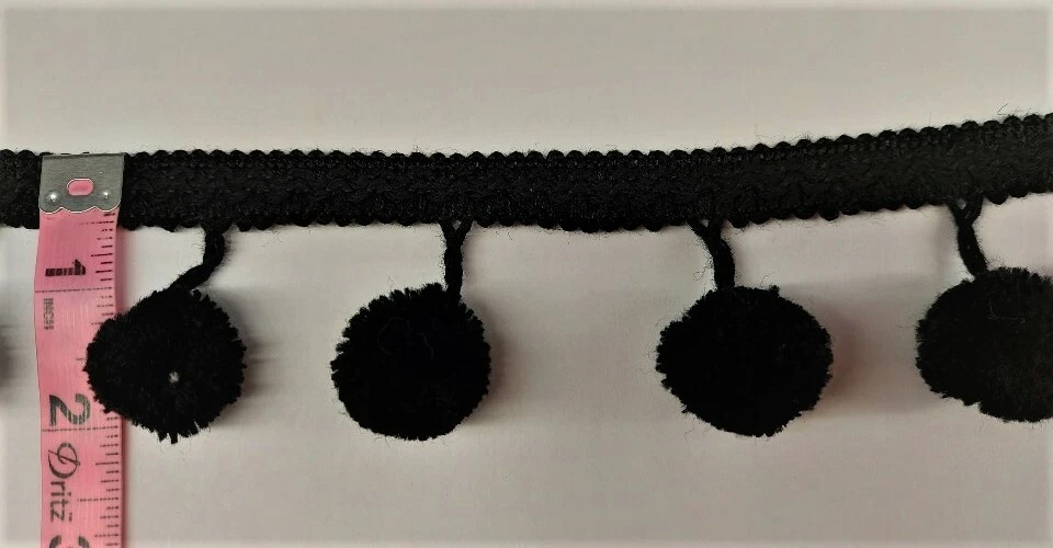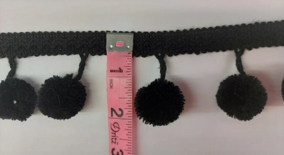 Description Black Large Pom-Pom trim Dimensions: Height total : 2" Braid tape: 1/2" Pom Pom: 1 1/2" This Large Pom Pom can be used for costume design, Accessories, skirts, bolero ,table runner and so on. • Color: Black, White Price for 2 yard is $2.95 We cannot accept returns. Thank you.