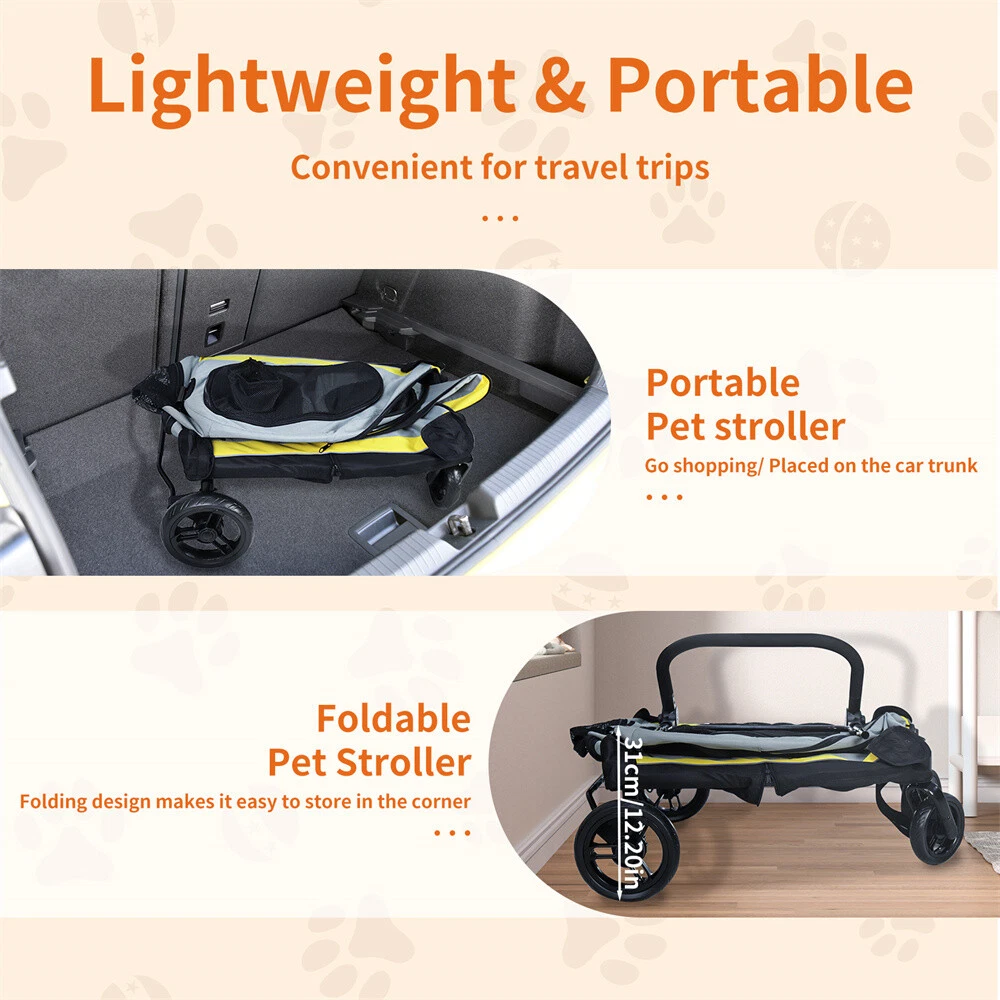Specifications: Type: Pet Stroller Model: Car Seat Feature: Foldable, 4 wheels, breathable Suitable for: Small dog breeds Material: Iron Pipe Frame + 600D Oxford Cloth Cover + EVA Wheels Color: Light Yellow and Gray and Black Net Weight: 7.5kg/ 16.53 inch Weight Capacity: total 20kg/ 44 lbs Car Stroller Dimension: L * W * H 41.5x44.8x62.6cm/ 16.34x17.64x24.65 inch Package Included: 1 x Dog Stroller Car Seat 1 x Instruction Guide 2 in 1 Dog Stroller Car Seat Travel Carrier Convertible Portable Pet Booster NEW FAST SHIPPING Features: 2 in 1 design, not only a pet stroller for walking, also a car seat stroller for travels. Easily detach the handle and wheels, installed it to the car backseat with hardware. It will convert into a pet stroller once you installed the handle and wheels. The size is specially designed for a variety of small sized dog breeds and cats. Perfect for injured, sick, elderly, paralyzed, anxious dogs that have difficulty in walking. Made from 600D oxford cloth fabric, remains durable, not easy to tear or scratch. Built-in omni-directional wheels for shock absorption, fits for all types of road. The rear wheels designed with safety brake, quickly locks the stroller in place. Zippered opening in the front and back for easy access, come in and go out freely. Small hand openings on either side, keep closed to pets or open it to offer treats. Secured the stroller with seat belt loop and extra strap to fix it to the car headrest. Enables dogs to enter the stroller by the back door, come out from the front. Breathable mesh on each side, keeps air flow and safe, offering high visibility. The handle bar is adjustable so you can find a level that works for you. Handle bar and wheels are detachable as per your need, change it into a car seat. Sunroof-style mesh panel opening on the top, allows pets stick their head out. Simply assemble together, foldable design for transportation and storage. Equipped with a safety collar hook inside to attach to dogs’ harness, keep safe. Designed with padding, providing added comfort for dogs during long journeys. Offering protection, hygiene, comfort, safety in one-piece, ensues a pleasant journey. Specifications: Type: Pet Stroller Model: Car Seat Feature: Foldable, 4 wheels, breathable Suitable for: Small dog breeds Material: Iron Pipe Frame + 600D Oxford Cloth Cover + EVA Wheels Color: Light Yellow and Gray and Black Net Weight: 7.5kg/ 16.53 inch Weight Capacity: total 20kg/ 44 lbs Car Stroller Dimension: L * W * H 41.5x44.8x62.6cm/ 16.34x17.64x24.65 inch Package Included: 1 x Dog Stroller Car Seat 1 x Instruction Guide Payment Delivery details Terms of sales About us Contact us Payment Delivery details We ship orders within 24 hours of payment. Orders are shipped daily Monday - Friday Orders are shipped through USPS and FedEx, normally take 3-6 days to arrive! Terms of sales Pls contact us if there is any problems with your order via ebay message. we will try our best to resolve it to your satisfaction! About us We are a store, mainly run home garden kitchen items, also, we are professional makeup case factory. We work with a good quality OEM supplier and factory. Help you and us save money greatly. Contact us If you have any questions or any helps, pls feel free to contact us via ebay message. We will reply back to you in 24 business hours.
