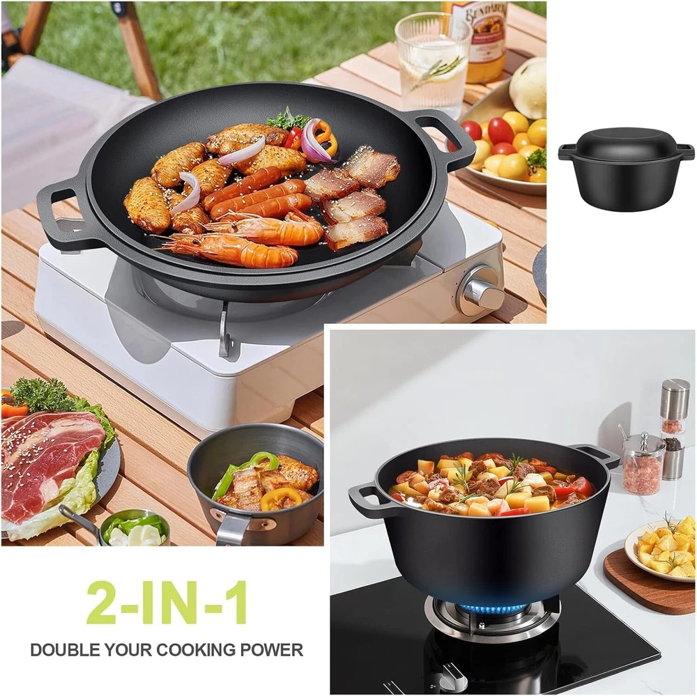 🍳【2-In-1 CAST IRON DUTCH OVEN】The 2-In-1 cast iron dutch oven pot with skillet lid has been burned with high-quality vegetable oil,(no synthetic coatings or chemicals). The shallow skillet that can be used as a lid. The domed pot can be used as a bean pot. Cast iron skillets is tend to get better with age, the more you use it, the better it performs 🥘【ENCLOSED THERMAL CIRCLE】This iron dutch oven pot is design with circulating shower type lid, the raised design of the pot cover allows water vapor to circulate in the pot and locks the nutrition and moisture of the food, evenly fall on the food to maintain the original nutrition, possess pretty heat retention performance. 🔥【SLEEK & ERGONOMIC DESIGN】Cast iron skillet set come with 2 integrated helper handles on each pot and skillet to help you transport your family recipes smoothly and safely to the dinner table. You can easily lift and move the cast iron pot with lid more conveniently. Please notice that wear cooking gloves (not included) when moving pot and skillet as the handle is not anti-scalding. 🧳【SUITABLE FOR ALL STOVES】Our premium Iron Dutch oven is designed to shine on various stovetops, including gas, electric, ceramic, and even induction. Plus, it's oven safe up to 500℉, offering an exceptional range of cooking options. 🧽【EASY TO CLEAN AND MAINTAIN】Just wash the cooker with warm soapy water, and then dry it thoroughly before storage. To protect the appearance of luster, avoid using citrus cleaners. Note: Do not use metal pads or utensils, otherwise the enamel coating will be scratched or broken.