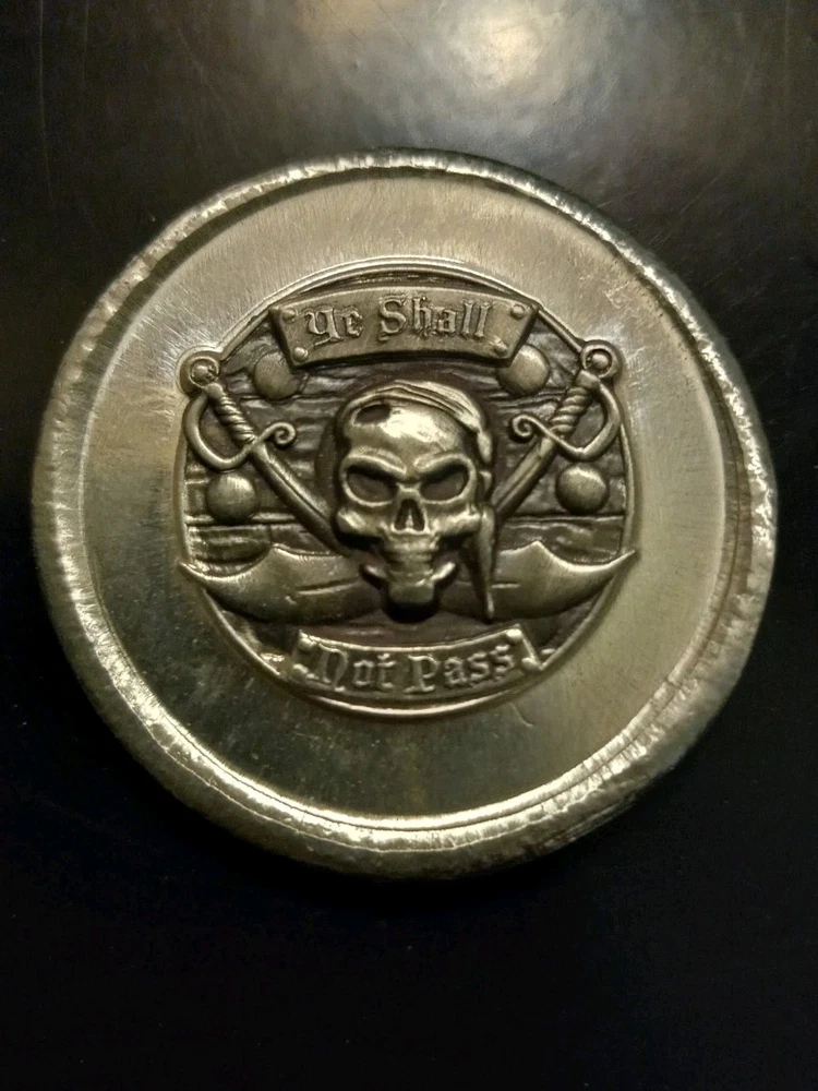 The product is a 2 oz silver round with a fineness of 0.999, featuring a design called "Ye Shall Not Pass" in high relief. It is hand poured by Mutiny Metals, known for their unique and quality silver products. The round shape and high silver content make it a desirable piece for collectors and investors looking to add a distinctive item to their precious metal collection.