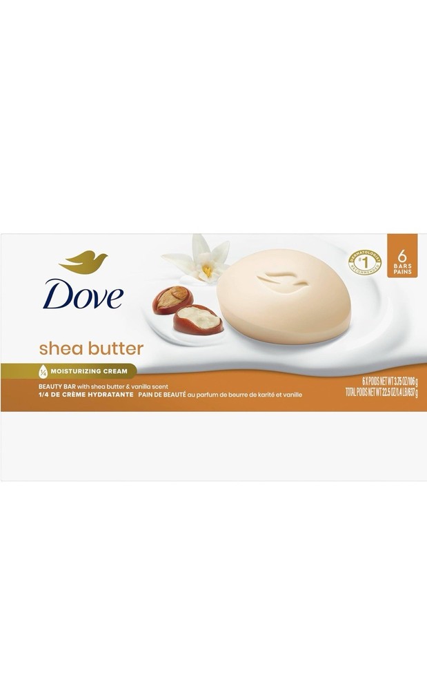 The Dove Beauty Bar Soap Shea Butter 6 Count is a set of six regular-sized bars of soap by the brand Dove. Each bar is infused with shea butter and has a vanilla scent, making it perfect for adult use. Manufactured by Unilever in the USA, these bars weigh 3.75 oz. each and are ideal for keeping your skin moisturized and healthy during bath time.