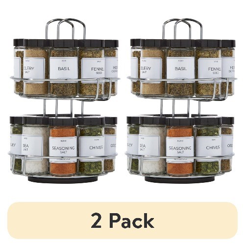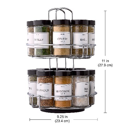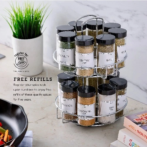 The Kamenstein 16-Jar Revolving Spice Rack includes 16 spice jars with removable sifter discs, and 1 revolving chrome wire spice rack organizer that complements your kitchen decor. Spices include Basil, Bay Leaves, Celery Salt, Chives, Coriander, Crushed Mint, Fennel Seed, Herbes De Provence, Italian Seasoning, Marjoram, Oregano, Parsley, Pizza Seasoning, Rosemary, Sea Salt, and Seasoning Salt (spices may vary). The rotating design keeps spices neat and easily accessible on countertops or in cabinets. Each jar features an easy-to-read label identifying the spice and a removable sifter cap to easily sprinkle, scoop, or pour your desired amount. The built-in handle provides easy transport around your home. Spice rack with spices included are Basil, Bay Leaves, Celery Salt, Chives, Coriander, Crushed Mint, Fennel Seed, Herbes De Provence, Italian Seasoning, Marjoram, Oregano, Parsley, Pizza Seasoning, Rosemary, Sea Salt, and Seasoning Salt (spices may vary) Rotating spice rack for cabinets and countertops keeps your spices neat and easily accessible Each glass jar features an easy-to-read label identifying the spice, and a removable sifter cap to easily sprinkle, scoop, or pour your desired amount Seasoning organizer measures 7.5 x 9.25 x 11in Features a built-in handle for easy transport around your kitchen and home Includes 5 years of free spice refills - simply follow instructions on the box to register your spice rack, and order refills when needed.