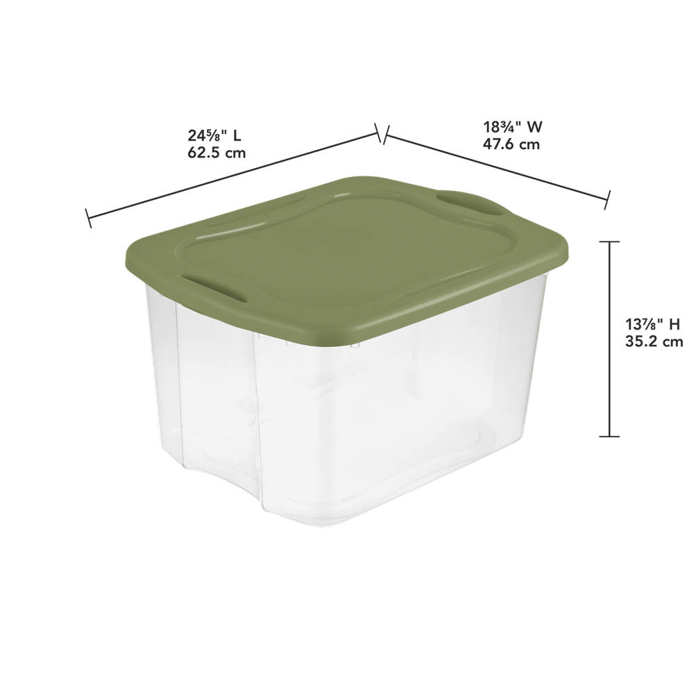 Sterilite 70 Quart EZ Carry, Plastic Storage Bin, Full-Grip Handles, Green,Outside Dimensions: 24 5/8" x 18 3/4" x 13 7/8",Interior Dimensions at bottom: 18 3/8" x 15 1/8" x 13 1/8",Carry through handles allow for full grip access and easier portability,Ideal for a variety of household storage needs, with a wide range of sizes,The clear base provides quick viewing of contents,Deep recessed lid allows for secure stacking of multiple bases,BPA-free and phthalate-free Sterilite's innovative line of EZ Carry Storage Boxes makes moving your storage easier! Unique through handles are designed to provide full grip access for comfortable lifting and carrying, as well as easier maneuvering through narrow doorways, hallways, and up and down stairs. The 70 Qt size is ideal for bedding, seasonal clothing, sporting gear, and other bulky items around the home. The clear base allows for quick viewing of contents, and the recessed lids allow same size storage boxes to stack neatly on top of each other to use vertical storage space efficiently. The 70 Qt EZ Carry Clear shares the same lid as the 95 Qt size, allowing secure stacking of both the shallow and deep storage boxes in one footprint. The 17.5 Gallon EZ Carry Tote shares the same lid so the clear and opaque versions can be stacked interchangeably. The overall assembled dimensions of this item are 24 5/8" L x 18 3/4" W x 13 7/8" H. About this item Sterilite 70 Quart EZ Carry, Plastic Storage Bin, Full-Grip Handles, Green Outside Dimensions: 24 5/8" x 18 3/4" x 13 7/8" Interior Dimensions at bottom: 18 3/8" x 15 1/8" x 13 1/8" Carry through handles allow for full grip access and easier portability Ideal for a variety of household storage needs, with a wide range of sizes The clear base provides quick viewing of contents Deep recessed lid allows for secure stacking of multiple bases BPA-free and phthalate-free On Jun 30, 2025 at 00:21:06 PDT, seller added the following information: