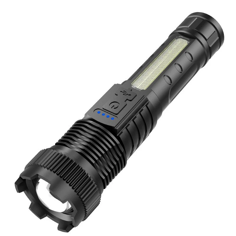Product Description Specifications: Bulb: XHP50 High beam LED Size:16.5*4*4CM Net weight:150G Battery:Built-in lithium battery Zoom method: telescopic zoom Charging method: USB charging Material: aluminum alloy+ABS Switch: Push the switch Gear position: 7 gears Waterproof grade: IPX-4 life waterproof Features: 1. Equipped with XHP50 lamp beads , and a service life of 100,000 hours.White High beam LED can illuminate more than 2000 meters 2. Ideal for hunting, adventure and other outdoor adventure activities. 3. This product has a power reminder function, You can know the power status of the flashlight anytime, anywhere 4. Waterproof in accordance with IPX-4, waterproof, can be used in rainy weather, but can not be placed in water 5.Battery capacity display, Micro usb for computer USB, car USB, USB charging plug, charging flashlight.And support USB output function 6.7 lighting modes, super bright headlights equipped with floodlights can meet most of the lighting needs 7.Suitable for work, hunting, climbing, fishing, camping and outdoor activities, etc. Package list: 2 * Flashlight 2 * Battery 2 * Type C charge cable