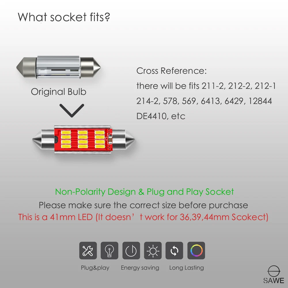 Package Contents: 2 x LED Interior Dome Light Bulbs for Chevy Silverado 1500 1999 - 2014 578 211-2 Pry Tool x 1 (90 days Manufacturer's Warranty directly from us!) A Friendly Reminder: Non-Polarity Design & Plug and Play Socket (LED Bulb Works Either Way) The application varies from different vehicles, which means they may not fit all postions on one vehicle. If you don't know if this bulb fits your car, you can check in sylvania-automotive. LED Features: 2 x LED Interior Dome Light Bulbs for Chevy Silverado 1500 1999 - 2014 578 211-2 Package Contents: 2 x LED Interior Dome Light Bulbs for Chevy Silverado 1500 1999 - 2014 578 211-2 Pry Tool x 1 ( 90 days Manufacturer's Warranty directly from us!) A Friendly Reminder: Non-Polarity Design & Plug and Play Socket (LED Bulb Works Either Way) The application varies from different vehicles, which means they may not fit all postions on one vehicle. If you don't know if this bulb fits your car, you can check in sylvania-automotive. LED Features: Voltage:DC 12V Number of Bulbs: 12 pieces 4014 LED Color: Ultra White Socket Type: 41mm 578, 211-2, 212-2 Long life-typically lasting 50,000 hours Color Temperature: 6000~6500K Condition: Brand New Length: 41mm/1.54 inch Diameter: 12.6mm/0.50 inch Fitment: This LED can fit more than one car, please check the “ Compatibility Table ” before check out. (Send us a message for more questions) Cross Reference Bulb Sizes: 41mm 42mm LED 211-2, 212-2, 214-2, 560, 569, 578 Item Specifics Interchange Part Number 211 211-2 212-2 214-2 Bulb Color White Manufacturer Part Number 2S-FT-102-T01 Placement on Vehicle Front Rear Left Right Other Part Number 6413 6429 4410 560 578 Brand SAWE Number of Bulbs 2 Warranty 90 Day Voltage 12V To Fit Map Dome Step Footwell Light Fitment Type Direct Replacement Color Temperature 6000K Lighting Technology LED Suitable For Cargo Step Courtesy Light DESCRIPTION PAYMENT SHIPPING RETURN POLICY CONTACT US Shop Category Store Home Apple iPad Case ◈ iPad Mini 1 / 2 / 3 Case ◈ iPad Mini 4 (4th Gen) Auto LED Lights ◈ T10 168 194 ◈ Resistor ◈ 1156 ◈ 31 mm LED ◈ 41 mm LED ◈ BA9S ◈ Honda Interior LED Package ◈ Acura Interior LED Package ◈ Toyota Interior LED Package ◈ Scion Interior LED Package ◈ Subaru Interior LED Package ◈ Mitsubishi Interior LED Packag ◈ Mazda Interior LED Package ◈ Hyundai Interior LED Package ◈ Lexus Interior LED Package ◈ Nissan Interior LED Package ◈ Infiniti Interior LED Package ◈ Kia Interior LED Package ◈ BMW Interior LED Package ◈ Mercedes Interior LED Package ◈ Audi Interior LED Package ◈ Chevrolet LED Package ◈ Volkswagen LED Package ◈ Cadillac LED Package ◈ Chrysler LED Package ◈ Dodge Interior LED Package ◈ Ford LED Package ◈ Porsche LED Package ◈ GMC LED Package ◈ Mini LED Package ◈ Lincoln LED Package ◈ Jeep LED Package ◈ Hummer LED Package ◈ Sun Visor LED ◈ Rigid Loop LED ◈ 44 mm LED ◈ Strobe Warning Light ▷ Reverse,Signal, Brake LED ♢ T15 921 912 LED ♢ 3156 / 3157 ♢ 7440 / 7443 ♢ 1157 Bags ◈ Zip Lock Bags ◈ Static Bags Other Hot Item 10x 41mm 42mm 6SMD LED Dome Map Interior Light Bulbs 578 211-2 212-2 6000K White USD 10.98 10 x Ultra White 41MM 42MM 3014 36SMD Dome Map LED Light Bulbs 578 211-2 212-2 USD 13.99 8 x Ultra White 41MM 42MM 3014 36SMD Dome Map LED Light Bulbs 578 211-2 212-2 USD 12.99 20 x Ultra White 41MM 42MM 3014 36SMD Dome Map LED Light Bulbs 578 211-2 212-2 USD 18.99 6 x Ultra White 41MM 42MM 3014 36SMD Dome Map LED Light Bulbs 578 211-2 212-2 USD 10.44 New List Item 11 x White LED Interior + Reverse Light Package For 2007 - 2012 Nissan Sentra USD 16.99 20 x SAWE 31MM LED Interior Bulbs for Truck Map Dome Light 24SMD DE3022 DE3175 USD 19.99 10 X Ice Blue 42mm 6SMD 5050 Festoon Dome Map LED Light 578 211-2 212-2 + TOOL USD 9.99 10 x Red 31MM 5050 6SMD Dome Map Interior LED Light Bulbs DE3175 DE3022 + TOOL USD 10.99 4 x Green 31MM 3528 12SMD Dome Map Interior LED Light Bulbs DE3175 DE3022 + TOOL USD 7.99 Help & Info Payment Policy Shipping Policy Return Policy FAQ About Us 2 x LED Interior Dome Light Bulbs for Chevy Silverado 1500 1999 - 2014 578 211-2 Package Contents: 2 x LED Interior Dome Light Bulbs for Chevy Silverado 1500 1999 - 2014 578 211-2 Pry Tool x 1 ( 90 days Manufacturer's Warranty directly from us!) A Friendly Reminder: Non-Polarity Design & Plug and Play Socket (LED Bulb Works Either Way) The application varies from different vehicles, which means they may not fit all postions on one vehicle. If you don't know if this bulb fits your car, you can check in sylvania-automotive. LED Features: Voltage:DC 12V Number of Bulbs: 12 pieces 4014 LED Color: Ultra White Socket Type: 41mm 578, 211-2, 212-2 Long life-typically lasting 50,000 hours Color Temperature: 6000~6500K Condition: Brand New Length: 41mm/1.54 inch Diameter: 12.6mm/0.50 inch Fitment: This LED can fit more than one car, please check the “ Compatibility Table ” before check out. (Send us a message for more questions) Cross Reference Bulb Sizes: 41mm 42mm LED 211-2, 212-2, 214-2, 560, 569, 578 Item Specifics Interchange Part Number : 211 211-2 212-2 214-2 Bulb Color : White Manufacturer Part Number : 2S-FT-102-T01 Placement on Vehicle : Front Rear Left Right Other Part Number : 6413 6429 4410 560 578 Brand : SAWE Number of Bulbs : 2 Warranty : 90 Day Voltage : 12V To Fit : Map Dome Step Footwell Light Fitment Type : Direct Replacement Color Temperature : 6000K Lighting Technology : LED Suitable For : Cargo Step Courtesy Light Payment Shipping Returns Contact Us Pay securely with any major credit card through PayPal! Payment must be received within 7 days after auction closes. Please ensure that the shipping address you provide at checkout is accurate. We are not responsible for undeliverable or wrong shipped addres Pay securely with any major credit card through PayPal! Payment must be received within 7 days after auction closes. Please ensure that the shipping address you prov