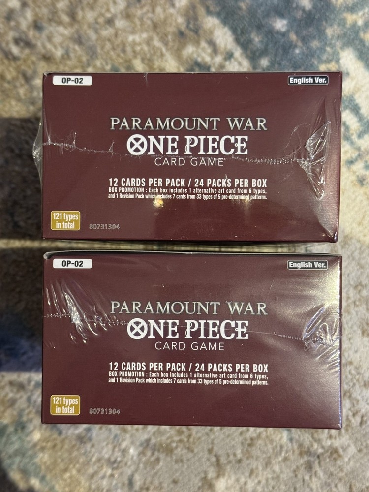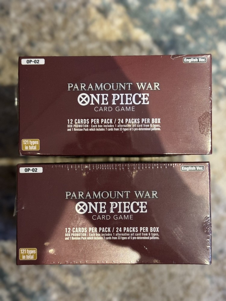 2 x The One Piece Card Game OP-02 Paramount War Booster Box in English is a factory-sealed product from Bandai, featuring standard-sized cards for the One Piece CCG. This booster box contains one set of the Paramount War collection, offering players a chance to enhance their decks with new and exciting cards. With a focus on the year 2024, players can expect a fresh and immersive experience as they navigate through the world of One Piece in this highly sought-after booster box. All orders will be dispatched double boxed to avoid any damage in transit. All orders will be dispatched fully insured and tracked. Any questions please feel free to ask before purchasing. Thank you