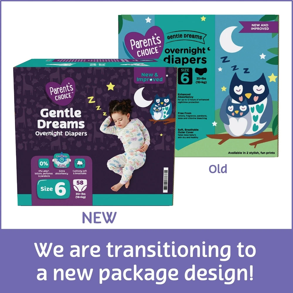 2 x Parent's Choice Gentle Dreams Overnight Diapers, Size 6, Total 116 Count Parent's Choice Gentle Dreams Overnight Diapers help keep your baby dry and comfortable. The diapers' wetness indicators will change from yellow to blue, letting you know when it's time to change your baby's diaper. Their gentle but snug fit helps protect from leaks at the back, waist, and legs. Each diaper is made without natural latex, lotions, and perfumes so you can trust they will be gentle on your baby's skin. Choose from two stylish, fun prints in multiple sizes and bring home our Parent's Choice Gentle Dreams Overnight Diapers today. At Parent's Choice, our mission is simple: we're committed to delivering quality diapers to help keep little ones dry, comfortable, and happy. Our diapers are dermatologically tested and made without latex, fragrance, and lotions to help maintain baby's naturally healthy skin throughout the day or night. Parent's Choice Gentle Dreams Overnight Diapers Size 6, 58 Count (Select for More Options) Enhanced absorbency for up to 12 hours of nighttime protection Wetness indicator changes from yellow to blue Made from extra-soft breathable materials for ultimate comfort Dermatologically tested Available in 2 stylish and fun prints Features Disposable, Absorbent Size Size 6 Diaper Size Size 6 Minimum Weight 35 lb Gender Unisex Count 58 Disposable Baby Diaper Type Overnight Diapers Material Not Available Model B0103756 Brand Parent's Choice Assembled Product Dimensions (L x W x H) 11.38 x 9.82 x 10.27 Inches
