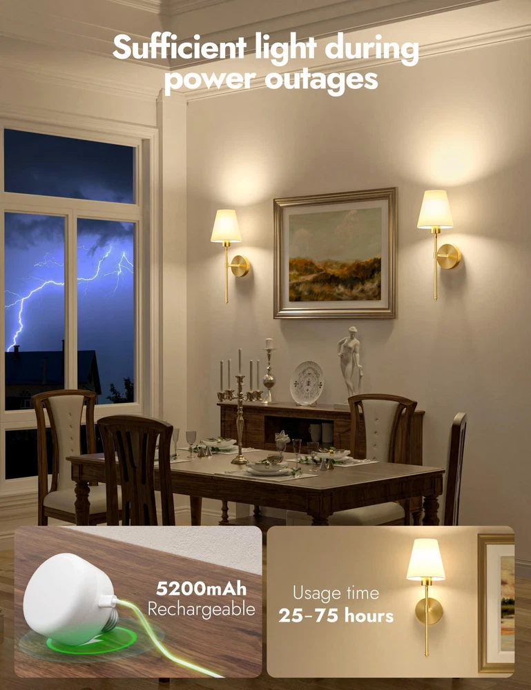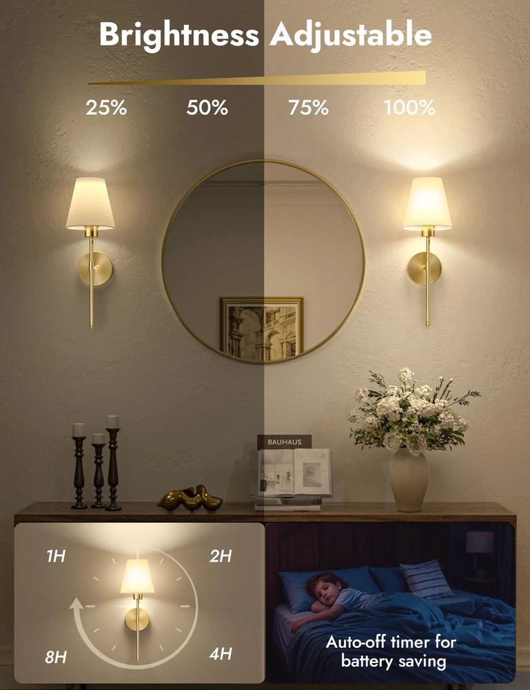 20'' Battery Operated Wall Sconces Set of Two, Wireless Wall Sconces with Remote and Bulbs, 9 Colors Battery Powered Wall Lights, Rechargeable Wall Lamps for Bedroom Living Room(Gold) 【Wireless & Easy to Install】wireless sconces set of 2 are battery - powered, coming with two rechargeable 5200mAH LED bulb. Wall sconces set of two battery operated eliminating the hassle of wiring within the walls, conveniently for users who don't want to damage the wall surface and those without pre - installed electrical wiring, or renters. Sconces wall lighting battery operated are suitable for bedroom, living room, hallway, bathroom, kitchen, and stairway etc, creating an elegant and stylish atmosphere for your indoor space. 【9 Lighting Colors】Our battery powered sconces set of 2 offers diverse lighting options. It has three color temperatures: 3000K creates a cozy and inviting atmosphere, 4000K provides a clear and natural illumination, and 6000K is bright and energetic. There are also six RGB colors to switch between. Whether for a party or daily use, you can easily customize the lighting to suit different moods and occasions. With the gold sconces wall decor set of 2, creating the perfect lighting environment is a breeze. 【Dimmable & Energy Saving】300 Lumen/5200 mAH. The battery powered wall sconce offers four brightness levels: 25%, 50%, 75%, and 100%. Customize the light according to your needs and desired atmosphere. Whether for a relaxing night or tasks, switch between settings easily. The working time of the gold wall lights battery operated depend on brightness. It lasts 72 hours at the lowest brightness and 25 hours at the highest. 【Timer and Memory Function】You can easily set a timer for wall lamps battery operated to automatically turn off after 1 to 8 hours. This helps extend the battery life and reduces unnecessary power consumption. Even better, when you turn off and then turn on this rechargeable wall sconces set of 2 again, it will remember the color and brightness settings you last used, eliminating the hassle of re - configuration. 【100% Satisfaction Service】: We proudly stand behind all of our products 100% and offer a full 2-year service for our rechargeable wall lights. This will cover you if the wireless lights for wall indoor stop working or there are any defects within those 2 years. 【100% Satisfaction Service】We proudly stand behind all of our products 100% and offer a full 2-years service for our wall sconces. This will cover you if the gold wall lights stop working or there are any defects within those 2 years.