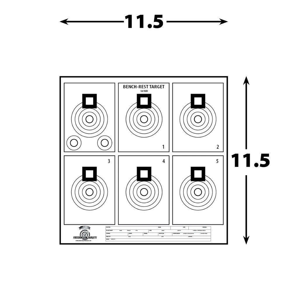 Sold by Freedom Gun Targets. 20 Targets Per Pack. This Precision Shooting and Rifle Sighting Target is printed on 11.5x11.5 high quality coated thick 289gsm weight cover stock. This target is water and windproof. This target is extremely popular for people who load bullets and do load development and testing. Black box is for aiming only. The below target is for hits and hit identification. Complete rifle data recording chart at the bottom of the target. Target works well for everyday practice and with all firearms and air soft guns. Works for indoor or outdoor use Targets ship flat! Printed in the U.S.A. 100% Money back guarantee. We will refund your purchase up to 60 days and pay the return shipping! Ships USPS Priority Mail.