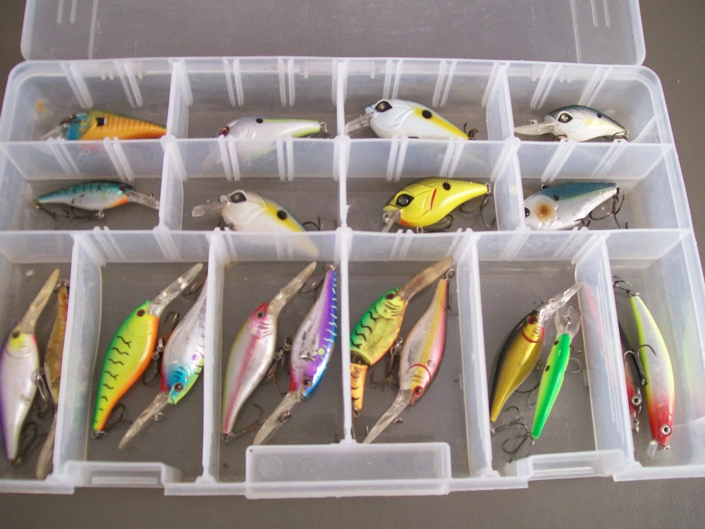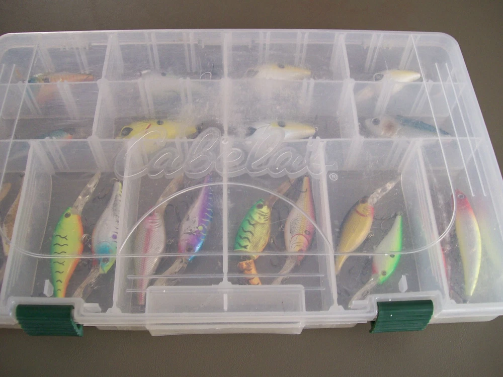 Cabela`s plastic utility box with 20 crankbaits. Some of these baits look used but alot of them look unfished. The Cabela`s case is used but is in good shape, opens and closes just fine and the latches seal it right up. Shipping is 8.00