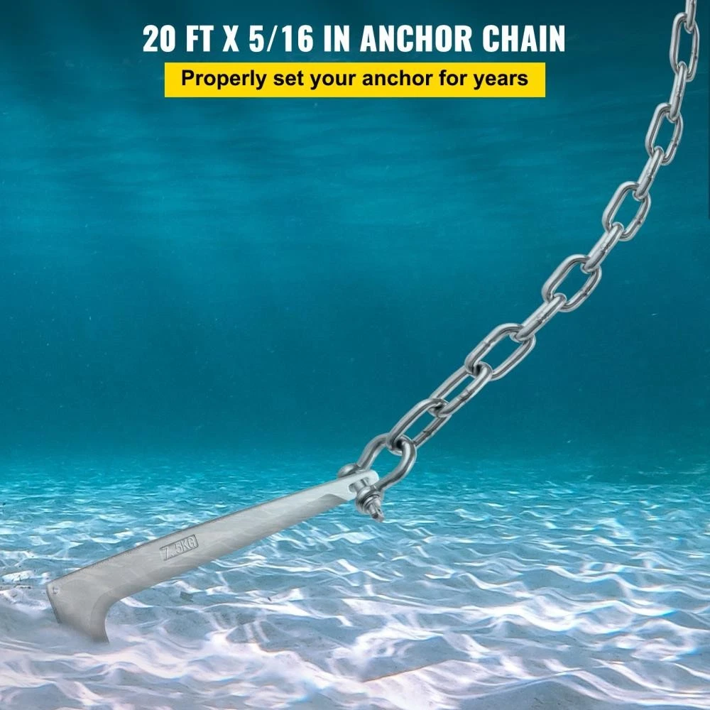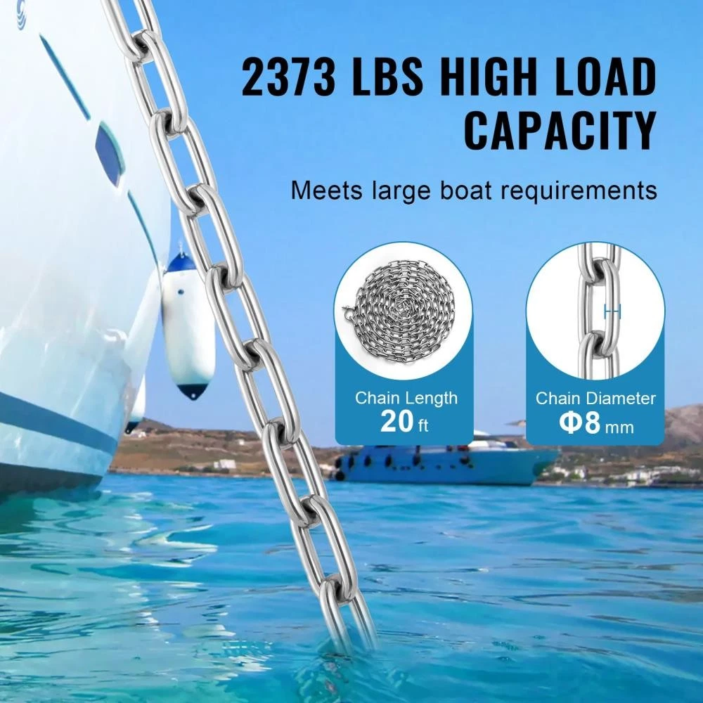 Features & Details Strong and Durable Stainless Steel: Our marine-grade stainless steel anchor chain supports a break load of 7120 lbs, giving you peace of mind with its durability and corrosion resistance. It's built tough to withstand the elements and keep you secure. 4-inch Extended Anchor Chain: Made from solid carbon steel and welded with precision, our boat anchor chain isn't just strong—it's reliable. The extra-wide links and anti-wind, non-slip design keep everything steady, no matter what you're hanging. Strong Double-Threaded D-Shackles: Our anchor lead chain features two rugged shackles designed to stay strong and stable even in tough sea conditions. Their reliable connection prevents slipping or breaking, ensuring your boat stays securely anchored. Better Anchoring Performance: Our heavy chain keeps your anchor parallel to the lakebed or seabed, boosting its grip. This reduces unwanted drifting or release caused by waves or boat drift. Fits Most Anchors: Whether you use a claw anchor, box anchor, or grapnel anchor, our boat chain works with nearly all types. It's reliable for long-term use underwater and in the sun, making your anchoring simple and effective. On Jan 30, 2026 at 19:09:16 PST, seller added the following information: Recommended products Provided by 20 FT Boat Anchor Chain 5/16" (8mm) Stainless Steel 316 with Shackles + View product 20 FT Boat Anchor Chain 5/16" (8mm) Stainless Steel 316 with Shackles⇘ View product 20 FT Boat Anchor Chain 5/16" (8mm) Stainless Steel 316 with Shackles∌ View product 20 FT Boat Anchor Chain 5/16" (8mm) Stainless Steel 316 with Shackles / View product 20 FT Boat Anchor Chain 5/16" (8mm) Stainless Steel 316 with Shack View product 20 FT Boat Anchor Chain 5/16" (8mm) Stainless Steel 316 with Shackl. View product 20 FT Boat Anchor Chain 5/16" (8mm) Stainless Steel 316 with Shackl . View product 20 FT Boat Anchor Chain 5/16" (8mm) Stainless Steel 316 with Shackl View product