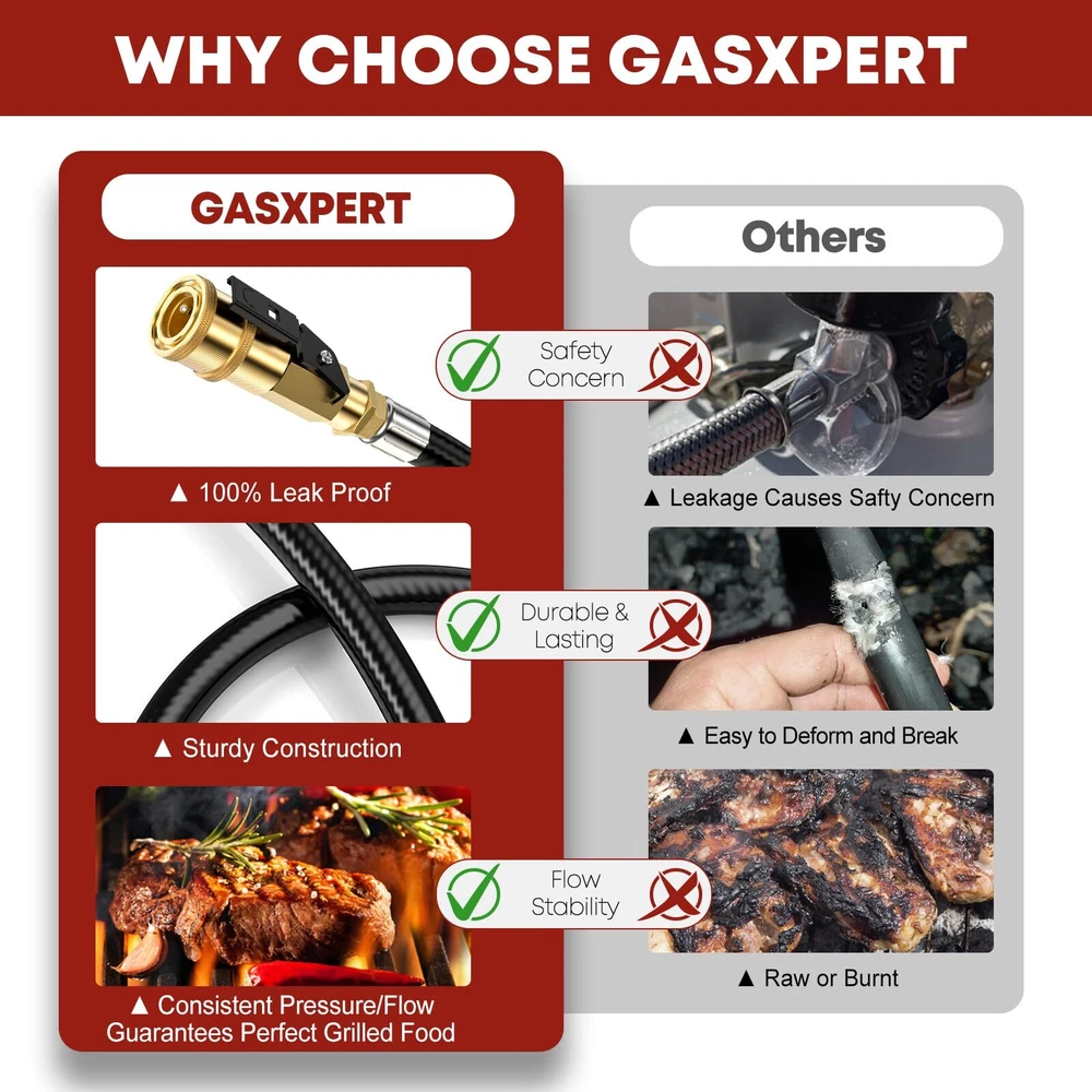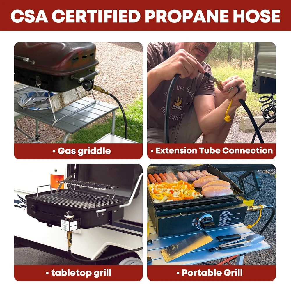 Enhanced Quality & Construction - The low pressure RV Propane Hose Extension usually has a rather short service life as it is used frequently and widely. However, lengthens the lifespan of its quick connect propane hose by enhancing every product procedure from designs to QC, adopting 3-layer hose construction and choosing premium materials to make its propane quick connect hose excel in strength, durability, weather/tear/wear/leak resistance; Multipurpose & Effortless - Designed to connect RV to heater, camping stove, cooker, and grills. quick connect propane hose for RV to grill is equipped with standardized 1/4”Female Quick Connect Fitting with safety valve and 1/4”Male Full Flow Plug, which are accurately constructed from 100% premium brass to its compatibility and sturdiness; Convenient Length & Flexible Gas Line - RV propane hose is measured at 20 Feet, a perfect length to satisfy the need to transfer propane gas from rv lp gas system to your lp appliances at a great distance. Plus, the propane hose is fully tested and certified by CSA for 100% safety; All About Convenience & Money Saving - As the propane quick connect hose is an simple and easy tool to connect your rv to grill or other lp appliances, it is an ideal accessory you must bring on your trip. Not only will it SAVE YOUR MONEY wasting on 1lb propane tanks, but it also will deliver adequate flow and heat to your grill to prepare a nice meal for your family and friends; We Not Only Provide Propane Hoses - All propane hoses are under 1-Year . As we value every customer’s voice and experience with our products as well as with our service, we provide 24hrs/7days non-stop customer support to you. Pls feel free to us whenever you are concerned about the product or after-sales service.