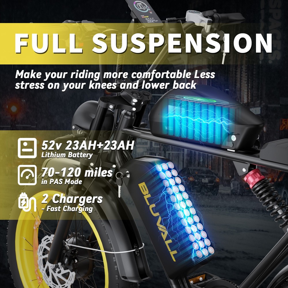 Product Overview The K10 Dual Battery Electric Bike is a UL 2849 certified adult e-bike designed for long-distance commuting and adventure riding, available in stylish Black/Gold and classic Black finishes. Built with a durable carbon steel frame and dual-battery system, this e-bike delivers exceptional range and performance while meeting strict safety standards for e-bike systems. Key Features & Advantages UL 2849 Safety Certified This e-bike and its dual battery system are fully certified to UL 2849 standards, ensuring compliance with safety requirements for electric bicycles and lithium-ion battery systems. Documentation of this certification is available upon request. Long-Range Dual Battery System Dual 52V batteries (20Ah + 23Ah) provide an impressive 80-100KM range per charge, eliminating range anxiety for long trips and daily commuting. Powerful Performance Equipped with a 2000W high-efficiency motor, the e-bike delivers strong acceleration and climbing capability, with a max speed of up to 55KM/H (subject to local speed regulations). Comfort & Safety 20" × 4.0 anti-puncture fat tires and adjustable front & rear suspension for stable riding on varied terrain Hydraulic oil brakes for responsive, secure stopping Front & rear turn signals + brake lights to enhance visibility in low-light conditions 7-speed transmission and 3 riding modes (pedal assist, pure electric, manual) for flexible use Cruise control function to reduce rider fatigue during long rides Durable Build Sturdy carbon steel frame ensures long-term structural stability; the mid-mounted instrument panel clearly displays real-time speed, battery level, mileage, and riding mode. Important Compliance Notes This e-bike is certified to UL 2849 standards. Certification documentation will be provided upon request. Please adhere to local traffic laws and speed limits when operating this e-bike. Professional assembly and regular maintenance are recommended to maintain safety and performance. Used e-bike batteries and chargers are not allowed on eBay; this product is sold as a complete e-bike with factory-installed batteries. Brand Bluvall Manufacturer Warranty 1 Year Voltage 52V Model 3000W Features Display, Fenders, Front Light, Kickstand, Lithium Ion Battery, Pedal Assist, Rear Light Material High Carbon Steel Country of Origin China Department Unisex Adults Handlebar Type Cruiser Bar Wheel Size 20 in Maximum Speed 37MPH Number of Speeds Shimano 7 Speed Charging Time More Than 5 Hours Maximum Range 70-120 miles with pedal assist Model Year 2025 Motor Type Dual Motors Bike Type E-Mountain Bike Tire Type Fat Tires Brake Type Disc Brake - Hydraulic Suspension Type Full Suspension (Front & Rear) Shifter Style Thumb Shifter Gear Change Mechanism Derailleur Gears Item Weight 79 lb Frame Size Large Motor Power Dual 52V 1000W Motors