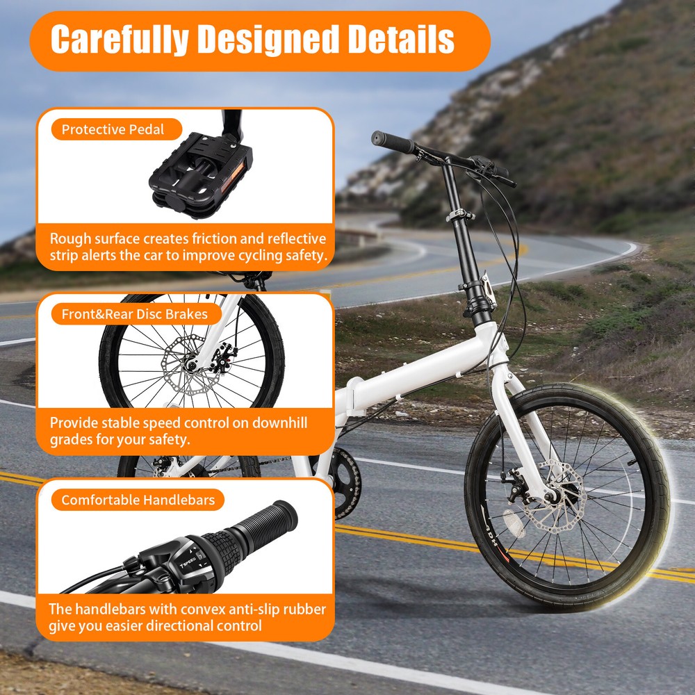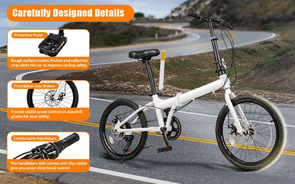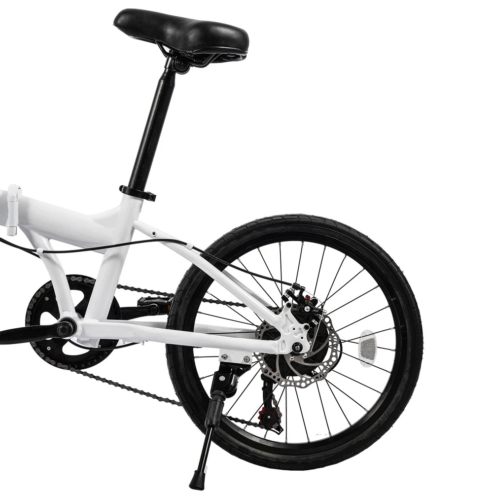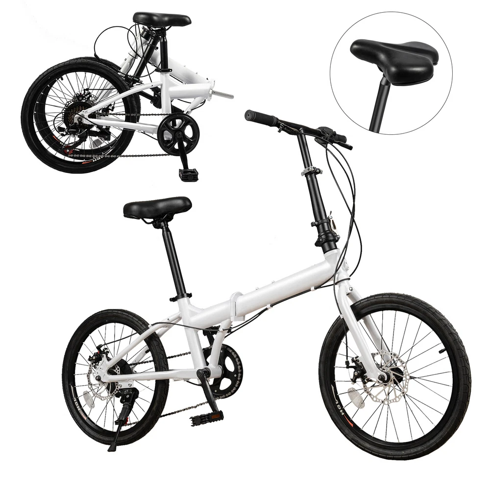 20" Folding Mountain Bike 7 Speed Bicycle Full Suspension MTB Bike Steel White Folding Bike Foldable Bicycle with 7 Speed Gears 20-inch Wheels Easy Folding City Bicycle with Disc Brake Description If you are a cycling enthusiast or want to improve your biking skills, then this 20-inch folding bike is an ideal choice for you whether it's for daily commuting or travel. Front and rear disc brakes provide stable speed control and improve safety. The 7-gear transmission is convenient for you to fight against different road conditions. What are you waiting for? Let it take you to enjoy the fun and freedom of biking. Key Features Smooth Ride : The 7-gear transmission allows you to select the right speed according to the road conditions and your physical strength by turning the handle, making the ride more effortless. 7 levels of flywheel positioning teeth enable flexible gear changes and are less likely to drop the chain. Versatile Look : The modern black and white color scheme and classic design will not go out of style, showing your understated personality and getting a wider range of usage scenarios. Comfortable Ride : The low-span body makes it easy to get on the bike. The PU foam cushion is breathable and soft to relieve riding fatigue and provide a comfortable riding experience. High-quality Material : The frame is made of aluminum alloy with three layers of electrostatic spraying process, so it is strong, wear-resistant, anti-rust, and anti-corrosion, providing support for its high quality and stability (176lbs). Foldable Design : The quick-release buckle allows you to achieve easy folding and storage without taking up too much space. You can easily store it in the trunk, apartment, or subway for a free ride anywhere. Safe Riding : Front and rear disc brakes provide stable speed control on downhill grades, promoting consistent and responsive braking action for your safety. The reflective strip of the pedal allows you to ride with peace of mind even in the dark. Adjustable Height : Adjustable seat height (23.6-36.6inch) and elevable handlebars (35.4-41inch) easily accommodate people of different heights or different riding habits. Wonderful Gift : This 20-inch mountain bike is an ideal gift on birthdays, Christmas, Thanksgiving, graduation, etc. for loved ones and friends who love to ride. Details 20-inch Tires : The anti-slip texture of the 20-inch tire easily provides extra grip and stability on the road or trails, allowing you to ride with more confidence. Comfortable Non-slip Handlebars : The bike's handlebars are covered with rubber and the convex anti-slip pattern gives you easier directional control. Protective Pedals: The rough surface of the pedals creates friction when riding and makes it less likely to slip to improve cycling safety. Application It is suitable for traveling, exercising, commuting, and crossing the country on gravel roads, highways, and sand roads. It is suitable for people who weigh no more than 176 lbs and are taller than 59 inches to ride. How to Fold 1. Remove the seat lever. 2. Fold the handlebar lever. 3. Open the quick release buckle. 4. Fold the body. Specification Frame Material: Aluminum Alloy Seat Material: PU, PU Foam Material of Handlebar Rod&Seat Rod: Iron Handlebar Material: High Carbon Steel Handlebar Cover Material: Rubber Color: White, Black Surface Treatment: Three Layers of Electrostatic Spraying Number of Speeds: 7 Special Feature: Foldable Age Range (Description): Adult, Teenager Load-bearing Capacity: 80kg/176lbs Recommended User Height: Above 150cm/59inch Suspension Type: Dual Disc Brakes Total Length: 155cm/61inch Seat Distance From the Ground: 60-93cm/23.6-36.6inch Handlebar Distance From the Ground: 90-105cm/35.4-41inch Tire Diameter: 50.8cm/20in Pedal Size: 10*7cm/3.9*2.8inch Seat Size: 17*23cm/6.7*9inch Handlebar Grip Distance: 25cm/9.8inch Product Size (After Folding): 40*80*57cm/15.7*31.5*22.4inch Package Size: 86*67*36cm/33.8*26.4*14inch Gross Weight: 14.7kg/32.4lbs Net Weight: 11.95kg/26.3lbs Package Included 1*20-inch Folding Bike Other Tools for Installation Notes Please allow the slight color difference caused by the shooting light and 1-3cm error due to manual measurement, and make sure you do not mind before you place the order.
