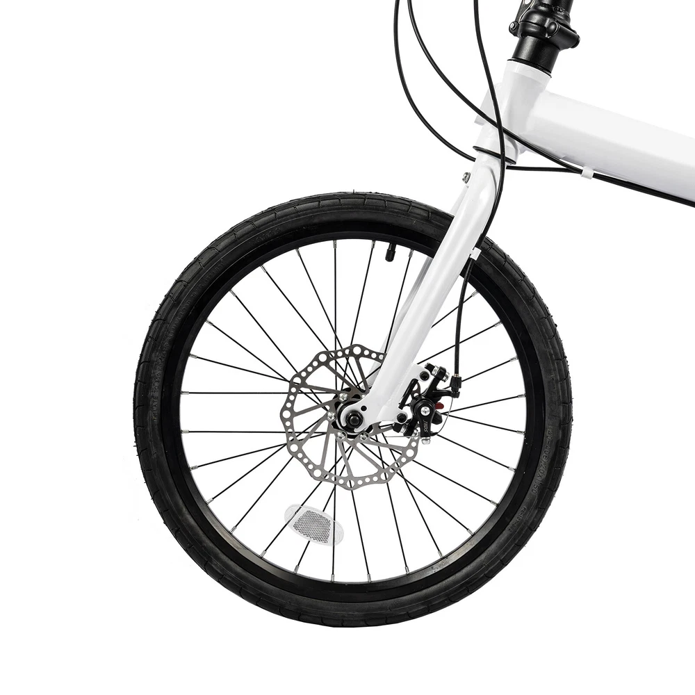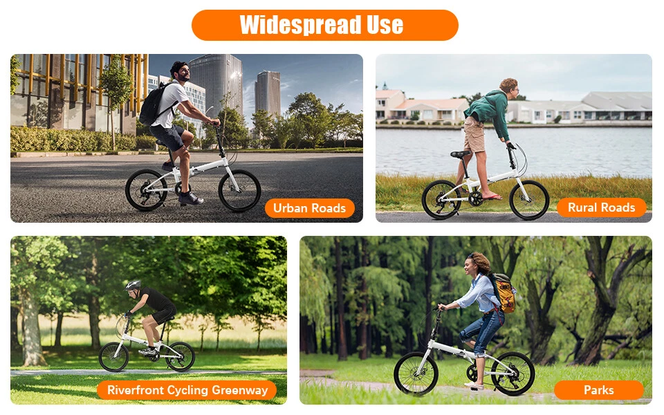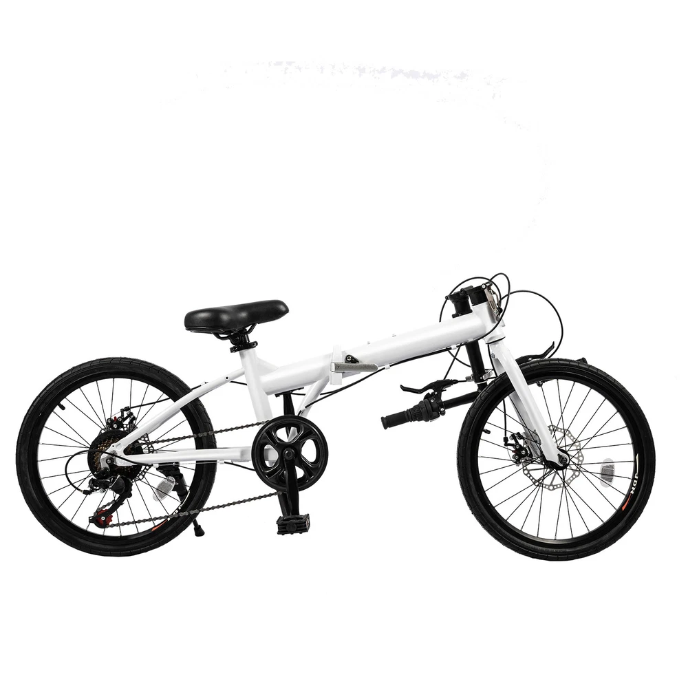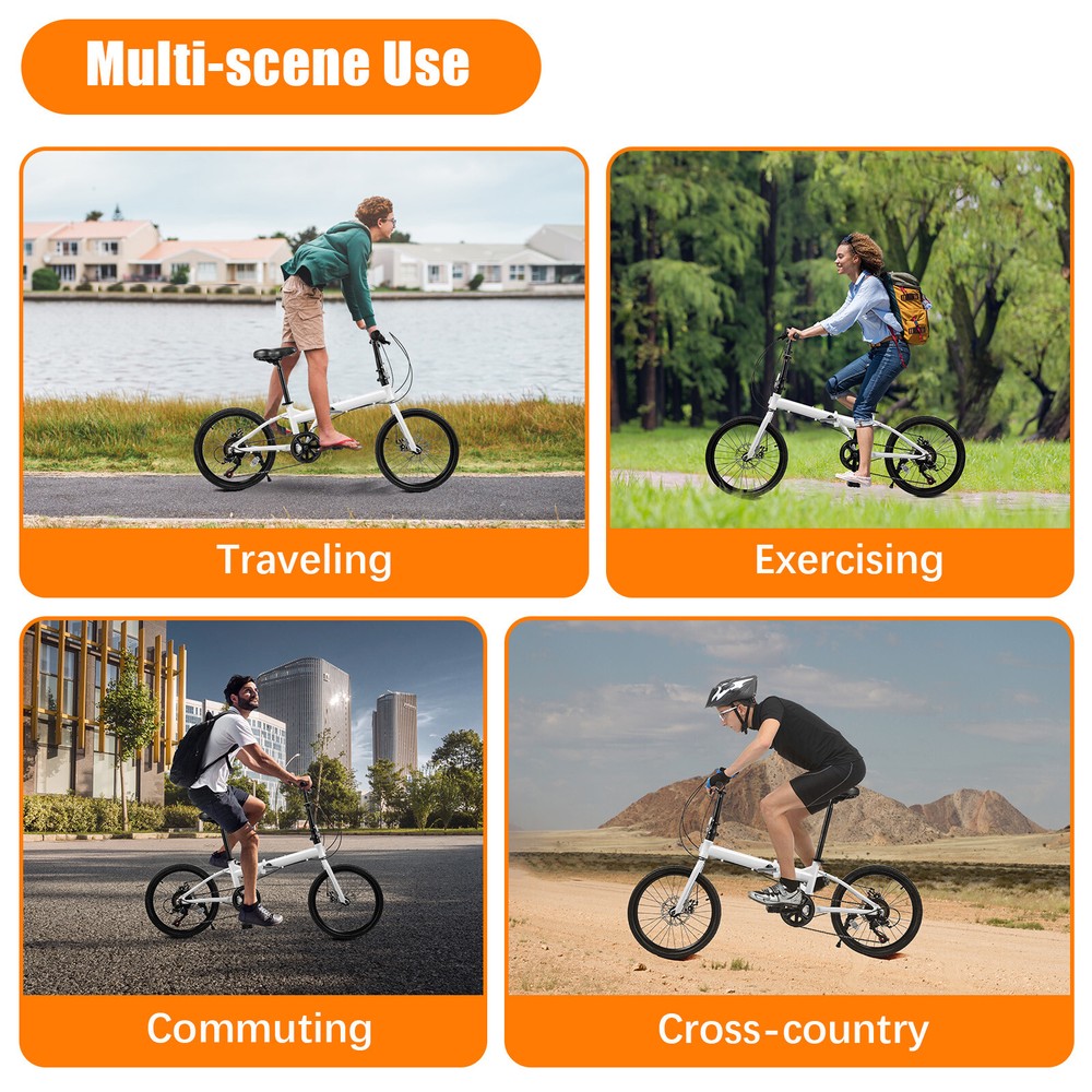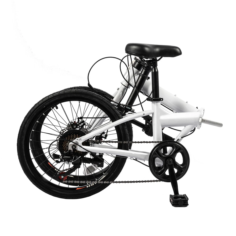 20" Folding Mountain Bike 7 Speed Bicycle Full Suspension MTB Bike Steel White Folding Bike Foldable Bicycle with 7 Speed Gears 20-inch Wheels Easy Folding City Bicycle with Disc Brake Description If you are a cycling enthusiast or want to improve your biking skills, then this 20-inch folding bike is an ideal choice for you whether it's for daily commuting or travel. Front and rear disc brakes provide stable speed control and improve safety. The 7-gear transmission is convenient for you to fight against different road conditions. What are you waiting for? Let it take you to enjoy the fun and freedom of biking. Key Features Smooth Ride : The 7-gear transmission allows you to select the right speed according to the road conditions and your physical strength by turning the handle, making the ride more effortless. 7 levels of flywheel positioning teeth enable flexible gear changes and are less likely to drop the chain. Versatile Look : The modern black and white color scheme and classic design will not go out of style, showing your understated personality and getting a wider range of usage scenarios. Comfortable Ride : The low-span body makes it easy to get on the bike. The PU foam cushion is breathable and soft to relieve riding fatigue and provide a comfortable riding experience. High-quality Material : The frame is made of aluminum alloy with three layers of electrostatic spraying process, so it is strong, wear-resistant, anti-rust, and anti-corrosion, providing support for its high quality and stability (176lbs). Foldable Design : The quick-release buckle allows you to achieve easy folding and storage without taking up too much space. You can easily store it in the trunk, apartment, or subway for a free ride anywhere. Safe Riding : Front and rear disc brakes provide stable speed control on downhill grades, promoting consistent and responsive braking action for your safety. The reflective strip of the pedal allows you to ride with peace of mind even in the dark. Adjustable Height : Adjustable seat height (23.6-36.6inch) and elevable handlebars (35.4-41inch) easily accommodate people of different heights or different riding habits. Wonderful Gift : This 20-inch mountain bike is an ideal gift on birthdays, Christmas, Thanksgiving, graduation, etc. for loved ones and friends who love to ride. Details 20-inch Tires : The anti-slip texture of the 20-inch tire easily provides extra grip and stability on the road or trails, allowing you to ride with more confidence. Comfortable Non-slip Handlebars : The bike's handlebars are covered with rubber and the convex anti-slip pattern gives you easier directional control. Protective Pedals: The rough surface of the pedals creates friction when riding and makes it less likely to slip to improve cycling safety. Application It is suitable for traveling, exercising, commuting, and crossing the country on gravel roads, highways, and sand roads. It is suitable for people who weigh no more than 176 lbs and are taller than 59 inches to ride. How to Fold 1. Remove the seat lever. 2. Fold the handlebar lever. 3. Open the quick release buckle. 4. Fold the body. Specification Frame Material: Aluminum Alloy Seat Material: PU, PU Foam Material of Handlebar Rod&Seat Rod: Iron Handlebar Material: High Carbon Steel Handlebar Cover Material: Rubber Color: White, Black Surface Treatment: Three Layers of Electrostatic Spraying Number of Speeds: 7 Special Feature: Foldable Age Range (Description): Adult, Teenager Load-bearing Capacity: 80kg/176lbs Recommended User Height: Above 150cm/59inch Suspension Type: Dual Disc Brakes Total Length: 155cm/61inch Seat Distance From the Ground: 60-93cm/23.6-36.6inch Handlebar Distance From the Ground: 90-105cm/35.4-41inch Tire Diameter: 50.8cm/20in Pedal Size: 10*7cm/3.9*2.8inch Seat Size: 17*23cm/6.7*9inch Handlebar Grip Distance: 25cm/9.8inch Product Size (After Folding): 40*80*57cm/15.7*31.5*22.4inch Package Size: 86*67*36cm/33.8*26.4*14inch Gross Weight: 14.7kg/32.4lbs Net Weight: 11.95kg/26.3lbs Package Included 1*20-inch Folding Bike Other Tools for Installation Notes Please allow the slight color difference caused by the shooting light and 1-3cm error due to manual measurement, and make sure you do not mind before you place the order.