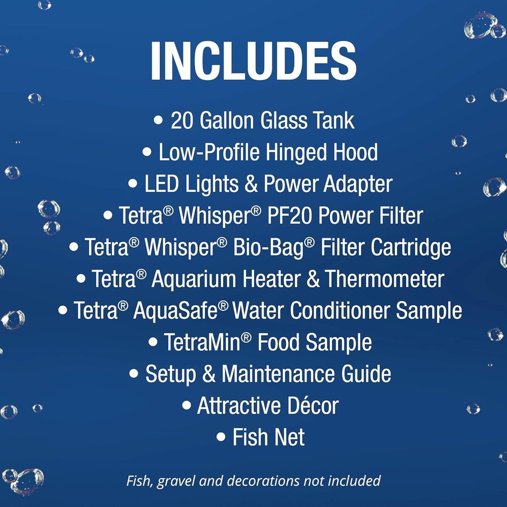 Aquarium, 20 Gallon, Complete Tropical Fish Tank Kit With LED Lighting And Decor For Freshwater Fish Item Description About this item Tetra Glass Aquariums are made in the USA and are built to last with scratch resistant glass The Tetra Aquarium comes loaded with an LED hood, that provides a natural daytime effect and a Whisper Filter that is whisper quiet while providing powerful, dependable water flow Artificial Plants add a unique, natural ocean feel while giving your fish a place to hide which reduces fish stress The Tetra Kit includes: one 20 Gallon Glass Aquarium, one LED hood, one Tetra Mini UL Heater, one Tetra Whisper 20 Filter, one artificial Boxwood Plant Mat, four artificial plants. Add gravel and fish to complete your aquarium Aquarium Dimensions: 24.2" L x 12.4" W x 16.7" H Complete LED Aquarium Kit comes with items you need to create a healthy home for your fish. This complete kit includes a 20-gallon glass aquarium, a low-profile, hinged hood with LED lighting system, the Tetra Whisper PF20 Power Filter with a Tetra Whisper Bio-Bag Filter Cartridge, a Tetra Aquarium heater and thermometer, AquaSafe water conditioner sample, TetraMin food sample and a setup and maintenance guide. The included Tetra Internal Filtration System features mechanical filtration to catch debris and chemical filtration with Ultra-Activated Carbon for removal of odors, discoloration and toxins. The energy-efficient LED Lighting system gives you a beautiful natural daylight effect. Approximate dimensions 24 inches x 12 inches x 16 inches. Attractive artificial plants add a natural ocean feel. Add gravel and fish to complete your aquarium. Small aquariums are a great way to get started in the freshwater fishkeeping hobby, and with any new hobby involving living creatures, it is always best to learn as much as you can. When buying fish, ask your retailer for guidance in choosing the right fish for your size aquarium. Caution: Children under age 13 should have adult supervision with setup, maintenance and fish care.