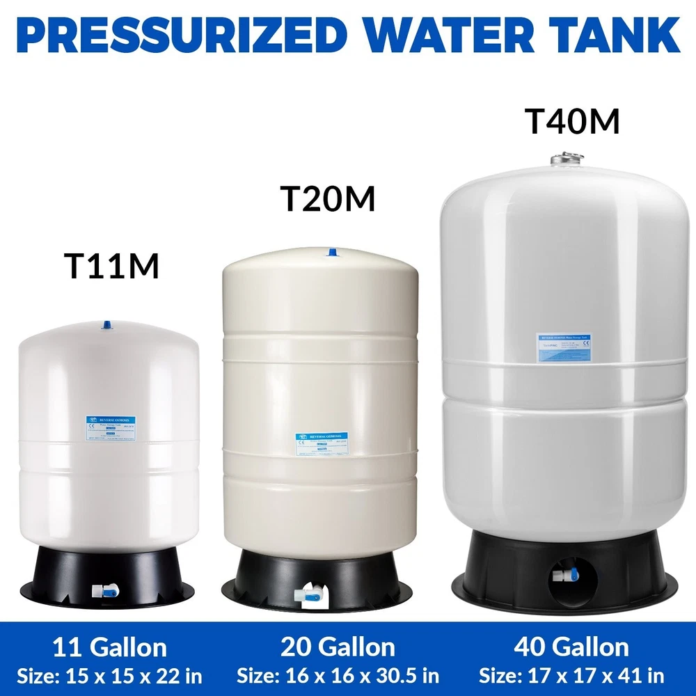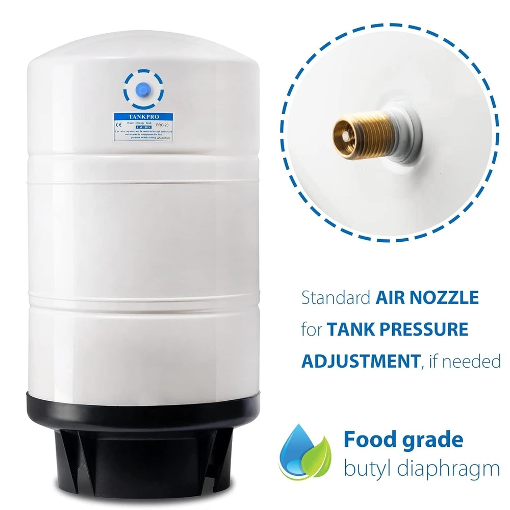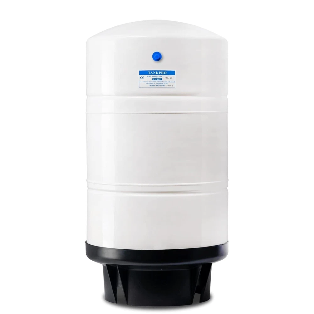 20 Gallon Pre-Pressurized Tank for Reverse Osmosis RO Systems with 14 gallons of Water Storage Capacity, 20, White The tank is made of quality materials (Tested by independent third-party to meet NSF and ANSI Standards) Include everything you need Shut-off valve, tank connector, and tank stand are included Flexible position The tank works efficiently in either vertical or horizontal position Peace of Mind Customer Service Register online to activate your manufacturer satisfaction and life-time free tech support. We stand behind our products and if you encounter any problems please reach out to us immediately. We are happy to help Water goes through a reverse osmosis membrane very slowly and people don't have the patience to wait a long time to get a cup of water. For this reason the residential RO units need a water storage tank to store the purified water. The RO tanks can deliver stable and constant water flow when the faucet is opened. The concern that pollutants might come from air or animals with the use of an open tank favors the use of a closed expansion tank. Lead leaching into drinking water causes health risk, brass and copper are banned from bing used in purified/drinking water. This tank uses stainless steel connections to avoid the lead leaching concerns. This tank is tested by independent third-party to meet NSF/ANSI Standard, and CE approved under the PED (pressure equipment directive).Features:Stainless steel connection built for Reverse Osmosis water storage tank; pump tank & thermal tank applications. Brass cap with internal O-ring SATISFACTION GUARANTEEs no air loss from air-vent. Smooth internal air vent cap prevents diaphragm damages. High-grade butyl diaphragm, post-cure procedure insures a tasteless and odorless water chamber Tested by independent third-party to meet NSF/ANSI Standard. Specifications & Dimensions:Height: 28\", Diameter: 15\" Tank size: 20 gallons (14 G water + 6 G air) Shipping weight: 31 LBS Packing dimension: 16w x 16d x 30h