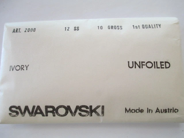 This auction is offering Two 10 gross packs vintage Swarovski Flatback Rhinestones. Stones are Ivory, A2000, Size SS12. These are unopened packs. Stones are in unused excellent condition as they have been stored safely in their package. Brilliant sparkle and shine. All auctions are 100% or your money back! Thanks for looking.