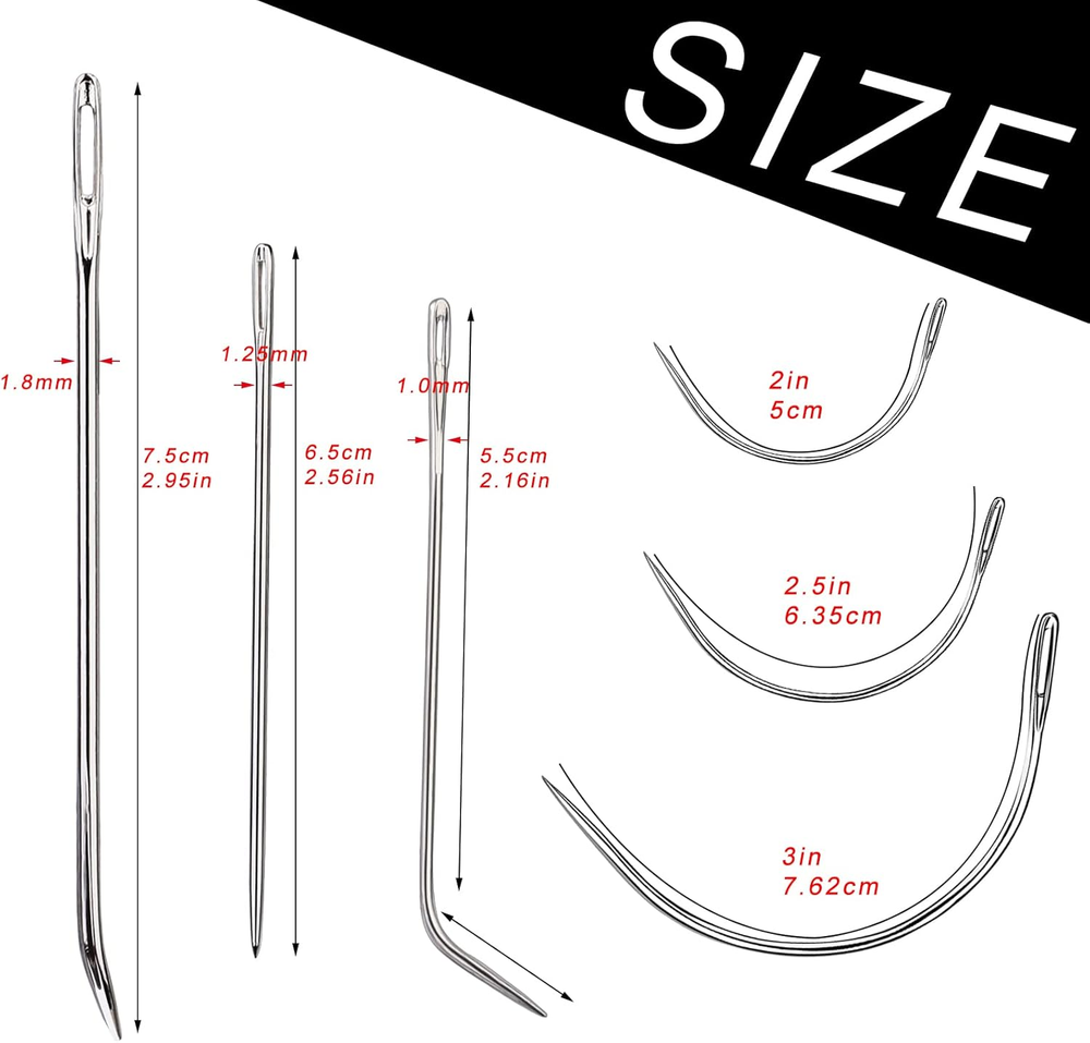 Leather sewing needle set: You will get 20 pcs needles of various sizes and shapes, 3* pointed hand sewing needle, 8* sack needle (2sizes), 9* curved needles (3sizes), various kinds of needles to meet your different needs. Combination needle size: Pointed hand sewing needle: 2.55 inch, sack needle: 2.16 inch/2.95 inch, curved needles:2 inch /2.5 inch/3 inch, The dimensions are all manually measured, and there may be slight errors. High quality: Made of high-quality materials, smooth, not easy to rust, and durable. Sack needles suitable for sewing sacks, hand stitching needles can be used for most sewing, curved needles are used for repairing, making upholstery in furniture manufacturing, such as mattress manufacturing. New upgrade: Different from the general sewing needle combination, after investigation, our new combination provide more commonly used styles and sizes of needles, which is more in line with the habits of most people, and hope to bring you convenience. Widely use: Leather needles used for hand sewing are very suitable for leather, upholstery, carpets, coats, canvas, sacks, bags, etc. Note: Please keep it out of the reach of children, sharp needles, be careful when disassembling and using. Product description Leather Needles for Hand Sewing Sewing Sharp Needles Easy to Use Work Great- leather needles They are really easy to push through fabric and return it without having to reverse it, make the repair work easier and more effective. Wide Uses leather needles used for hand sewing are very suitable for mattresses, leather, upholstery, carpets, coats, tents, canvas, sacks, bags, etc, but also for making bags, repairing baskets, sofas, furniture, etc. The multifunctional needle kit can make your life more convenient. Leather Sewing Needles Add to Cart Add to Cart Add to Cart Add to Cart Customer Reviews 4.6 out of 5 stars 1,152 4.6 out of 5 stars 1,152 4.6 out of 5 stars 1,152 4.6 out of 5 stars 1,152 Price $3.96 $ 3 . 96 $3.20 $ 3 . 20 $4.78 $ 4 . 78 $4.68 $ 4 . 68 Arts, Crafts & Sewing ✔ ✔ ✔ ✔ Sewing Sharp Needles ✔ ✔ ✔ ✔ for Home Upholstery ✔ ✔ ✔ ✔ Wide Uses ✔ ✔ ✔ ✔ Easy to Use ✔ ✔ ✔ ✔
