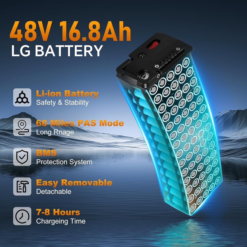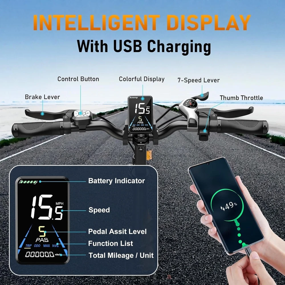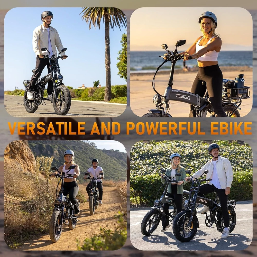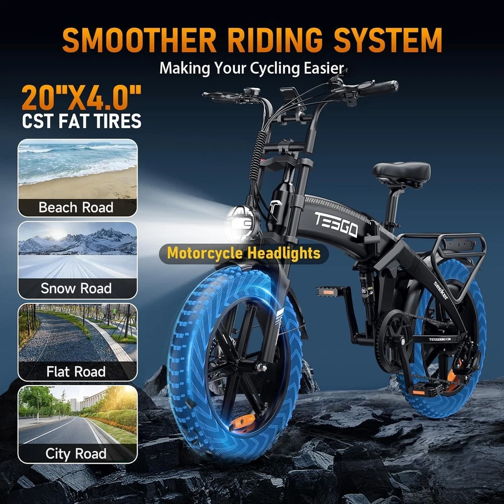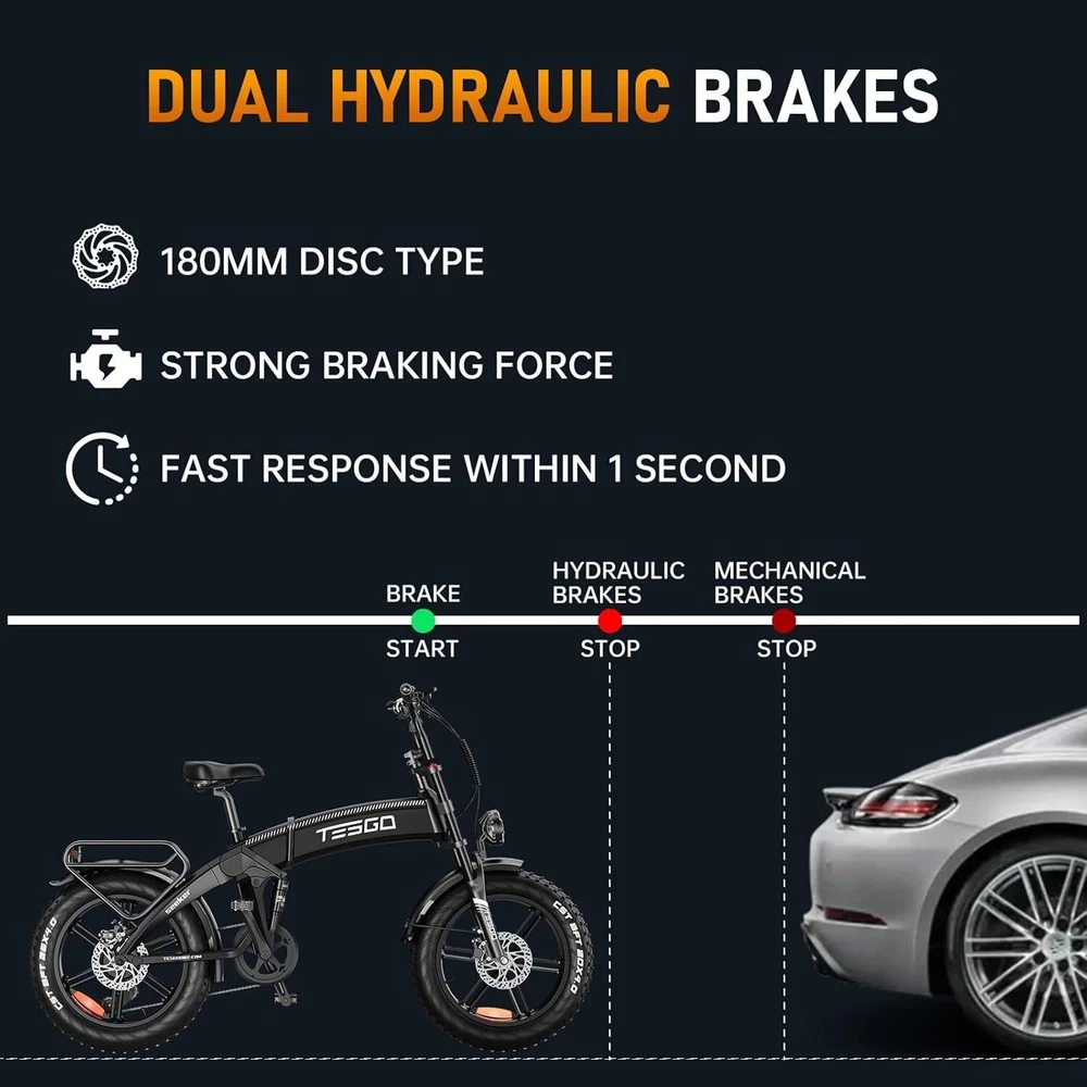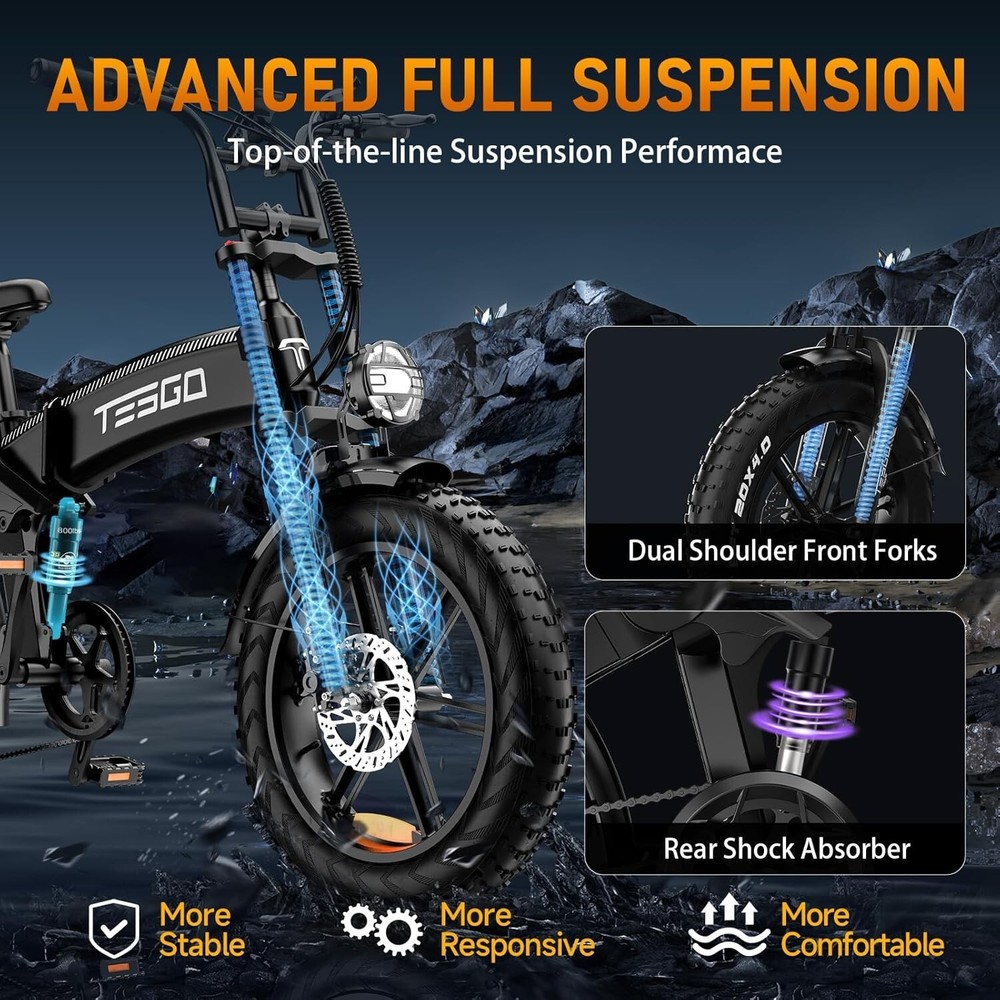 About this item 【2024 NEWLY FULL SUSPENSION SYSTEM】The Seeker-Pro fat tire electric bike features advanced full suspension system extending from double-shoulder front forks to the rear air shock. Double-shoulder forks provide improved performance by distributing impact and absorbing shocks more effectively. Rear Air suspension absorbs bumps very effectively,you also can adjust the air pressure for a personalized ride. 【1000W POWERFUL MOTOR】The powerful 1000W rated power(peak 1500W) geared hub motor ensures improved climbing ability, allowing you to reach speeds of up to 28mph in pure electric mode. It effortlessly conquers gradients of up to 35 degrees, while the 7-speed gear system provides versatility for all your riding and training needs. The 1000W electric bike also features motocycle brighter LED headlights and taillights for enhanced visibility and safety during nighttime rides. 【ENHANCED RANGE with LG BATTERY】Equipped with famous brand LG battery consisting of 65 cells, this adult electric bike features a powerful 48V/16.8AH lithium battery that supports long-range trips. With a range of 55-70km (35-45 miles) for pure electric mode and an impressive 80-95km (50-60 miles) for PAS mode, this e-bike ensures you can confidently commute to work, embark on weekend adventures, or simply enjoy leisurely rides around town. The removable battery allows for convenient charging. 【LCD DISPLAY & HYDRAULIC BRAKES SYSTEM】This folding ebike also comes with an advanced LCD display that offers real-time metrics, adjustable parameters, and a variety of trip-tracking options.The advanced HYDRAULIC DUAL BRAKES system significantly reduces the average braking distance by 50% compared to traditional mechanical brakes.This ensures a safer ride in a variety of conditions. 【 UNIQUE ONE-PIECE ARC FRAME】The TESGO Seeker/Seeker Pro e-bike 1000w adopted an innovative and optimized frame design. Constructed using the one-piece casting screwless connecting rod structure technology, this frame offers unparalleled advantages. Not only does it enhance the bike’s visual appeal, but it also provides superior strength and durability. Note: Our products have been certified under UL2849 safety standards. The item is UL 2849 certified with a link to the UL Product iQ Product Description 1500W Full Suspension Electric Bike| Folding Ebike | 20" All-terrain Fat Tires Play Video Previous page Next page 1500W POWERFUL SYSTEM DETACHABLE LG BATTERY ADVANCED FULL SUSPENSION RELIABLE HYDRAULIC BRAKES Previous page Next page 1 SMART AND CLEAR 2 ALL-TERRAIN FAT TIRE Previous page