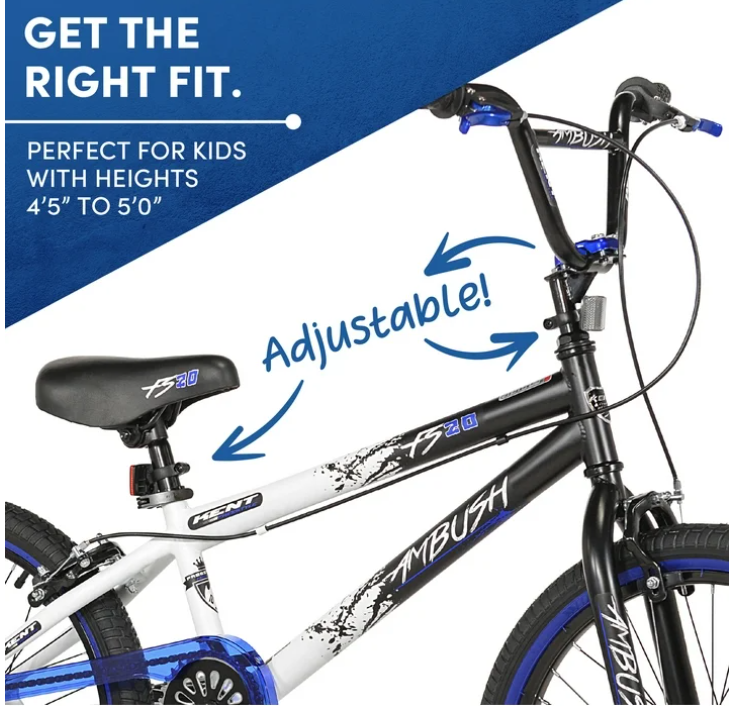 Our warehouse is located in the United States, so all orders will be shipped from within the U.S. If you need any assistance regarding your product or order, please feel free to message us. We will respond within 24 hours. 🚫 No Island Deliveries: We do not ship to island locations. 🚫 No Warehouse or Freight Forwarding Deliveries: Please note that we cannot deliver to warehouses or freight forwarding services. 🚫 No P.O. Box Deliveries: For tracking and security purposes, we do not deliver to P.O. Box addresses. We sincerely hope to provide you with a great shopping experience. Thank you very much! Product details For kids with a sense of adventure, the Kent 20" Ambush BMX Boy's child bicycle offers an amazingly smooth, stylish ride that will keep them entertained for hours of active fun. Made by Kent International, It has front and rear hand brakes for convenience and safety with grips and a padded adjustable saddle seat for sustained comfort and control. Optimized for amazing tricks, this blue Kent BMX bike boasts a four-bolt alloy stem, alloy rims and front pegs. It's also lightweight and sturdy with a durable, non-corrosive steel frame for extended use. The Kent 20" Ambush BMX Boy's Bike features a modern design, so boys will enjoy using it to ride on the neighborhood streets. TIG welded steel frame and steel fork Front and rear hand brakes BMX/Freestyle tires with colored sidewall. Quick-release adjustable saddle Front pegs included Adjustable stem & handlebar Recommended age: 7+ years Recommended height: 4'5" to 5'0" Max rider weight: 105lbs Recommended Inseam: 19" - 25" 20" BMX bike available colors: white/black/ red, white/blue/black, white/green/black Ideal for child/tween males 20" Child Bicycle