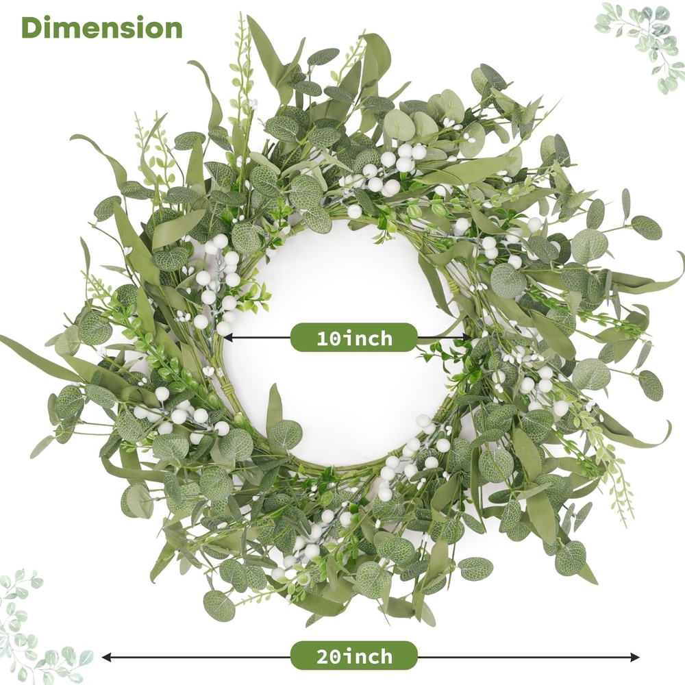Green Eucalyptus Leaf Wreath, 20 Inch Artificial Spring Summer Wreaths for Front Door Decor Rich, Realistic Handmade Appeal Our hand - crafted eucalyptus wreath is truly something special! Packed with eucalyptus leaves, boxwood, and delicate white berries, it looks incredibly full and natural. It's so realistic, you'll feel like you've brought a piece of nature indoors. Its beauty will instantly brighten up your home, creating a warm and inviting atmosphere. Ideal Size and Gift - Worthy Measuring 20 inches in diameter, this wreath is perfect for any space. It comes in a sturdy, elegant box, making it an ideal gift for your friends. During shipping, it's compressed to keep it safe. But don't worry! Just give it a good stretch, and it'll reach its full, glorious size. Incredibly Versatile Decor This wreath is a decorator's dream! It's suitable for every season of the year. Add maple leaves for a touch of fall, or bells for a festive winter look. You can customize it however you like, and it'll always be the most unique piece in your home. Hang it on the wall, front door, porch, or in any room like the bedroom or living room. Whether it's an indoor or outdoor event, like a wedding or a party, this wreath will make a statement and impress everyone. Exceptionally Durable Crafted from top - notch materials, this wreath is built to last. The colors won't fade over time, the leaves won't fall off, and the berries won't rot. There's no need for watering or any special cleaning. You can enjoy its beauty for years to come, without any hassle. We're Here to Help If you have any issues with our product, don't hesitate! right away, and we'll get back to you as soon as possible. Your satisfaction is our top priority. 【Rich, Realistic Handmade Appeal】Our hand - crafted eucalyptus wreath is truly something special! Packed with eucalyptus leaves, boxwood, and delicate white berries, it looks incredibly full and natural. It's so realistic, you'll feel like you've brought a piece of nature indoors. Its beauty will instantly brighten up your home, creating a warm and inviting atmosphere 【Ideal Size and Gift - Worthy】Measuring 20 inches in diameter, this wreath is perfect for any space. It comes in a sturdy, elegant box, making it an ideal gift for your friends. During shipping, it's compressed to keep it safe. But don't worry! Just give it a good stretch, and it'll reach its full, glorious size 【Incredibly Versatile Decor】This wreath is a decorator's dream! It's suitable for every season of the year. Add maple leaves for a touch of fall, or bells for a festive winter look. You can customize it however you like, and it'll always be the most unique piece in your home. Hang it on the wall, front door, porch, or in any room like the bedroom or living room. Whether it's an indoor or outdoor event, like a wedding or a party, this wreath will make a statement and impress everyone 【Exceptionally Durable】Crafted from top - notch materials, this wreath is built to last. The colors won't fade over time, the leaves won't fall off, and the berries won't rot. There's no need for watering or any special cleaning. You can enjoy its beauty for years to come, without any hassle 【We're Here to Help】If you have any issues with our product, don't hesitate! right away, and we'll get back to you as soon as possible. Your satisfaction is our top priority