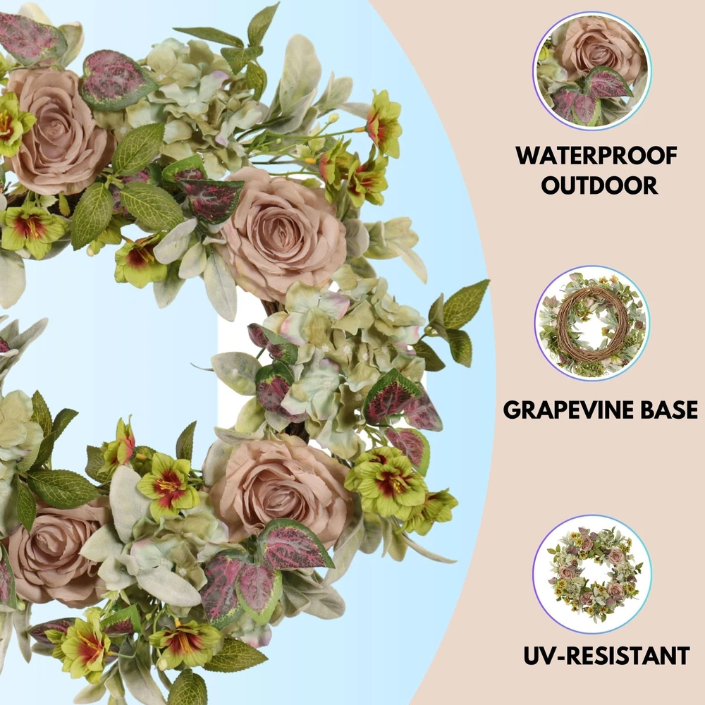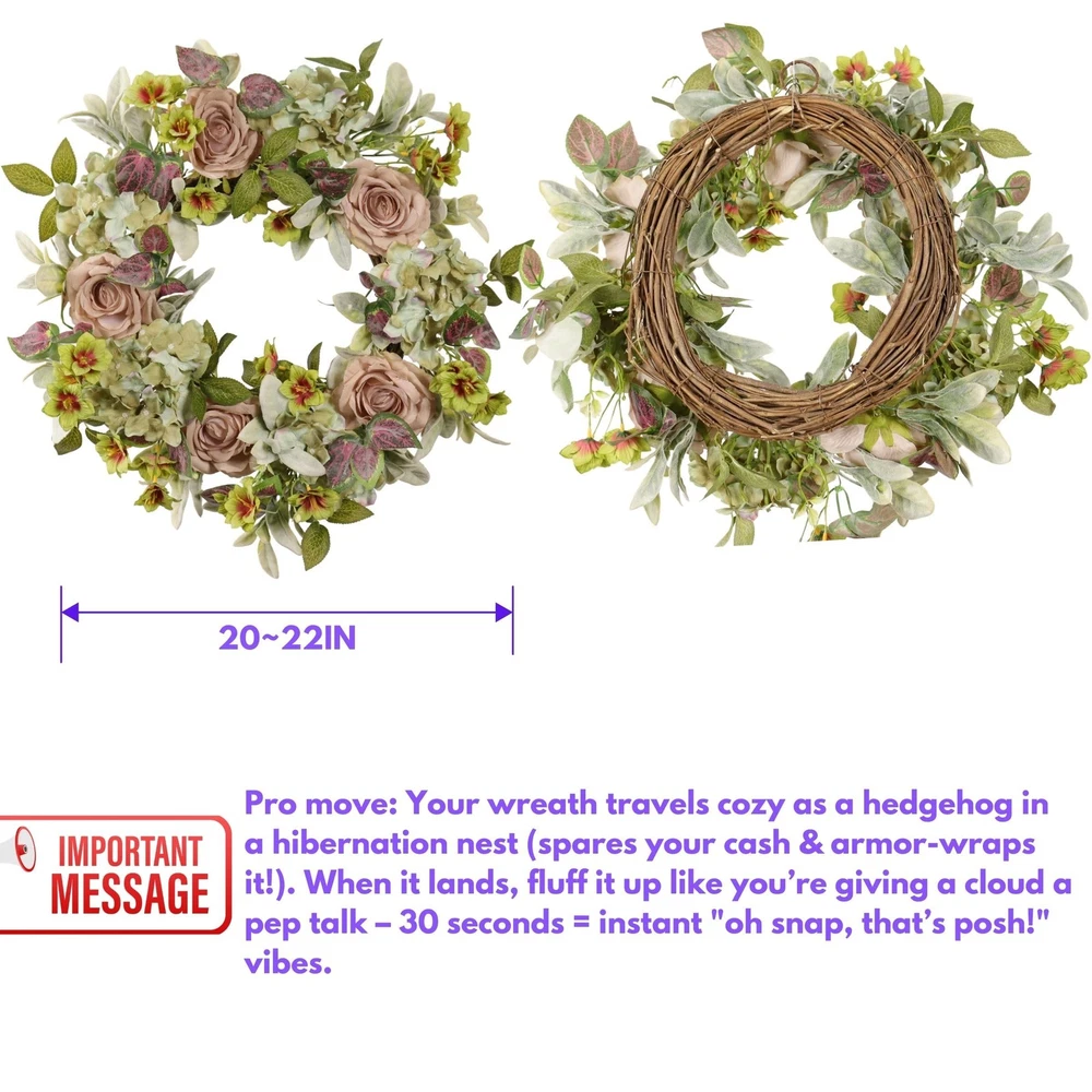 Welcome the beauty of spring & summer with our handcrafted 20-inch floral wreath! Featuring realistic hydrangeas, roses, and lush greenery, this elegant artificial wreath is the perfect addition to your front door, mantel, or indoor & outdoor décor. Whether you want to refresh your home’s entrance or create a warm, inviting atmosphere, this seasonal wreath is the perfect choice. Why Choose Our Floral Wreath? ✔ Lifelike & Handcrafted – Designed with premium artificial flowers & greenery, ensuring a full, lush appearance that lasts year after year. ✔ Versatile for Any Space – Ideal for your front door, entryway, living room, or even as a wedding wreath. ✔ Seasonal Charm – A timeless decoration for Mother’s Day, Easter, summer parties, and rustic farmhouse themes. ✔ Easy to Maintain – No need for watering or special care – just effortless elegance! Perfect for Gifting & Decorating Surprise your loved ones with this stunning summer floral wreath—a thoughtful gift for housewarmings, holidays, and special occasions Lush Spring & Summer Wreath Adorned with vibrant hydrangeas, elegant roses, and lush greenery, this 20-inch floral wreath brings a fresh and charming touch to your front door, window, or wall decor. Perfect for spring, summer, and seasonal home décor Handcrafted Realistic Design – Made with high-quality artificial flowers and lifelike foliage, this farmhouse-style wreath features delicate textures and intricate details, creating an inviting atmosphere for any modern farmhouse or rustic home Versatile Indoor & Outdoor Use – Whether for your front door, entryway, mantel, or living room, this durable outdoor wreath withstands various weather conditions while maintaining its beauty all season long. Ideal for Mother’s Day, Easter, weddings, and housewarming gifts. Perfect Gift & Seasonal Accent – Looking for a stunning gift idea? This rustic yet elegant greenery wreath makes a thoughtful present for loved ones on special occasions, complementing spring and summer home decor with a touch of natural charm Easy Maintenance & Long-Lasting – Unlike real flowers, this artificial floral wreath stays fresh and vibrant all year round. No watering, no wilting – just effortless beauty! Hang it directly or enhance it with LED lights for a cozy ambiance.