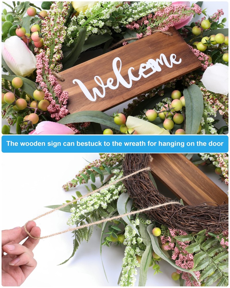 Wreaths for Front Door 20 Inch Tulip Wreath withTulip,Berries,Boxwood and Cattails Welcome Door Wreath, Porch, Window - Green Decor for Home, Farmhouse - Spring, Summer, Fall, All Seasons 【Full and realistic】 Green eucalyptus leaf wreaths hand - made by Wish Wreaths,features eucalyptus leaves, tulip,green berries, andmany Made from lots of small berries in various colors, these look like cattails embellishedon it, making the wreath full, natural and realistic. Its elegance add a vibrant and pleasant vibe to your home. 【Perfect Size】 This spring wreath is 20 inches in diameter. Each rustic farmhouse eucalyptus wreath is packed in a sturdy and exquisite box, suitable as a gift for friends. Note that because the wreath is compressed by the box to avoid being damaged during delivery, please fully stretch it to reach its maximum size. 【Versatile】 It is suitable for all seasons of the year, spring, summer, fall and winter. You can add elements of each season on it, such as maple leaves, bells, etc. welcome wreaths It comes with a solid wood "welcome" sign. You can use it in cafes, restaurants, malls, and more. And you can DIY it however you like! When you design it yourself, you will find that your wreath is the most unique scenery 【Durable】Made of high-quality materials. Colors will never fade; leaves will never fall; berries will never rot.The base of the front door wreath is made of Anatural grapevine base, which is solid and not prone to falling off, ensuring lasting stability. It can be hung on the wall, front door, porch, bedroom, living room, etc. It is perfect for indoor and outdoor, weddings and parties. It's elegance is sure to impress your family and friends. 【Guarantee】: All our spring wreaths for front door are guaranteed by quality,And every wreath is handmade. If there are any problems with our products, please 【contact us】 at the first time, we will definitely give a perfect answer. Elegant 20-Inch Tulip Wreath: Handcrafted Masterpiece for Your Home Add a touch of timeless elegance to your home with our 20-inch tulip wreath. Made with premium silk tulips and a sturdy grapevine base, this handcrafted beauty is designed to last. Perfect for doors, walls, and centerpieces, it offers vibrant color and sophisticated charm year-round. Whether adorning your entryway or enhancing your indoor decor, this exquisite wreath promises to infuse any space with grace and style. Experience the superior craftsmanship and lasting appeal of our elegant tulip wreath today. SHIPPING Domestic Buyers - We have confidence in our products, but if you are not fully satisfied please contact us within 30 days of purchase and you will get full refund. - We ship within 3 business days of payment, usually sooner - We offer FREE shipping on all orders! - We only ship to the lower 48 states, no APO/FPO addresses or PO Boxes allowed International buyers – please note: Import duties, taxes, and charges aren't included in the item price or postage cost. These charges are the buyer's responsibility. - Please check with your country's customs office to determine what these additional costs will be prior to bidding or buying. * Order Cancellation Policy ** You can return a product for up to 30 days from the date you purchased it. 1. The seller reserves the right to cancel the special case only due to eBay cancellation fee. 2. The decision of seller is the final. 3. The seller will respond to the cancellation request within 2 business days. Please wait for the result of cancellation. 4. In case the cancellation is not completed by some reasons, the buyer can follow the options below to get the refund. 4.1 The buyer can reject the item when it arrives. 4.2 The buyer can send the item back to the seller within 30 days If the buyer receives item (USA Shipment ONLY). The seller will provide the FREE return label to the buyer when the buyer opens " Return Item" case on eBay by using the reason as "Change my mind" ONLY. 5. When buyer has placed the order. The order will be processed and completed by automatic warehouse system within 5 minutes. In case that buyer sends the cancellation request after 5 minutes of placing the order, the request will be rejected. **Sending direct message to cancel the order is not allowed for every case.* Return Policy For the return case - If buyer would like to return the items for refund or replacement, please CONTACT SELLER to receive the free return label from seller. The refund or replacement will be processed with the tracking number of return label which is provided by seller only. The other ways of return which are not approved by seller will not be processed for the refund or replacement.