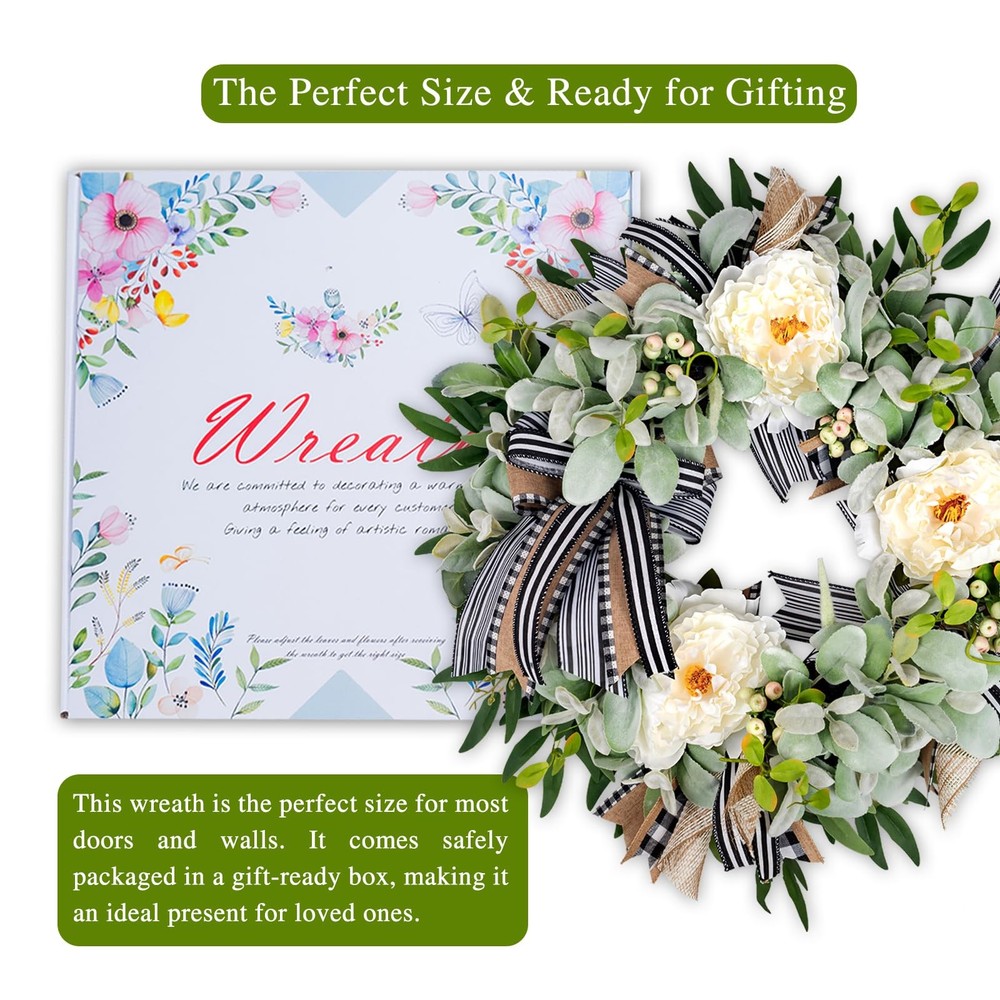This handcrafted premium peony wreath brings the beauty of nature into your home, perfect for year-round display with a unique and elegant style. Featuring three large, realistic white peonies, delicate berries, and soft lamb’s ear leaves, this wreath front door creates a rich, layered look that perfectly balances simplicity and sophistication. The classic black-and-white buffalo plaid bow adds a touch of modern charm, making it a focal point in any setting. Whether celebrating a holiday, enhancing your front door décor, or adding ambiance to special occasions, this door wreath brings warmth and elegance to your space. Ideal as wreaths for front door, this versatile design fits seamlessly with any season or home style. Perfect for spring wreaths for front door, it can also be displayed year-round, making it a standout front door wreath for all seasons. Whether used as a winter wreath, lamb's ear wreath, or farmhouse wreath, it complements your décor beautifully. This artificial wreath is designed for both indoor and outdoor wreath use, making it a perfect door wreath for front door outside. Lambs Ear Wreaths for Front Door All Season:Enhance your home with the unique beauty of nature. This handcrafted wreath brings a touch of elegance with a design that’s perfect for every season. Not only ideal for holidays and seasonal décor, but it’s also a wonderful accent to brighten everyday spaces. Bring this stunning wreath home today High-quality Materials: Featuring three large, realistic white peonies, delicate berries, and lush lamb’s ear leaves, this wreath offers rich layers and a unique design that showcases the refined beauty of nature Artificial Spring Summer Farmhouse Wreath: A classic black-and-white buffalo plaid bow adds a stylish, timeless touch, making this wreath versatile for various settings Front Door Wreath for Home Decor:Whether displayed on your front door, in the living room, porch, fireplace, dining room, or for special occasions like Thanksgiving, Birthdays, Mother's Day or Christmas, this wreath effortlessly elevates any space Gift Box:It arrives in gift-ready packaging and is an excellent gift choice. Just adjust the lamb’s ear leaves and bow upon receiving for the perfect look