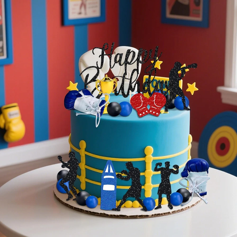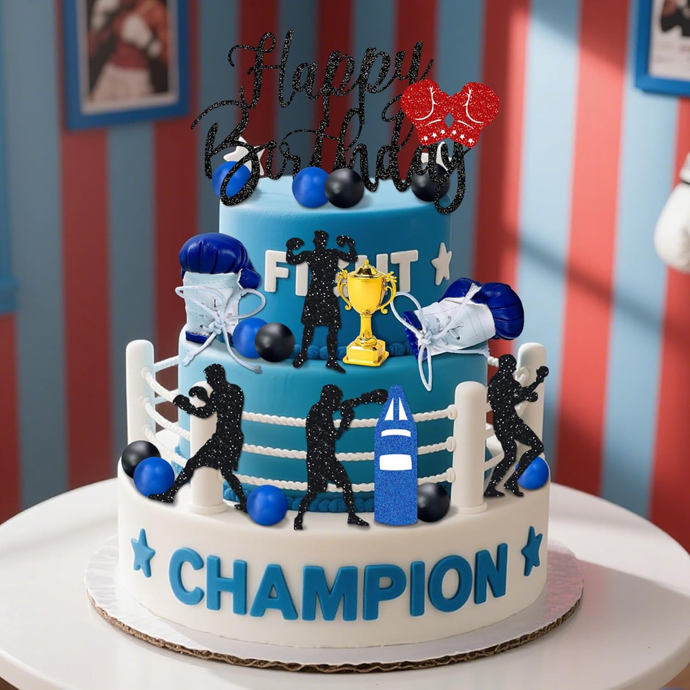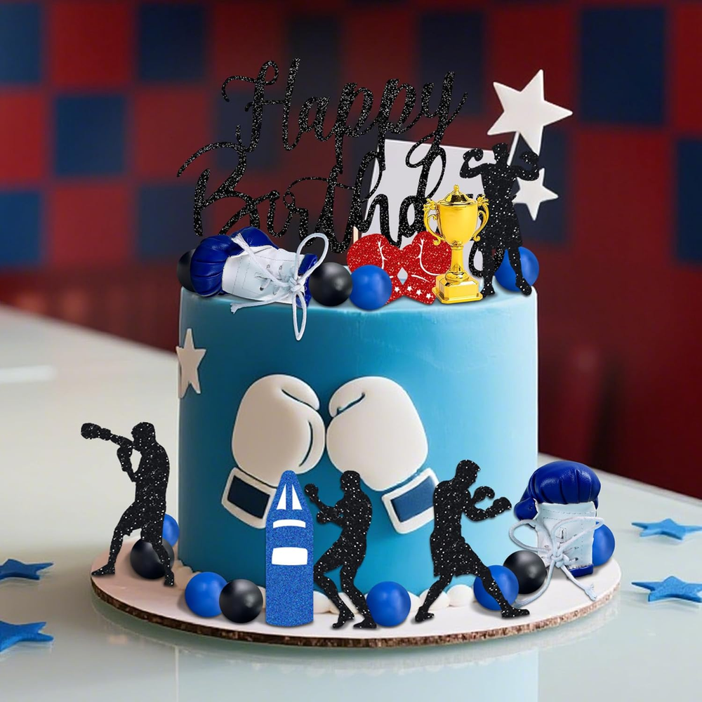 Boxer Birthday Cake Decoration will make anyone want to lace up their gloves and have a boxing-themed party! You will get: 6 x boxing cake decorations, 2 x boxing gloves cake topper, 10 x ball cake toppers(blue,black), 1 X trophy cake topper,1 X Happy birthday cake topper,Product size as shown in the picture! Adorn your dessert table with the perfect Boxing Party decor by adding this Fight Cake Decoration. Easy to assemble:You need spend 1 - 2 minutes to assemble. Product description