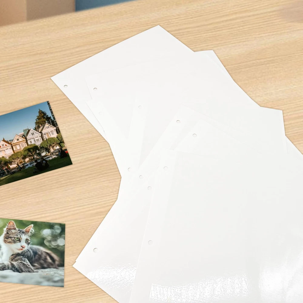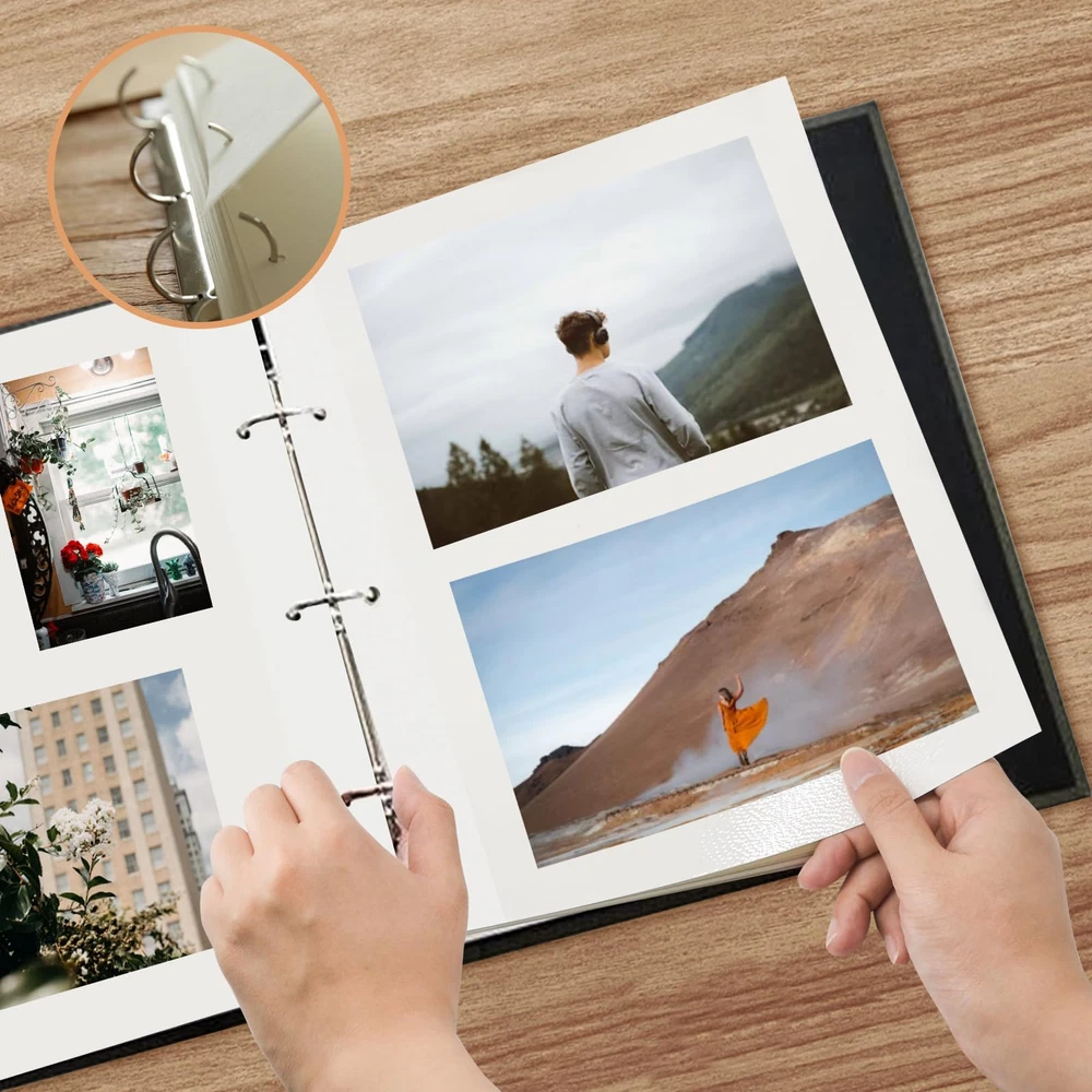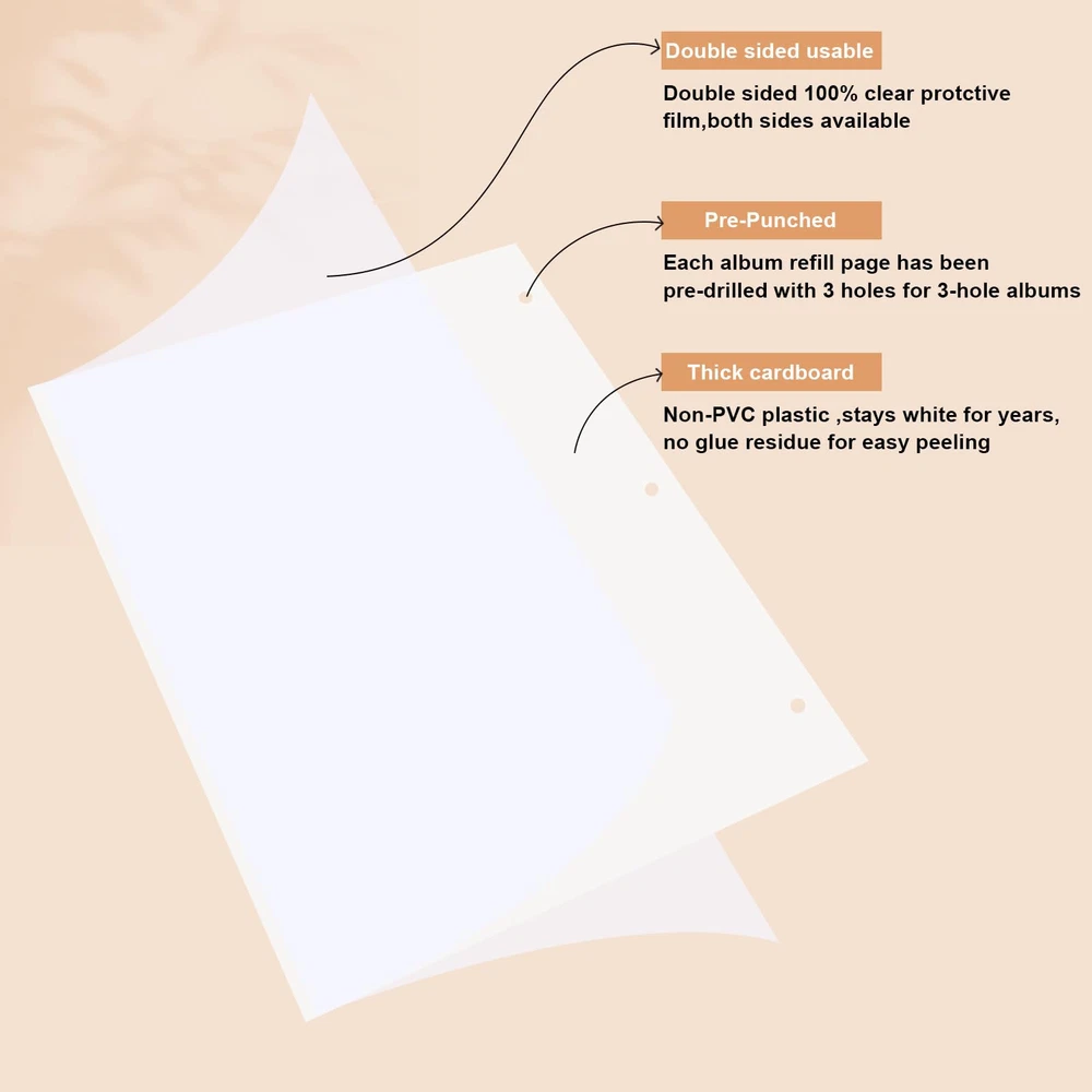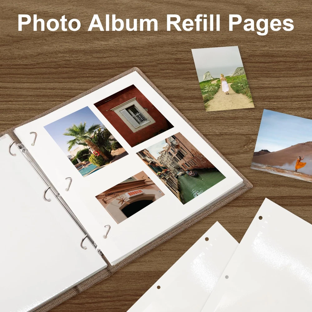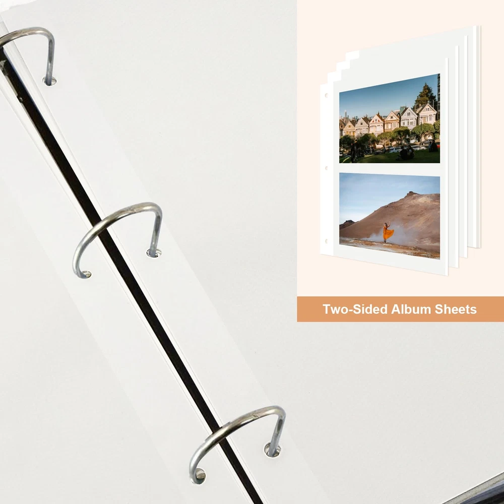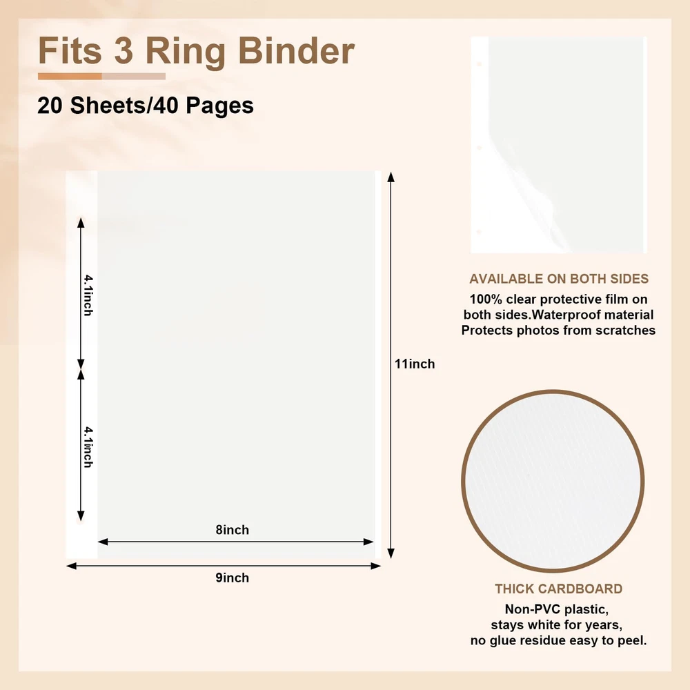 These 11 x 9 inch waterproof photo album pages are designed to fit perfectly in a 3 ring binder, protecting photos from moisture and dust. Our photo album refill sheets could accommodate a range of photo sizes, including 2x3, 4x6, 5x7, and 8x10. This versatility allows you to store a mix of different sized photos in one album. Add or remove pages as needed with the three-ring design, giving you the flexibility to customize your album as desired. The photo pages feature a self-adhesive design, making it quick and easy to secure your photos without the need for glue or tape. Simply peel off the protective backing and press your photos onto the page. Rest assured, if you're not satisfied with this item at anytime within 30 days of purchase, we'll provide a refund or replacement. Please contact us if you encounter any problems in use, we will reply within 24 hours.