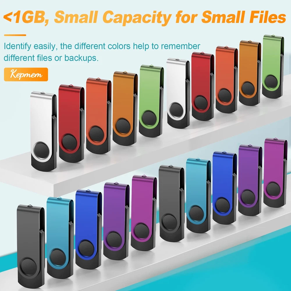 【Small Capacity, Not GB】Including pack of 20 multi-colors USB 2.0 thumb drives 64MB in metal swivel design. Different colors flash drives can help you to store different files. Small Capacity great for sewing machine, embroidery and other special use, allow you to store small capacity files. Please confirm the free space you need before buying. Custom logo service starting from 50pack. 【Save Time to Upload Files to Email】Plug and play, no require for installing a driver. Keep your files safety, record memories of your time. Portable 64 MB USB drive is suitable for storing, transferring and sharing digital data for work, school, business, daily usage or traveling. Such as music, photos, personal and documents, movies, pictures, books, programs, presentations, designs etc. 【Valid Usage and Storage Freedom】: swivel USB 64MB flash drive can be used in computer, TV, speaker, computer, notebook, car audio and other USB devices. Support Windows 7/8/10, Windows Vista, Windows 2000, Mac OS X, Linux, etc. Save data of MP3, MP4, RMVB, EXCEL, WORD, PDF, Image and other files. Compatible with USB 2.0, backwards USB 1.1. 【Rotated Design, Safety and Easy Carrying. 】: Portable, samll and lightweight memory stick. Pen drive with 360° swivel metal cover to protect USB connector. The end of the jump drives has a loop that can easily be attached in your key chain, backpack, lanyard. Small size, keep your digital world in your pocket, take your data anywhere. 【Application】: Save time to upload files to email. Widely used in Schools, Colleges, Universities, Commercial, Education, Government, Agency, Media Industries, Engineering, Healthcare, Construction, CPA, Attorney, Photography and Other Use. Brand the flashdrives with your company's name and provide company's overview, policies, etc. to the newly joined employees or your customers.