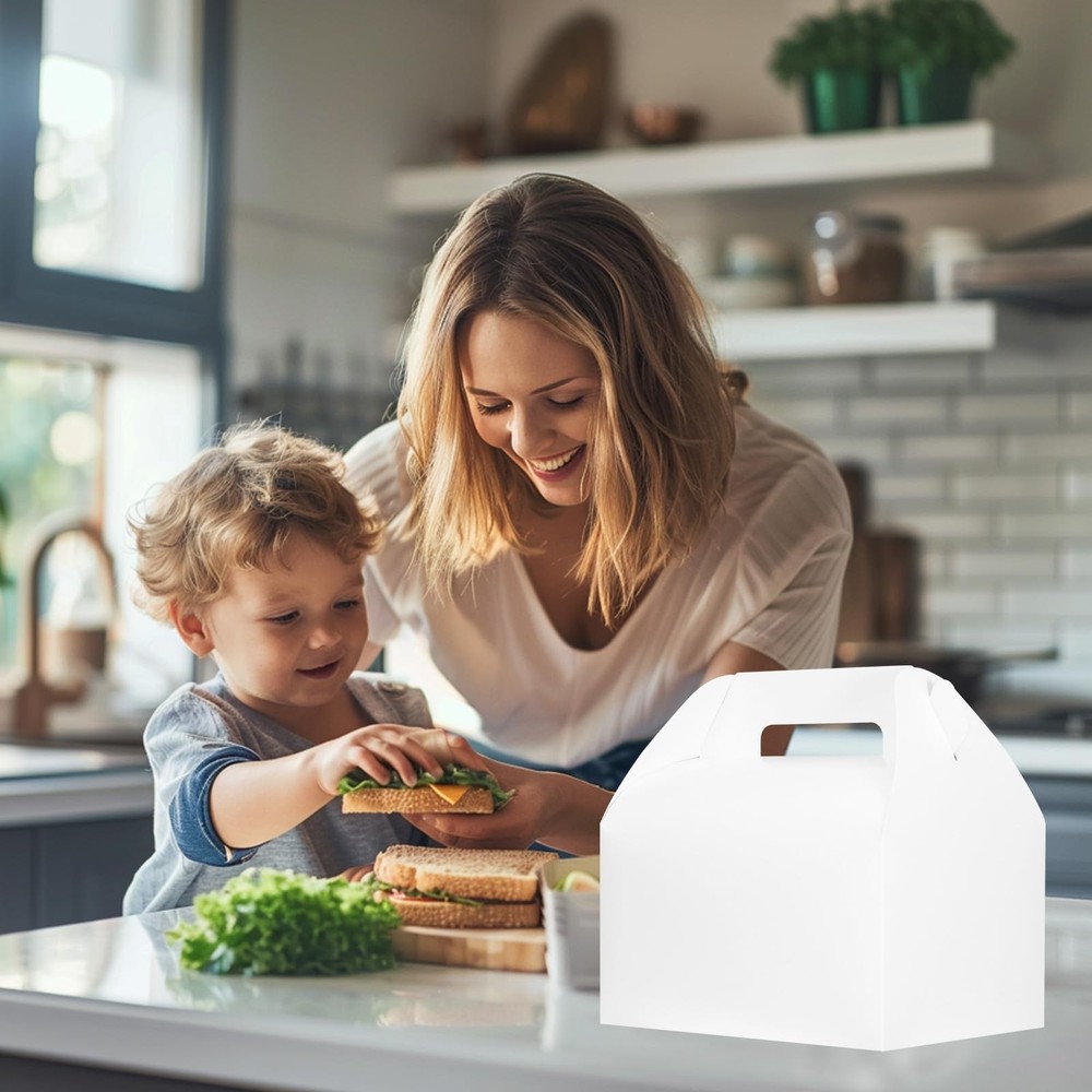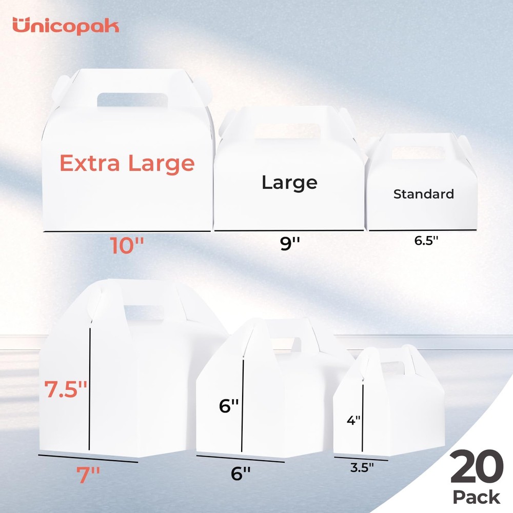original large gable boxes 10x7x7.5, pack of 20 value pack for daily use. 20 Pack Extra Large Gable Boxes - Including 20 white gable boxes, box internal dimensons are 10x7x7.5 inches, has plenty of space for gifts or goodies, perfect size for baked foods, meals, treats, candy, birthday gifts, wedding gifts, party gifts, return gifts, to go gifts, Christmas gifts High Quality Materials - These treat boxes are well made with premium white cardboard paper, thick and sturdy, great touch and odorless. The reinforced bottom can hold heavy stuffs like drinks without worrying about coming off and don't need to tape the box Pop-up Design Quick Assembly - These paper lunch boxes are easy to assemble in few seconds with the pop-up structure, has done half the work for you. No need to waste your time on assembling bakery boxes Elegant Practical Boxes Fit Any Occasions - Just a little freestyle decoration with markers or stickers, it would become a stunning gift box for birthday party, wedding, celebration, graduation, baby shower, holidays, Christmas, or go for picnic and outdoor activity QUALITY GUARANTEED By - The perfect mate for your gifts! is committed to producing high-quality packaging products for everyone, hoping our boxes can bring you surprises and joy