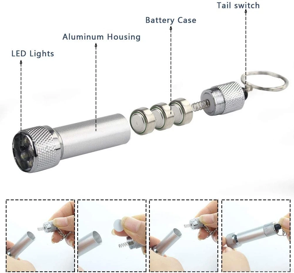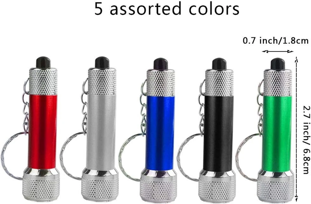 Easy to Use: Open up the flashlight case, and take out a round white slices, then tighten them up. Press the top button of flashlight, it will be on working. Note: The round white piece is a insulating sheet, so it has to be taken out, then the flashlight will work. Light Cover: These pocket flashlight keychains adopt aluminum alloy and ABS material, lightweight and exquisite, sturdy and handy. Suitable for kids, parents, grandparents. 5 LED Bulb: Equipped with 5 LED, which can provide adequate beam for safe walking in the night or along the hallway, checking stuff inside your bag or cabinet. Quantity You Will Get: Package includes 20pcs mini LED flashlights, which contains 5 colors, silver, black, red, blue, green. Each color 4pcs. Dimension: 2.7 x 0.7 inch/ 6.8 x 1.8cm. Widely Applied Occasions: Double hoop ensure the safety that will not lost. Can be used for kids camping, party gathering, game material. Also perfect for all ages, like kids, teens, adults, and seniors. Specification Material: Aluminum alloy & ABS Size: 2.7 x 0.7 inch/ 6.8 x 1.8cm (L*D) Color: Silver, black, red, blue, green Quantity: 20pcs Package includes: 4 x Silver Mini LED Flashlights 4 x Red Mini LED Flashlights 4 x Blue Mini LED Flashlights 4 x Green Mini LED Flashlights 4 x Black Mini LED Flashlights
