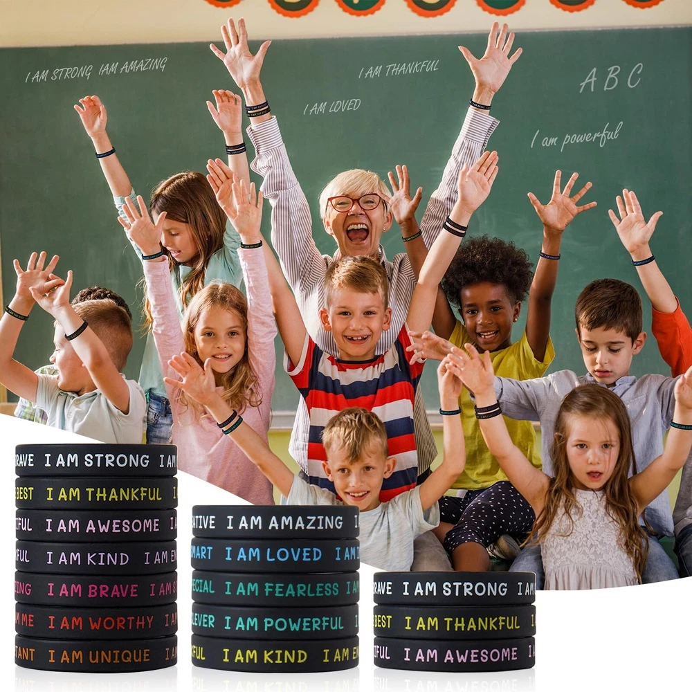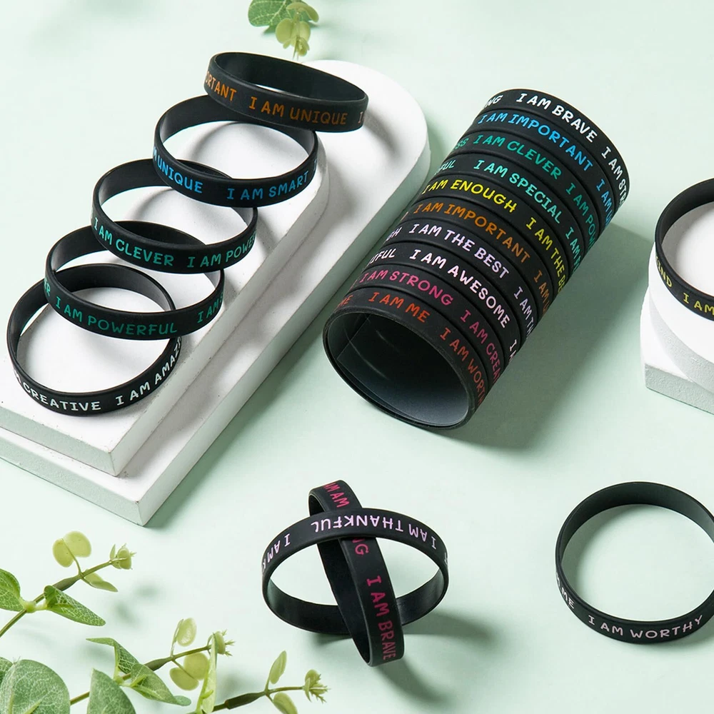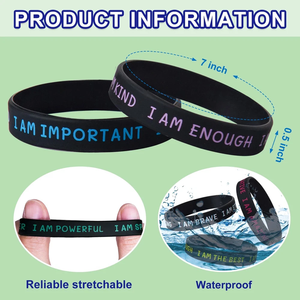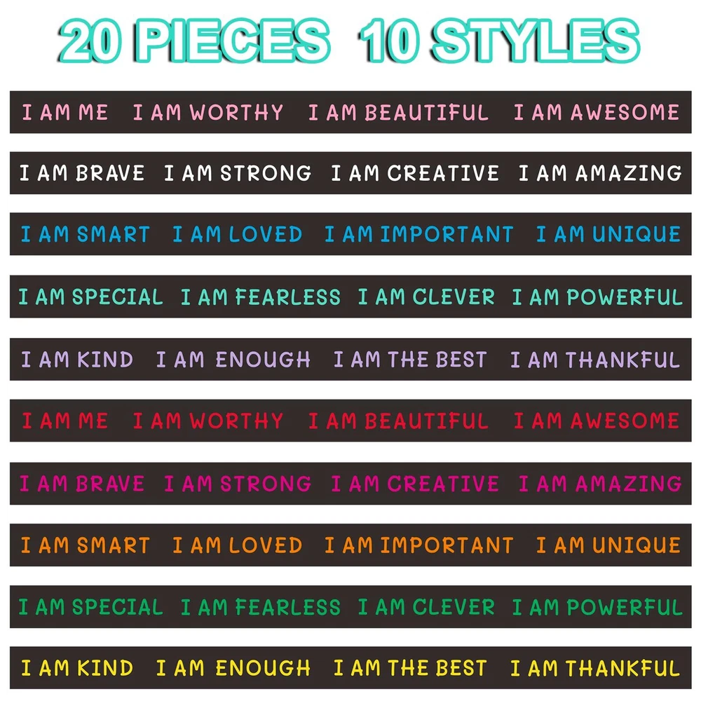 Stay Positive-Inspirational Wristband Set–You will get 20 inspirational rubber wristbands in 10 different styles, 2 of each style, a quantity enough for you to wear daily and share with your friends. Motivational Quotes Designs: I AM ME,I AM WORTHY,I AM BEAUTIFUL, I AM AWESOME,I AM BRAVE,I AM STRONG,I AM CREATIVE,I AM AMAZING,I AM SMART,I AM LOVED,I AM IMPORTANT,I AM UNIQUE and more show off your attitude and make you look cool and attractive! Sending Your Love: the silicone wristbands are inspirational presents for your kids, friends, daughters, nieces, neighbors and classmates on birthday, graduation, first day of school, important festivals and big event celebrations, presenting your sincere blessings of keeping active attitudes HIGH SILICONE MATERIAL: The inspirational rubber bracelet is made of silicone material, soft and comfortable, 2.3 inch in diameter and 0.5 inch wide, suitable for chirldren and teens. Wide range of applications: The inspirational silicone bracelets come in different colors and are colorful and full of cheerfulness, suitable for birthday parties, student sports, family gatherings, school events, classroom prizes, carnivals, music festivals and other occasions.
