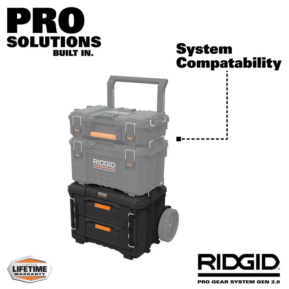Features 2 deep drawers to store large and small-sized tools Made of high-impact resin to ensure durable use Padded handle offers a comfortable carrying experience The RIDGID 22 in. Pro Gear 2.0 XL 2 Drawer is made with high-impact resin for long-lasting performance. This Tool organizer is the most versatile and durable toolbox for any job site or worksite. This unique design offers 2 deep drawers to store large and small-sized tools with maximum ease and convenience. This RIDGID's Pro Gear 2.0 Tool box is a half-footprint connectivity with metal ball-bearing drawer slides and padlock eyelet for security. Each drawer is front-lockable for easy access and safe transport. Dividers are included to allow internal organization and storage of small parts and clear division in the drawers, for fast search and organization. The XL drawer toolbox is also compatible with the 2.0 cart for a quick Attach-and-Detach from the 9 in. wheels. You can be mobile and have the convenience of taking the drawer you need without unmounting the unit. This toolbox allows you to create an organized and functional workspace with its hanging drawers - Fix- and- Go mechanism. The XL drawer can be a base unit in the Pro Gear modular mobile system or create a full stack of unlimited access. The Pro Gear XL 2 Drawer is fully compatible with RIDGID's Pro Gear System 2.0 and 1.0 products, customized storage solutions for easy transportation, organization and more accessibility.