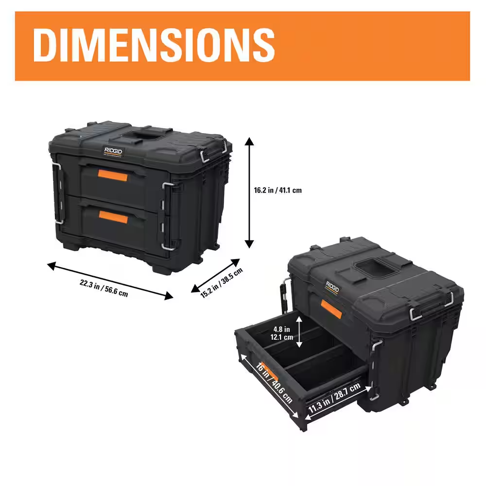 Fast Shipping On All Items 30 Days Money Guarantee Customer Support Excellent Service 100% Satisfaction Satisfaction Guaranteed 2.0 Pro Gear System 22 In. XL 2 Drawers Modular Tool Box Storage Specification Color Family Black Color/Finish Black Features Deep Drawer,Handles,Lockable,Secure Open Lid,Wall Mountable,Water Resistant,Weatherproof Holding Capacity (cu in) 5000 cu in Hub Required No hub connection available Included Accessories Drawer Dividers Material Resin Modular Storage Type 2 Drawer Tool Box Modular System Type Pro Gear Product Weight (lb) 22.49 lb Returnable 90-Day Tool Box Type Modular Tool Box Tool Storage Product Type Modular Tool Box Tools Product Type Tool Storage Weight Capacity (lb) 100 lb Maximum Handle Length (in) 3 in Product Depth (in) 15.2 in Product Height (in) 16.2 in Product Width (in) 22.3 in 22.3 inches x 15.2 inches x 16.2 inches. Weight: 22.49 lb Item Description Features 2 deep drawers to store large and small-sized tools Made of high-impact resin to ensure durable use Padded handle offers a comfortable carrying experience The RIDGID 22 in. Pro Gear 2.0 XL 2 Drawer is made with high-impact resin for long-lasting performance. This Tool organizer is the most versatile and durable toolbox for any job site or worksite. This unique design offers 2 deep drawers to store large and small-sized tools with maximum ease and convenience. This RIDGID's Pro Gear 2.0 Tool box is a half-footprint connectivity with metal ball-bearing drawer slides and padlock eyelet for security. Each drawer is front-lockable for easy access and safe transport. Dividers are included to allow internal organization and storage of small parts and clear division in the drawers, for fast search and organization. The XL drawer toolbox is also compatible with the 2.0 cart for a quick Attach-and-Detach from the 9 in. wheels. You can be mobile and have the convenience of taking the drawer you need without unmounting the unit. This toolbox allows you to create an organized and functional workspace with its hanging drawers - Fix- and- Go mechanism. The XL drawer can be a base unit in the Pro Gear modular mobile system or create a full stack of unlimited access. The Pro Gear XL 2 Drawer is fully compatible with RIDGID's Pro Gear System 2.0 and 1.0 products, customized storage solutions for easy transportation, organization and more accessibility. About us We offer the best prices around on high quality products. Our E-store includes media such as books, movies, music and games while offering electronics, toys, sporting apparel, clothing, tools, general home, garden items and more. Shipping We are always working hard to ensure your package arrives as soon as possible. Please understand that some factors like weather, high postal traffic, and the performance of shipping companies are outside of our control. We offer free shipping to the lower 48 states and ship within 2-3 business days of payment, usually sooner. We do not accept P.O. Boxes. Please provide a physical address. For shipping outside of the continental USA, we only use eBay's Global Shipping Program.The item is shipped to KY and then sent to the rest of the world. International customers are responsible for all duties and taxes. Continue to check out to calculate costs for shipping the item to your country. Messages regarding eBay's Global Shipping Program MUST be directed at eBay EXCLUSIVELY. Returns We offer a 30-Day Return Policy on items in which you are not completely satisfied with. You have the option of a full-refund or an exchange of the item. No returns are available on items shipped outside of the USA Satisfaction We try over very best to make sure every customer is completely satisfied. If there's a problem, message us! We're happy to help. Payment Options Shop With Confidence