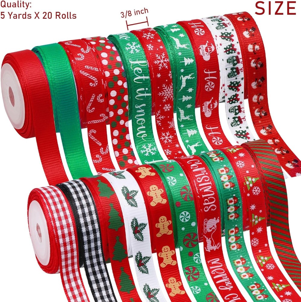 About this item Christmas theme ribbon:Our Christmas ribbon includes 20 Roll ribbons,featuring with classic Christmas theme elements,Vibrant red and green colors in rich Christmas designs,great for accenting your gifts and Christmas decor Size:Each Christmas Ribbon measures 3/8 inch in wide by 5 yards in length,100 yards long in total,enough ribbons to meet your holiday gift-wrapping and party-decorating needs Ideal for gift wrapping:great Christmas ribbon for gift wrapping, simply tie onto your gift boxes or bags,make gift-giving more festive with these funny holiday-themed Christmas ribbon Quality material:Our Christmas ribbon for crafts are made of quality polyester grosgrain, soft,durable,colorful printed and not easy to fade,adds color and texture to your Christmas presents for a pretty presentation Wide applications:Our 3/8 inch Christmas ribbon also can be used for crafts,sewing projects,hair bow,gift bow,party favors,decorating and more.The Christmas ribbon adds a finishing touch to gifts or crafts projects,adds a joyful atmosphere to Christmas › Color: Red Material: Polyester Product Dimensions: 180"L x 0.38"W Style: Classic Occasion: Christmas Pattern: Plaid, Snowflake Item Weight: 0.23 Kilograms Fabric Type: Polyester