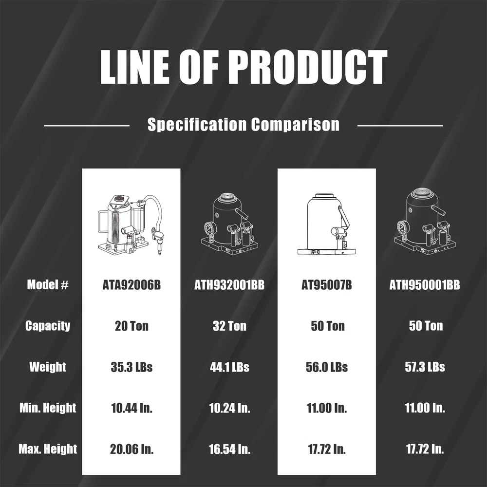 Torin 20 Ton (40,000 LBs) Capacity Pneumatic Air Hydraulic Heavy Duty Bottle Jack with Manual Pump for Trucks, ATA92006B , Black Air hydraulic bottle jack is ideal for lifting heavy-duty machinery, industrial construction equipment, farm vehicles, and more; Wide, rugged base adds stability and strength Features a lifting range between 10-7/16" to 20-1/16" with a 20 ton (40,000 lb) load capacity; Designed for operating either manually or pneumatically Automatic dual spring controlled lowering system; Fully polished and chromed cylinder rams enhanced with high-performance seals Has an air pressure range of 100 to 175 PSI; Push-button trigger control increases speed and efficiency, reducing lift time Fitted with safety valve to prevent overloading; Includes a limited 1 year manufacturer The Torin ATA92006B air hydraulic bottle jack is ideal for lifting heavy-duty machinery, industrial construction equipment, farm vehicles, and more. Constructed of heavy-duty steel, it's designed for operating either manually or pneumatically. It features a lifting range between 10-7/16" to 20-1/16" with a 20 ton (40,000 lb) load capacity. Has an air pressure range of 100 to 175 PSI (note: a minimum of 110 PSI air pressure is required to raise rated capacity load). Equipped with an automatic dual spring controlled lowering system, fully polished and chromed cylinder rams enhanced with high-performance seals, and a push-button trigger control which increases speed and efficiency, reducing lift time. The air hydraulic bottle jack is also fitted with safety valve to prevent overloading. Welded handle grip makes this bottle jack easy to move and position. Manufactured with precision for quality and performance. Meets ASME PASE standards. Includes a limited 1 year manufacturer. SHIPPING - We offer FREE shipping on all orders! - We ship within 3 business days of payment, usually sooner - We use a selection of shipping services such as UPS, FedEx, USPS etc - We only ship to the lower 48 states, no APO/FPO addresses or PO Boxes allowed International buyers – please note: Import duties, taxes, and charges aren't included in the item price or postage cost. These charges are the buyer's responsibility. - Please check with your country's customs office to determine what these additional costs will be prior to bidding or buying. - We have confidence in our products, but if you are not fully satisfied please contact us within 30 days of purchase and you will get full refund. * Order Cancellation Policy ** You can return a product for up to 30 days from the date you purchased it. 1. The seller reserves the right to cancel the special case only due to eBay cancellation fee. 2. The decision of seller is the final. 3. The seller will respond to the cancellation request within 2 business days. Please wait for the result of cancellation. 4. In case the cancellation is not completed by some reasons, the buyer can follow the options below to get the refund. 4.1 The buyer can reject the item when it arrives. 4.2 The buyer can send the item back to the seller within 30 days If the buyer receives item (USA Shipment ONLY). The seller will provide the FREE return label to the buyer when the buyer opens " Return Item" case on eBay by using the reason as "Change my mind" ONLY. 5. When buyer has placed the order. The order will be processed and completed by automatic warehouse system within 5 minutes. In case that buyer sends the cancellation request after 5 minutes of placing the order, the request will be rejected. **Sending direct message to cancel the order is not allowed for every case.* Return Policy For the return case - If buyer would like to return the items for refund or replacement, please CONTACT SELLER to receive the free return label from seller. The refund or replacement will be processed with the tracking number of return label which is provided by seller only. The other ways of return which are not approved by seller will not be processed for the refund or replacement. CUSTOMER SERVICE - We try our best to make sure every customer is completely satisfied. - If there's a problem, feel free to message us! - We're happy to help.