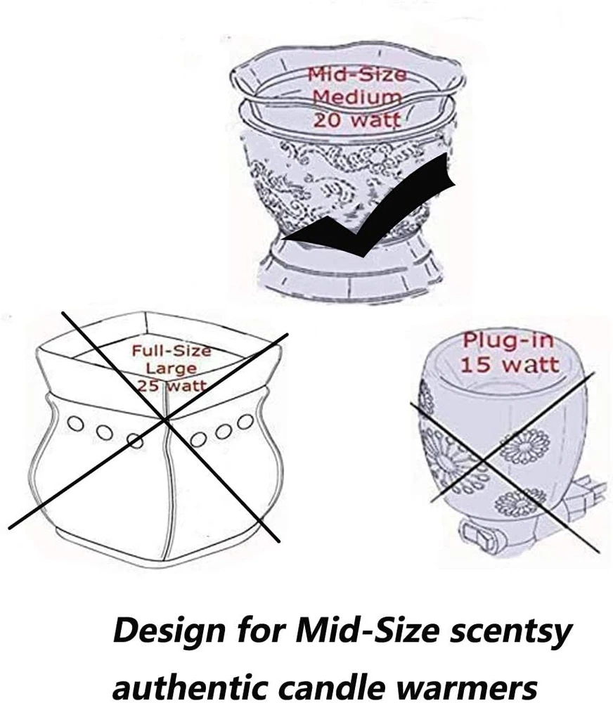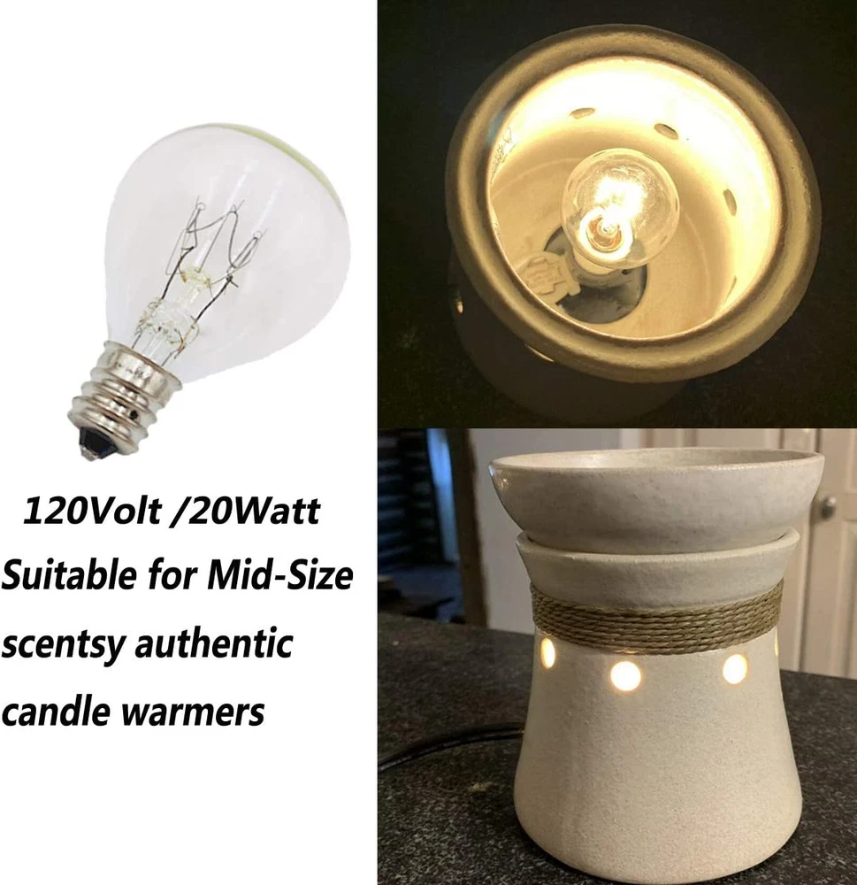 120V / 20 Watt / E12 Candelabra Base / Clear Glass Bulb for use in Scentsy Mid-Size Warmer. Designed to melt scented candle wax without over heating or under heating scented candle wax,effectively melts scented wax, essential oils or diffuser blends. These home fragrance bulbs have been designed to fit a variety of household lighting displays & wax warmers. Use them to replace bulbs in Scentsy plug-in nightlight warmers or salt lamps. Dimmable wax warmers bulbs ,Voltage: 120 V,Power: 20 W,Extra Long Life 2000+ hours. Purchase With Confidence : Snnalosses is committed to providing our customers with high quality products, we are dedicated to ensuring your fully satisfaction. Our friendly and reliable customer service will respond to you within 24 hours. You can purchase with confidence, with our 90-day return and 12-month replacement. Product Description 20 Watt Bulbs for Middle Size Scentsy Warmers,E12 Incandescent Candelabra Base Clear Light Bulbs for Candle Wax Warmer Product Specifications: Condition: Brand new Watt:20 Watt Input Voltage: 110V-130V Base: E12 Base Luminous: 160 Lemens Color Temperature: 2700K (warm white) Dimmable:Yes Lifespan: 2,000 hours Product Features: 1. 20 Watt Bulb suitable for MID-SIZE scented candle warmers. 2. Easy to install, simple to replace, convenient to use. 3. Shock and vibration resistant construction for ensuring a long life. 4.Dimmable incandescent light bulb, convenient for your daily life. 5. Incandescent bulb can release heat and melt the candle wax. 6. It also can be used for striping lights,ceiling bulbs,decorative lighting fixtures. Package Included: 6 X 20 Watt Wax Warmer Bulbs Safe package: Each bulb has been inserted into it's own compartment to prevent cracking.